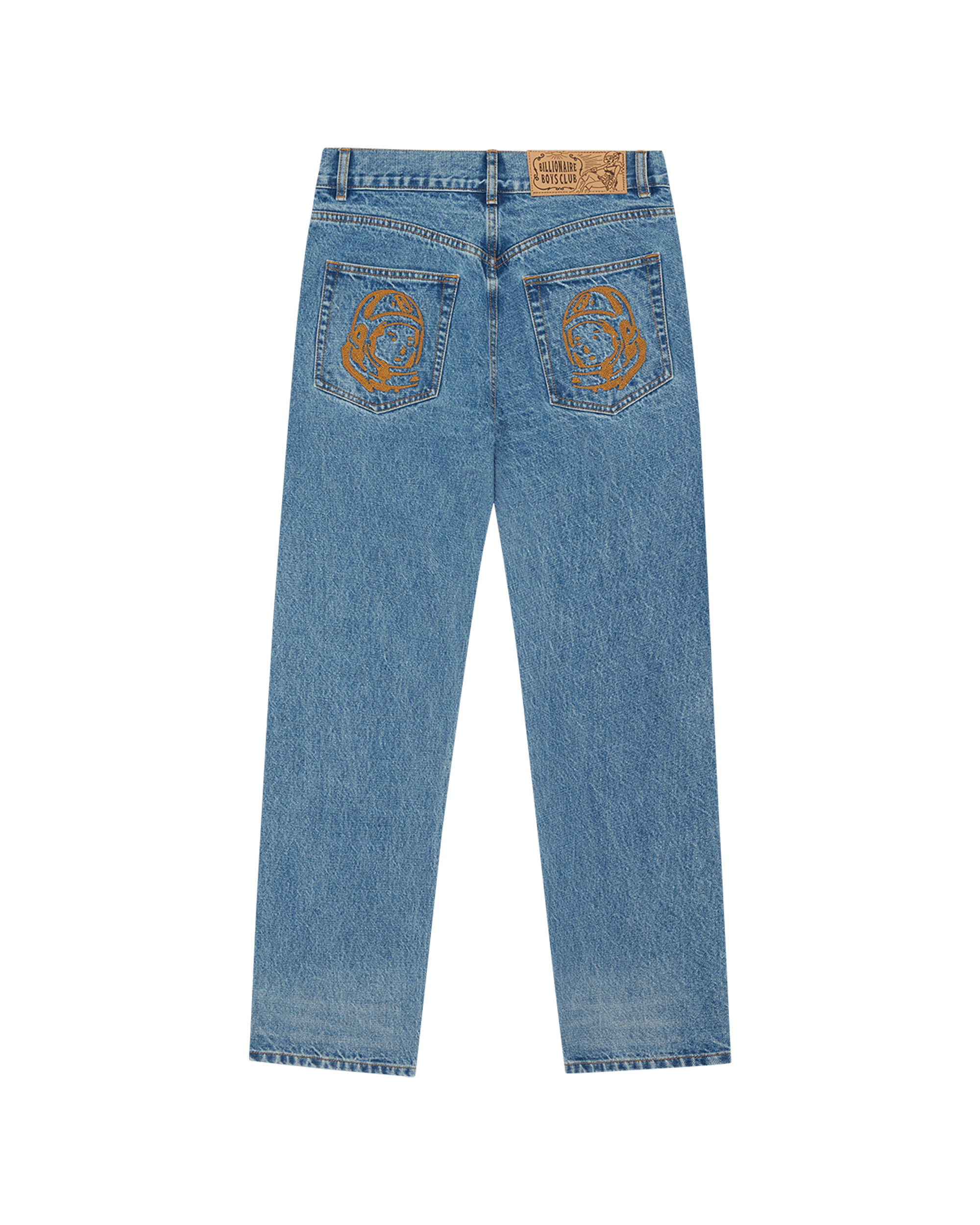 Astro Denim Pant presenting the Astro helmets embroidered at back pockets and the dollar sign at coin pocket.