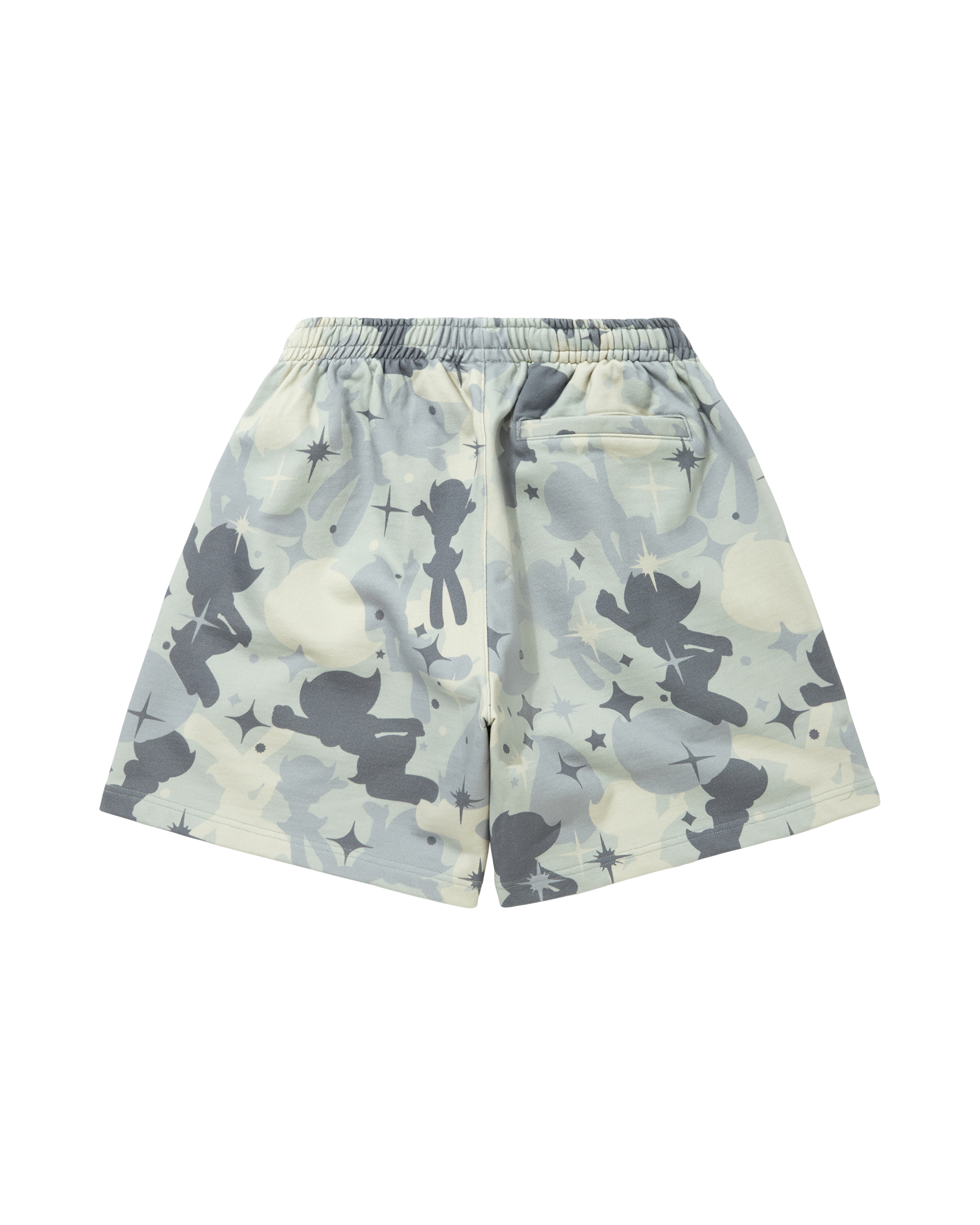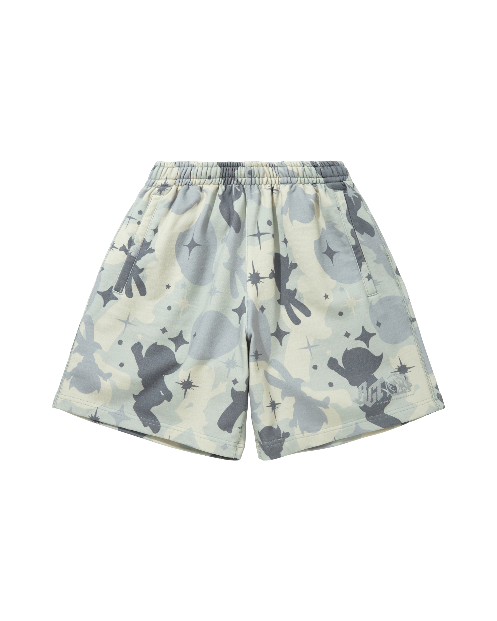 Billionaire Girls Club x Astro Girl shorts with all-over camo print. Features grayscale color palette. star and character motifs.
