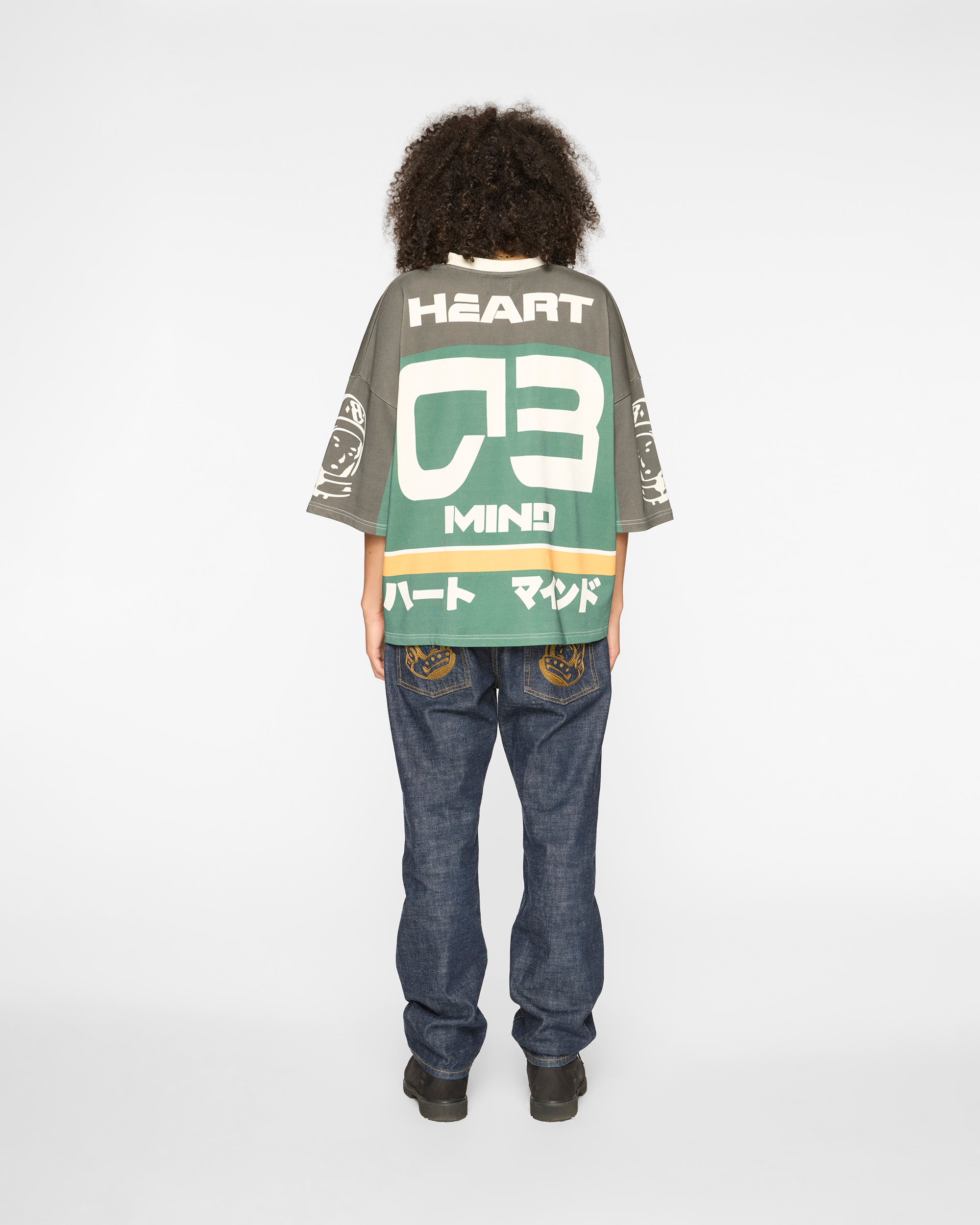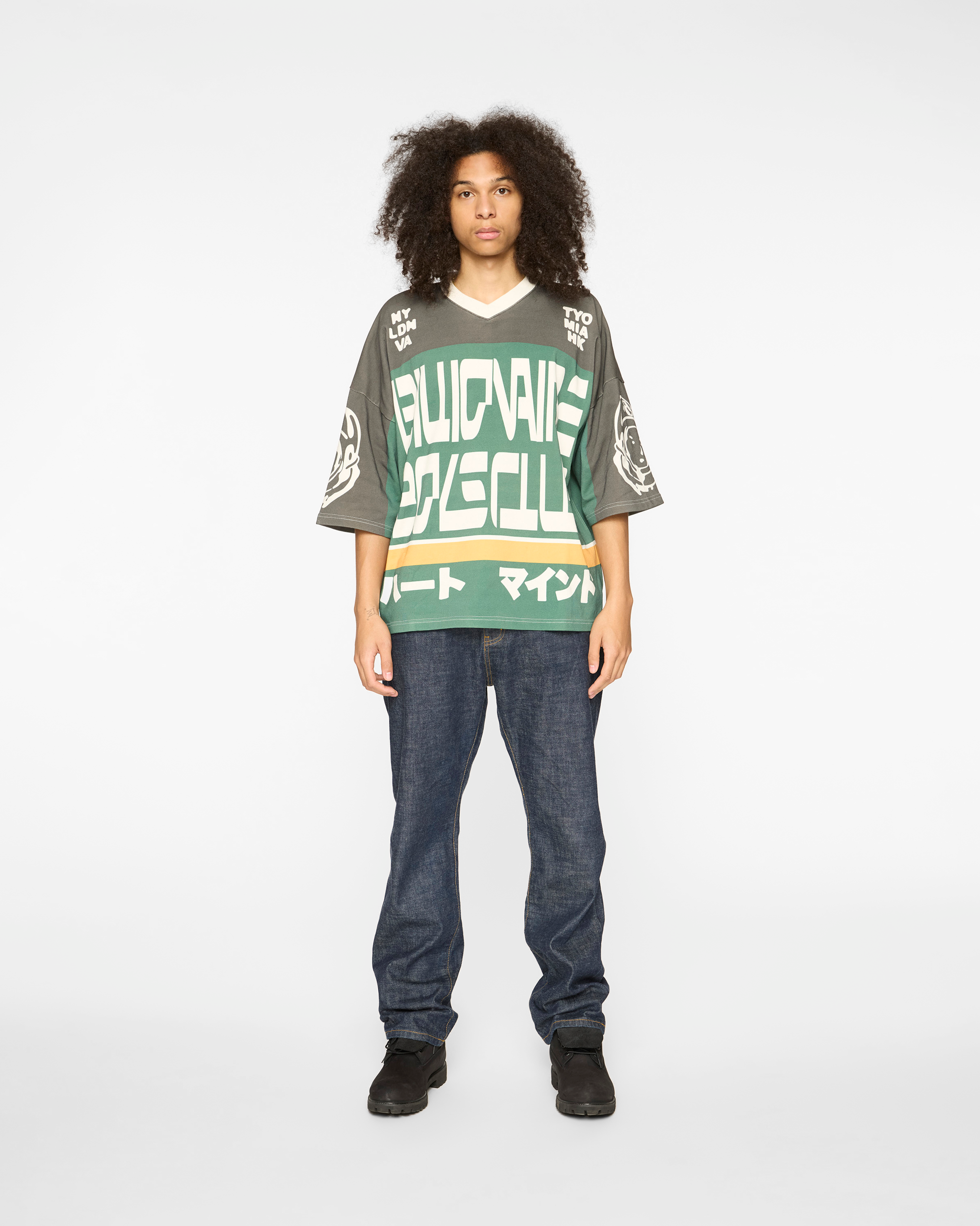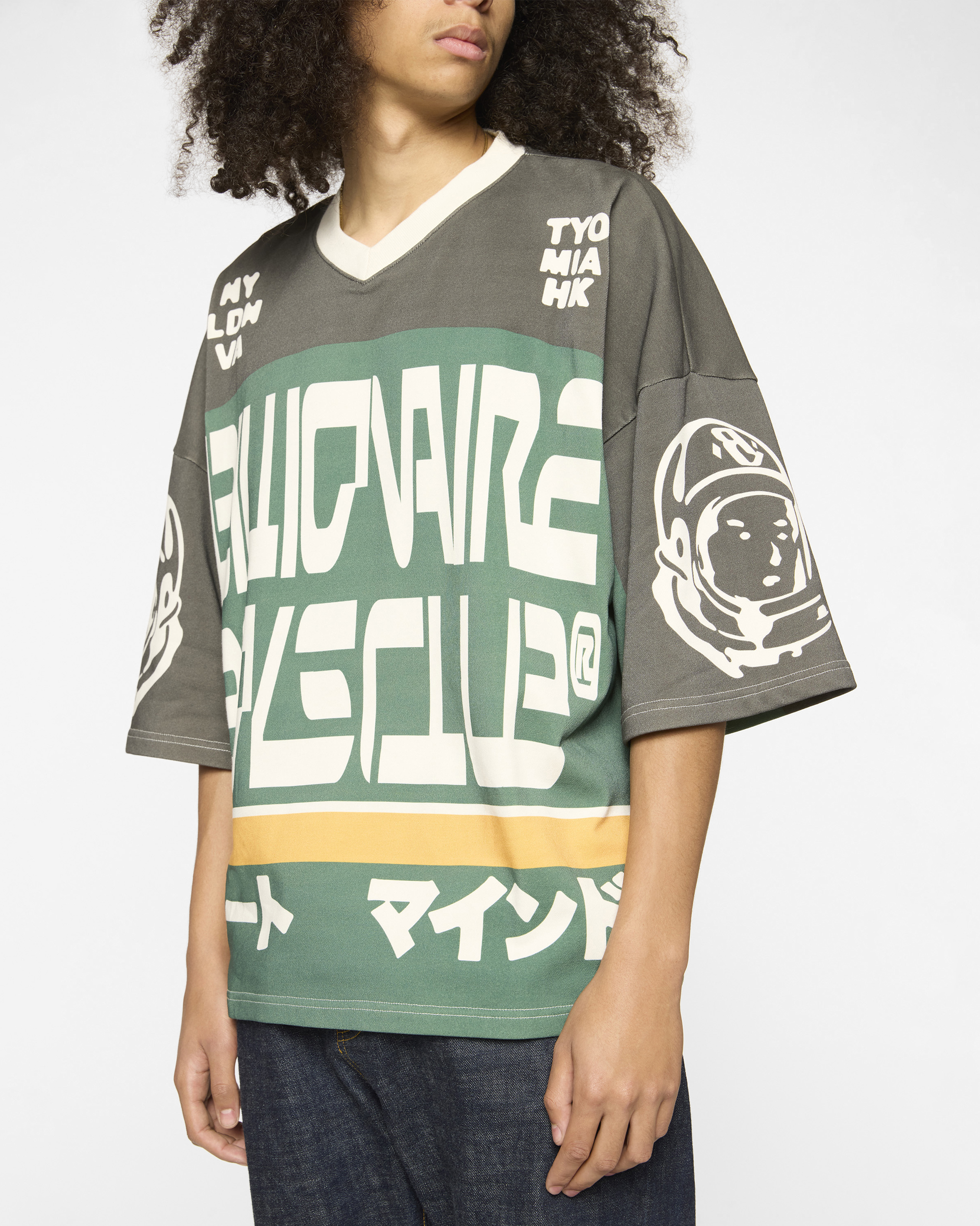 The Blitz Tee features Billionaire Boys Club typography on the front and city codes at the shoulders. Back displays Heart & Mind messaging. CB graphic. and Japanese characters with stripe details. Astronaut graphics on both sleeves.