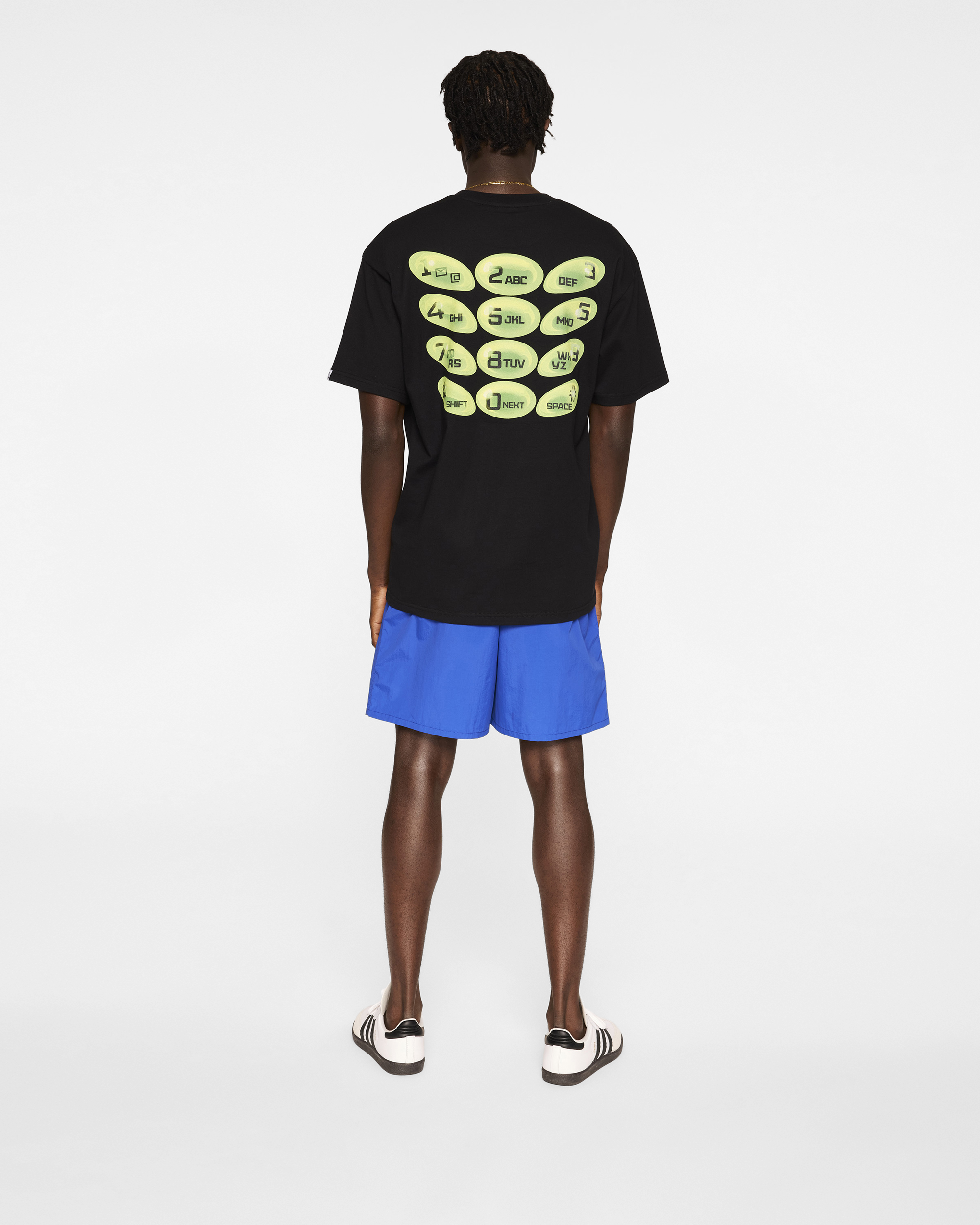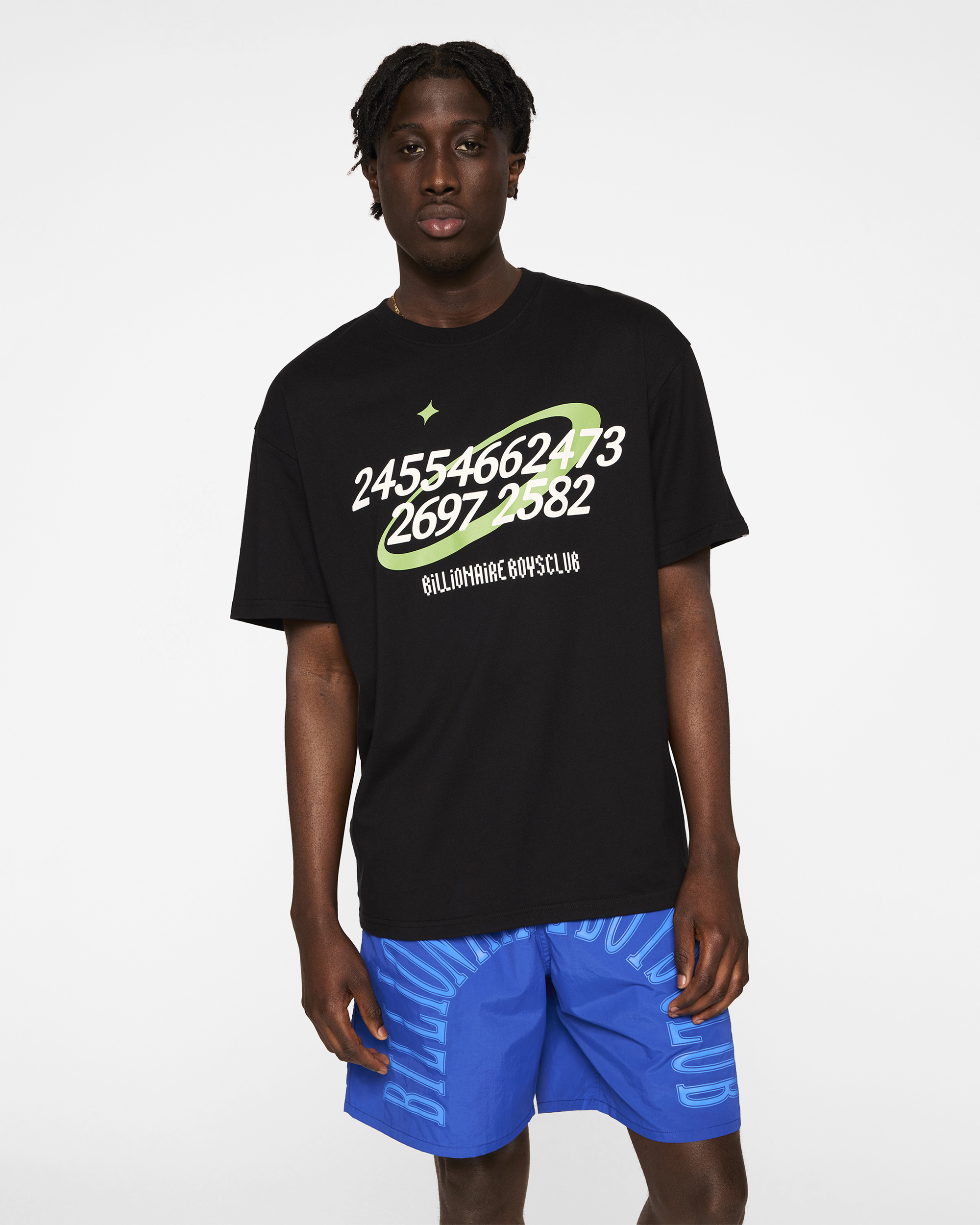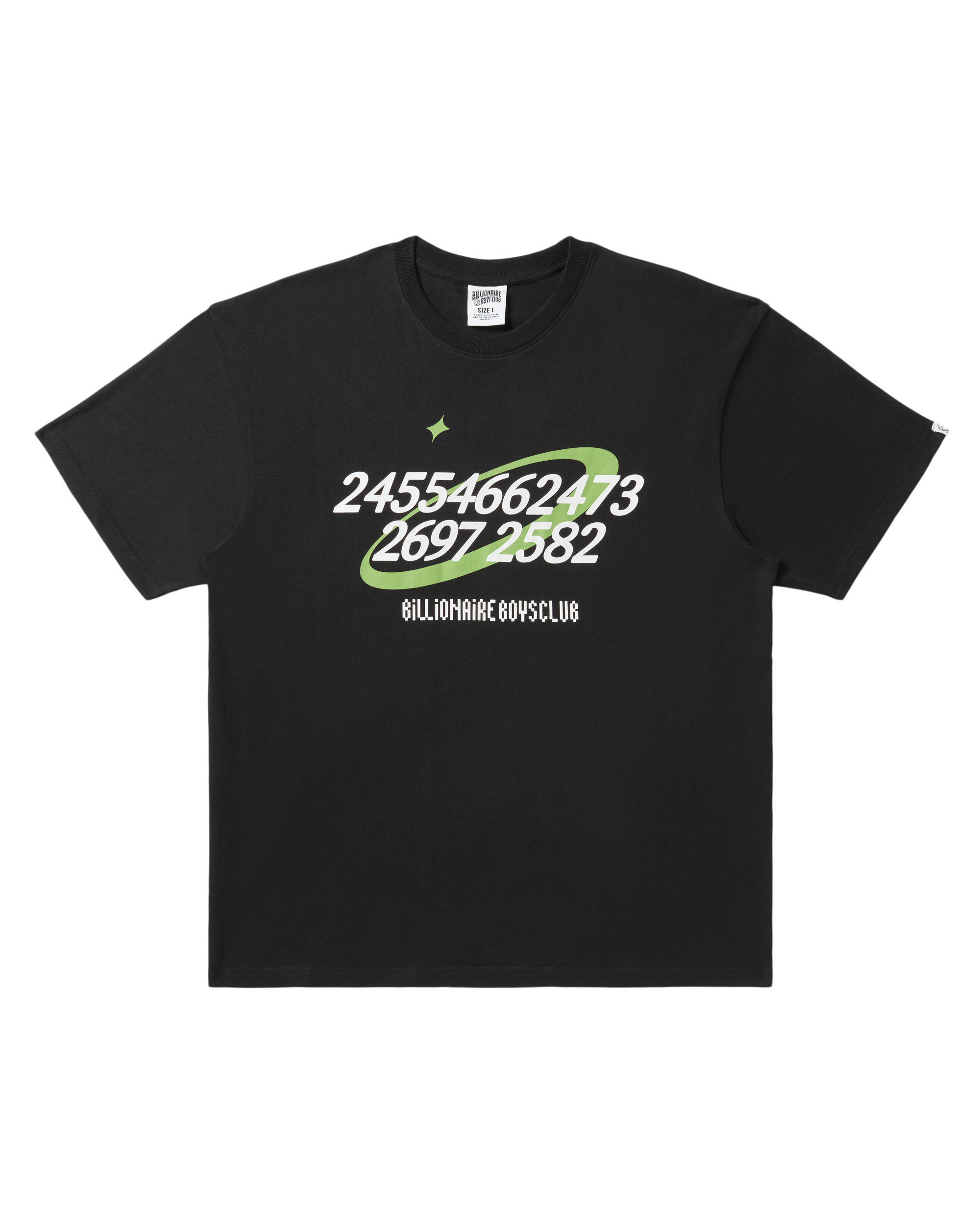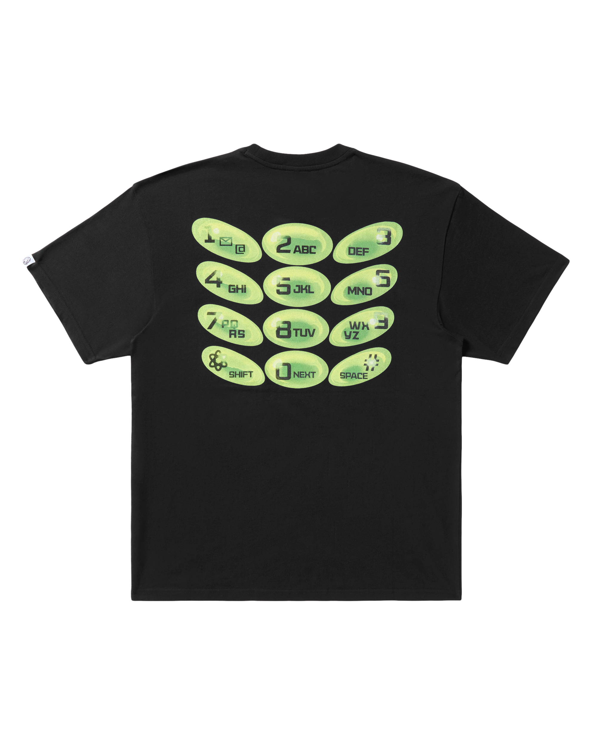 The call me tee features oversized. neon-green keypad buttons on the back and a numeric code across a saturn-like ring on the front.