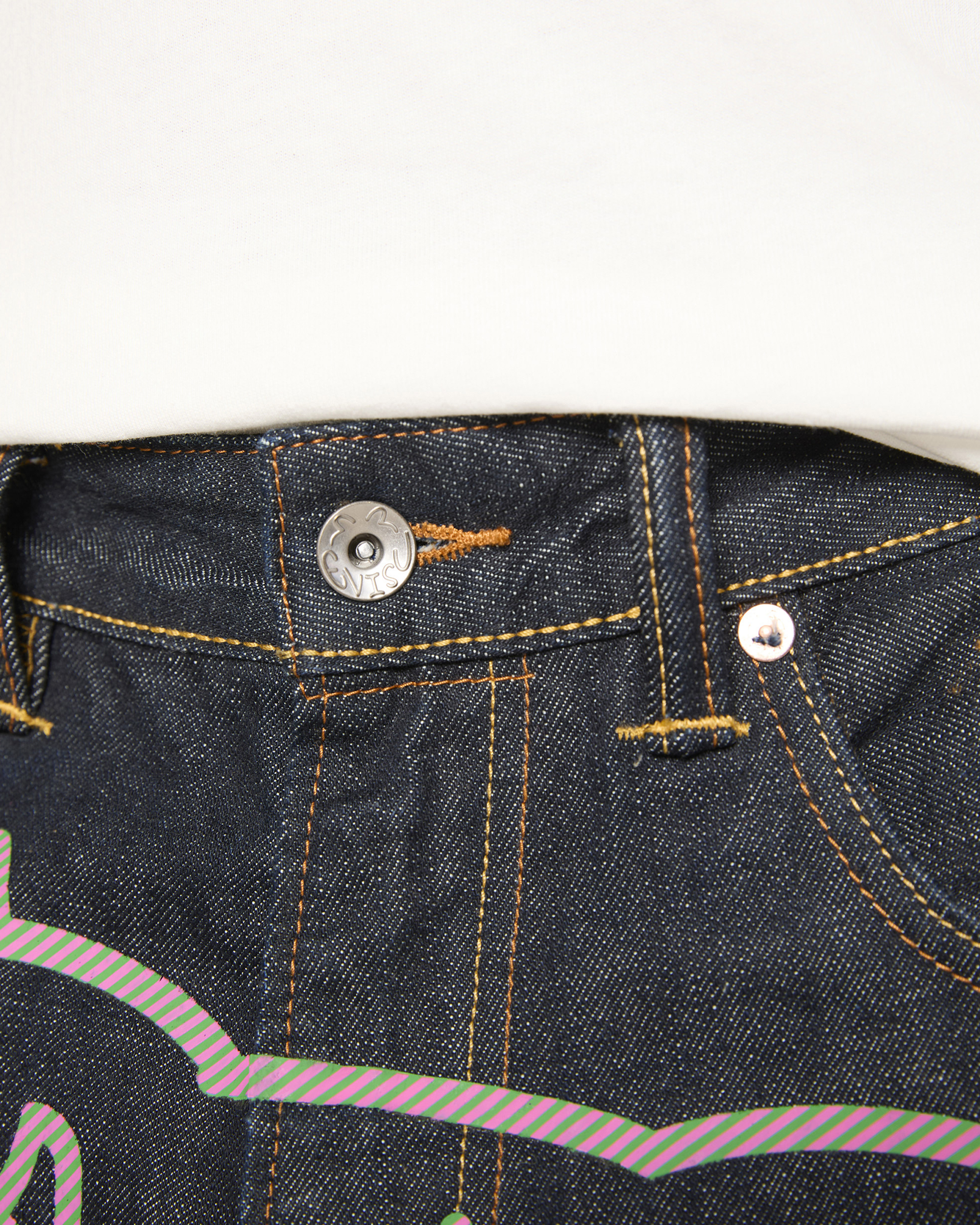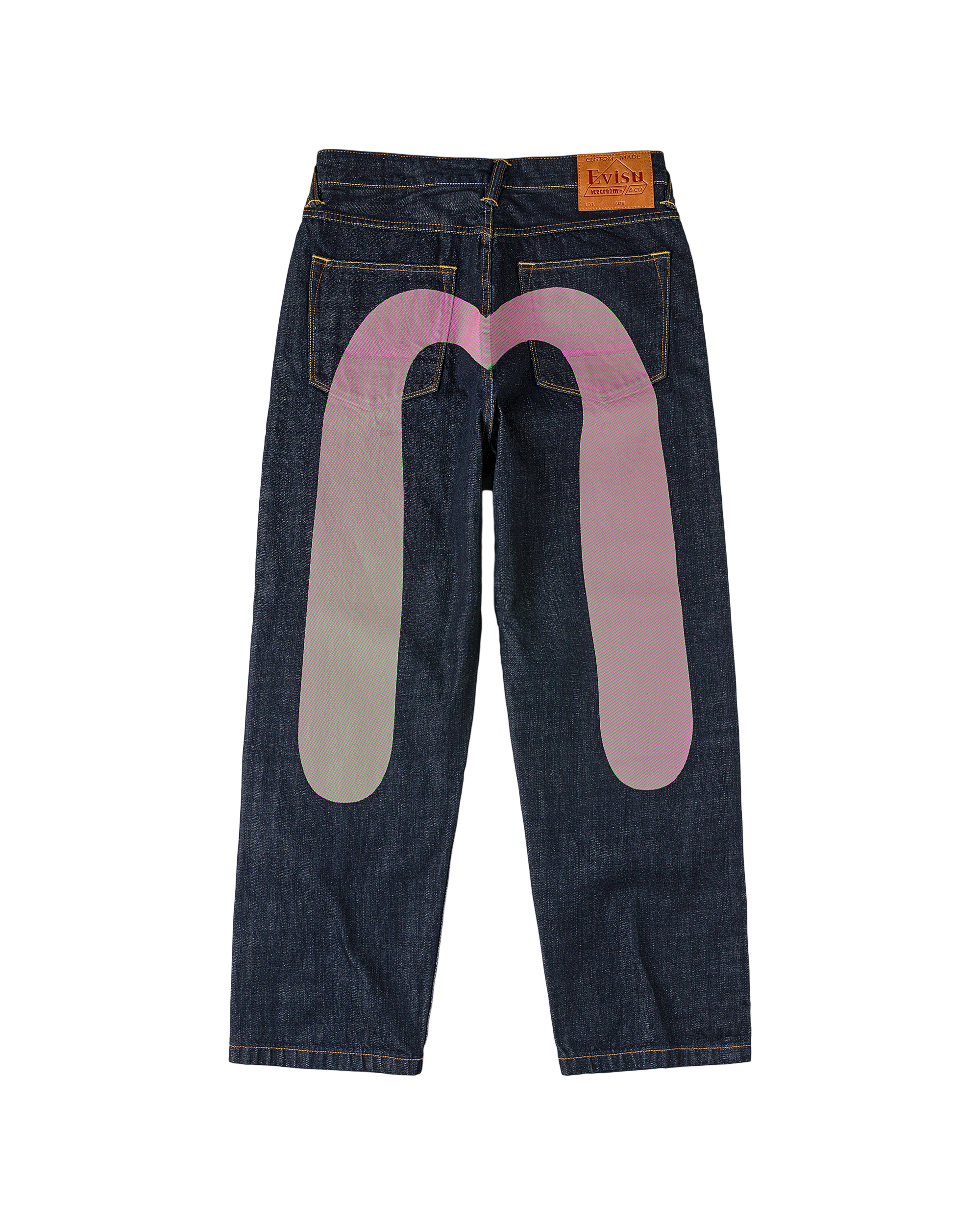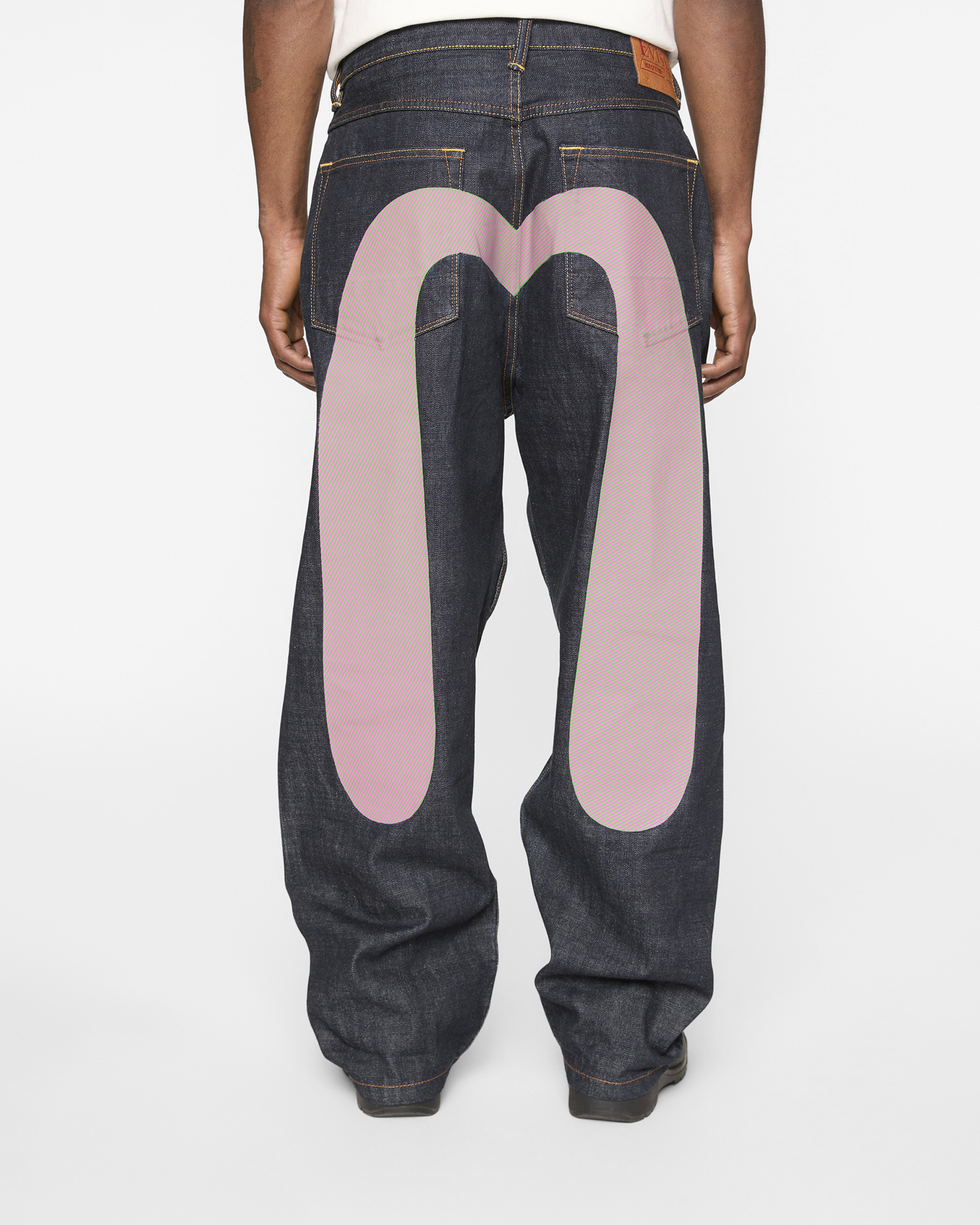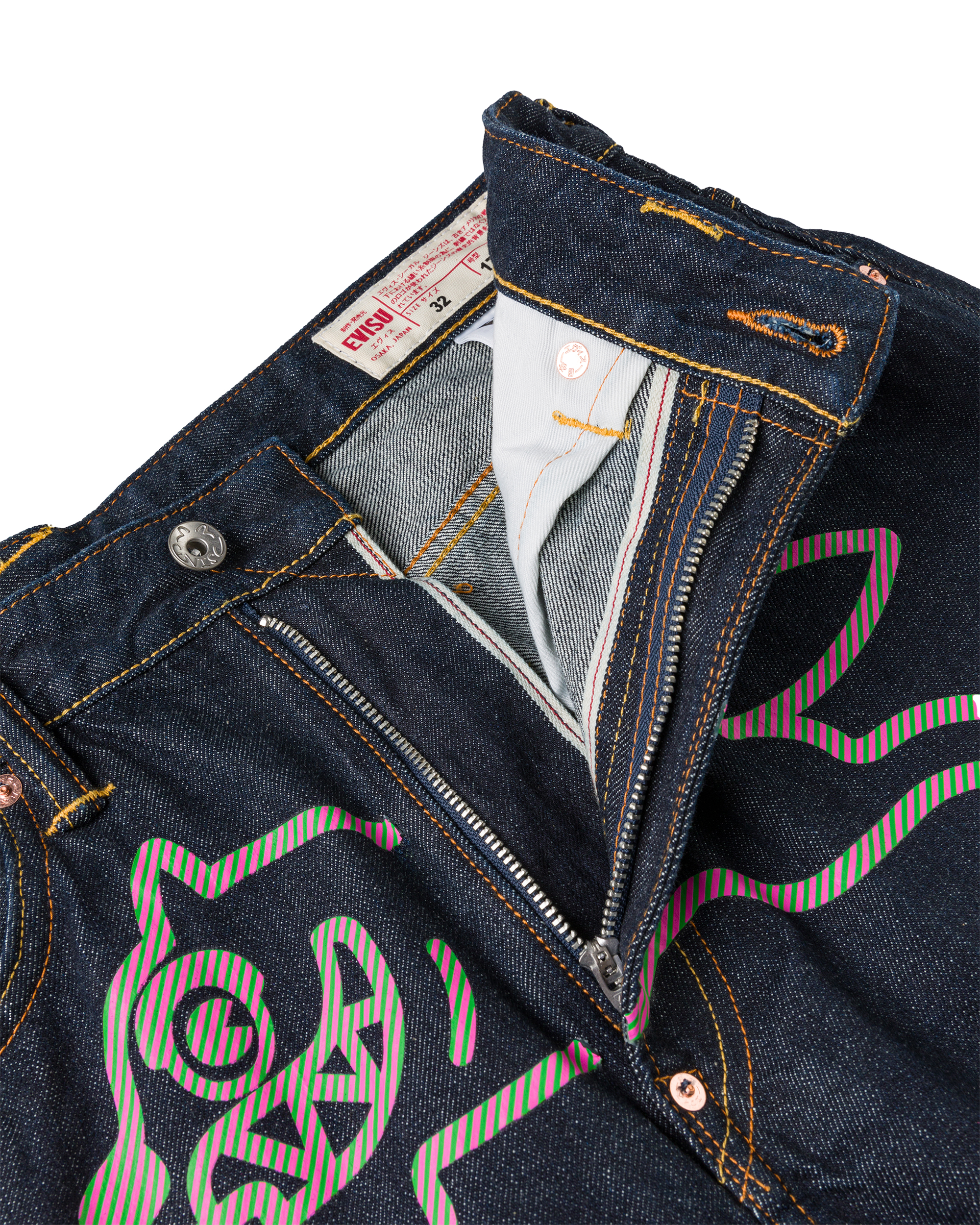 Premium selvedge denim with custom pink and green hickory stripe print Running Dog and Evisu Daicoc print across the back. blending statement graphics with everyday wearability. Crafted from 100% cotton in a loose fit for a relaxed. street-inspired silhouette.