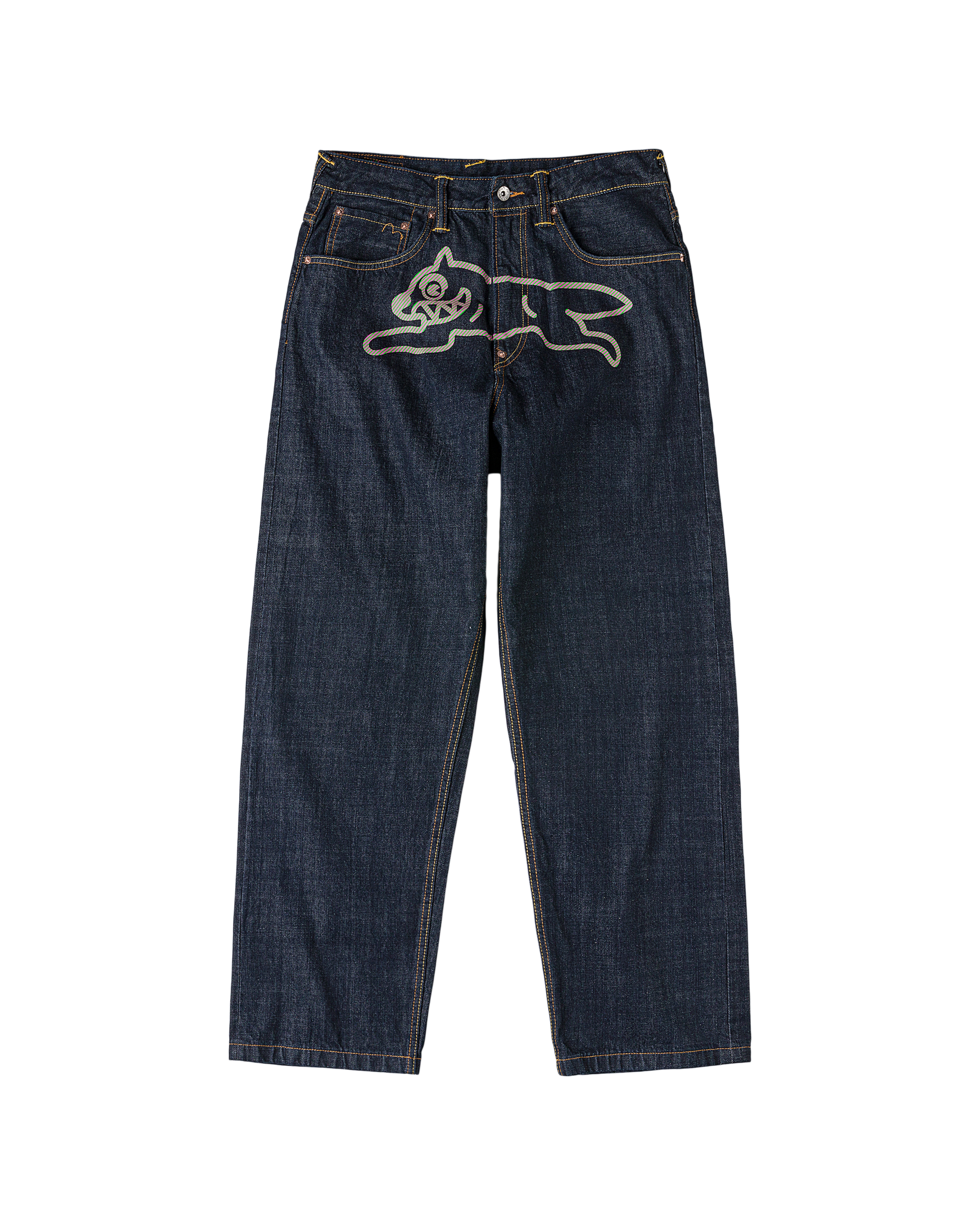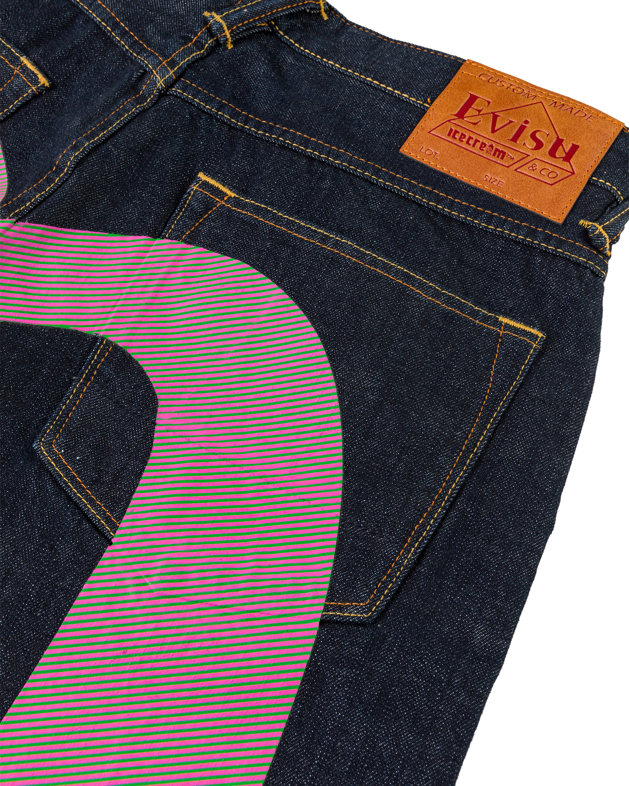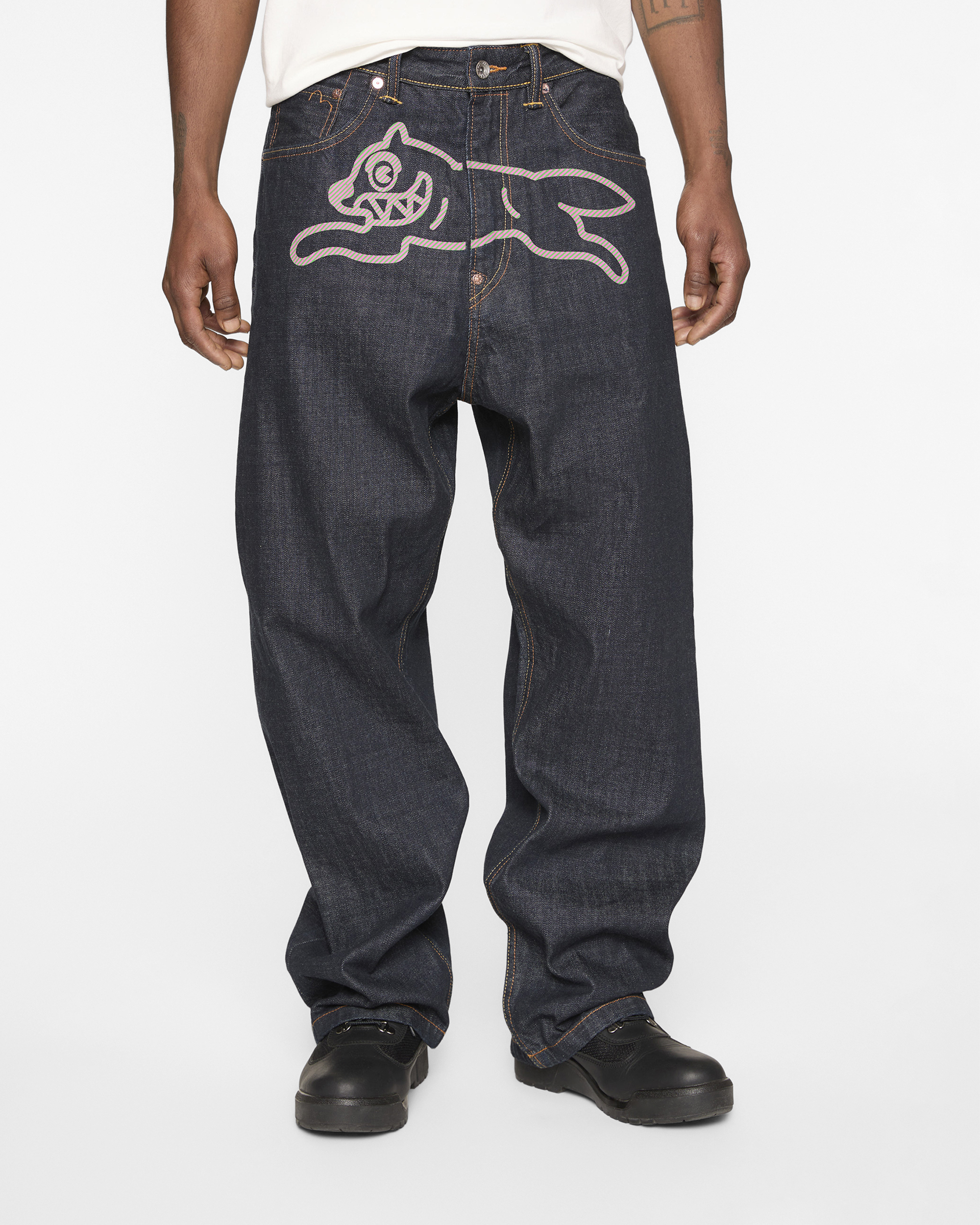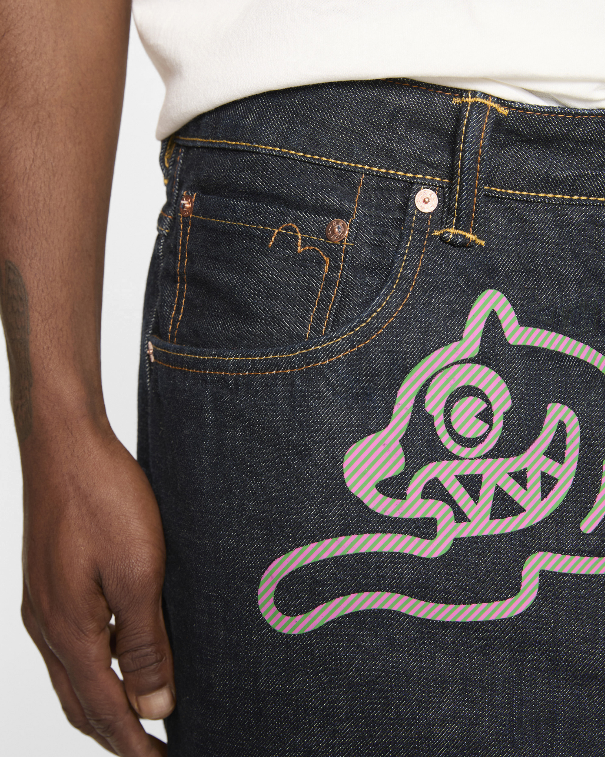 Premium selvedge denim with custom pink and green hickory stripe print Running Dog and Evisu Daicoc print across the back. blending statement graphics with everyday wearability. Crafted from 100% cotton in a loose fit for a relaxed. street-inspired silhouette.