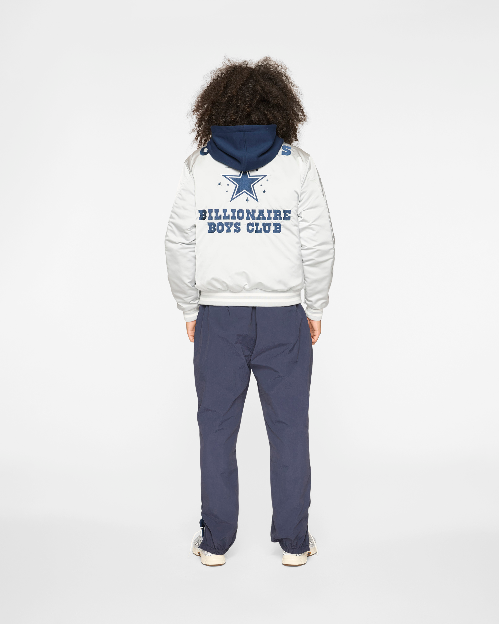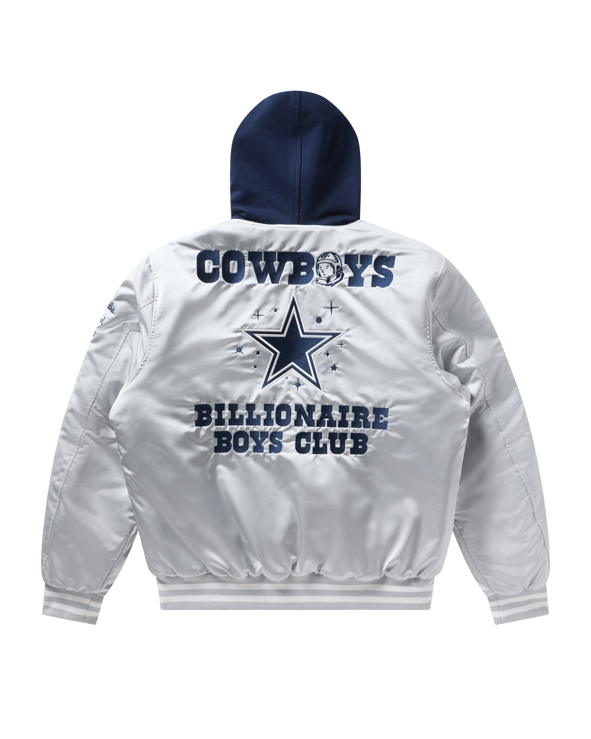 Dallas Cowboys Satin Jacket with snap closure. ribbed cuffs. and drawstring hood. Features embroidered Cowboys logo on front. championship years along sleeves. and the Cowboys x Billionaire Boys Club graphic on back.