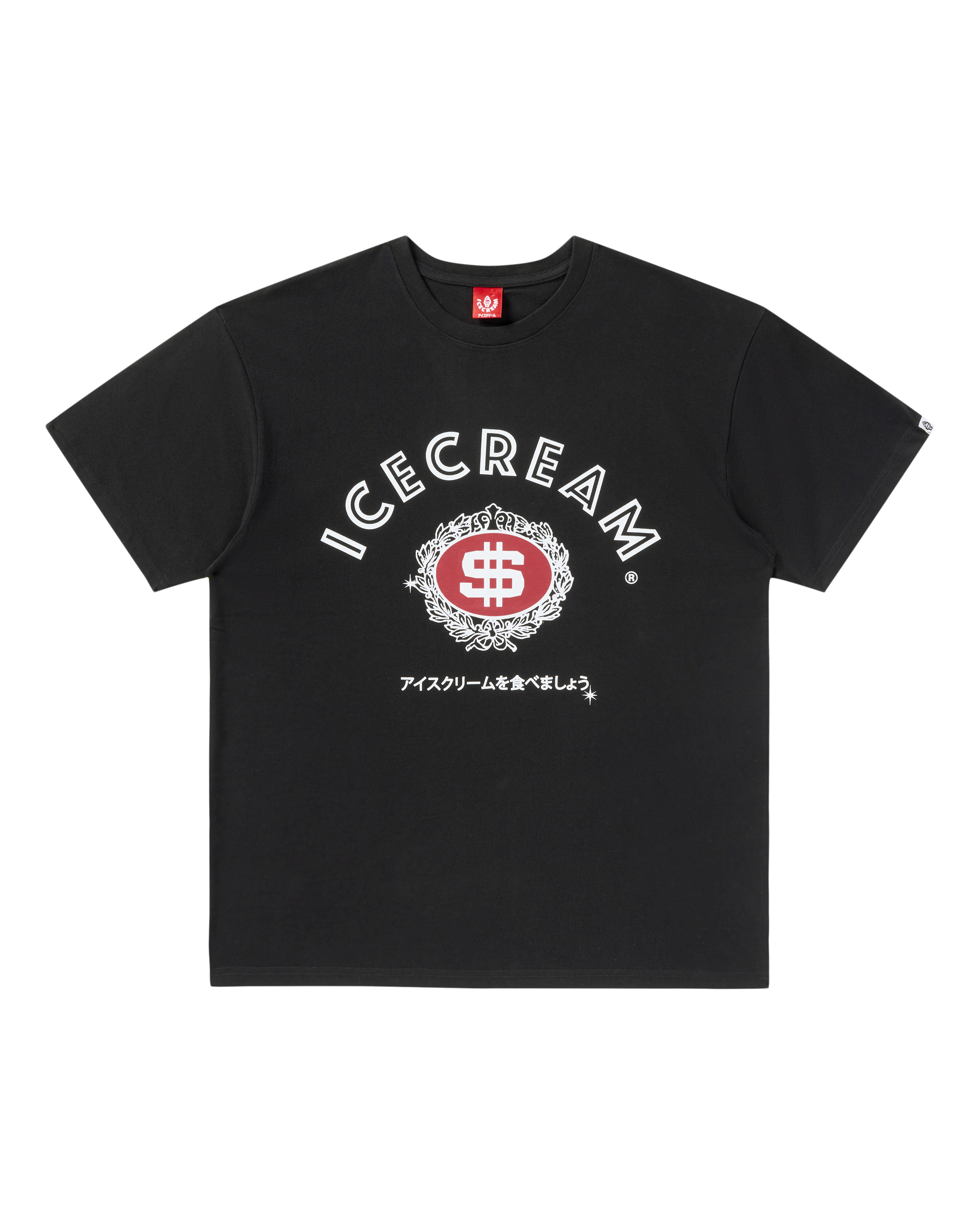 The Dollar SS TeeĀ features an Icecream logo and a red crest emblem with a bold dollar symbol at its center.