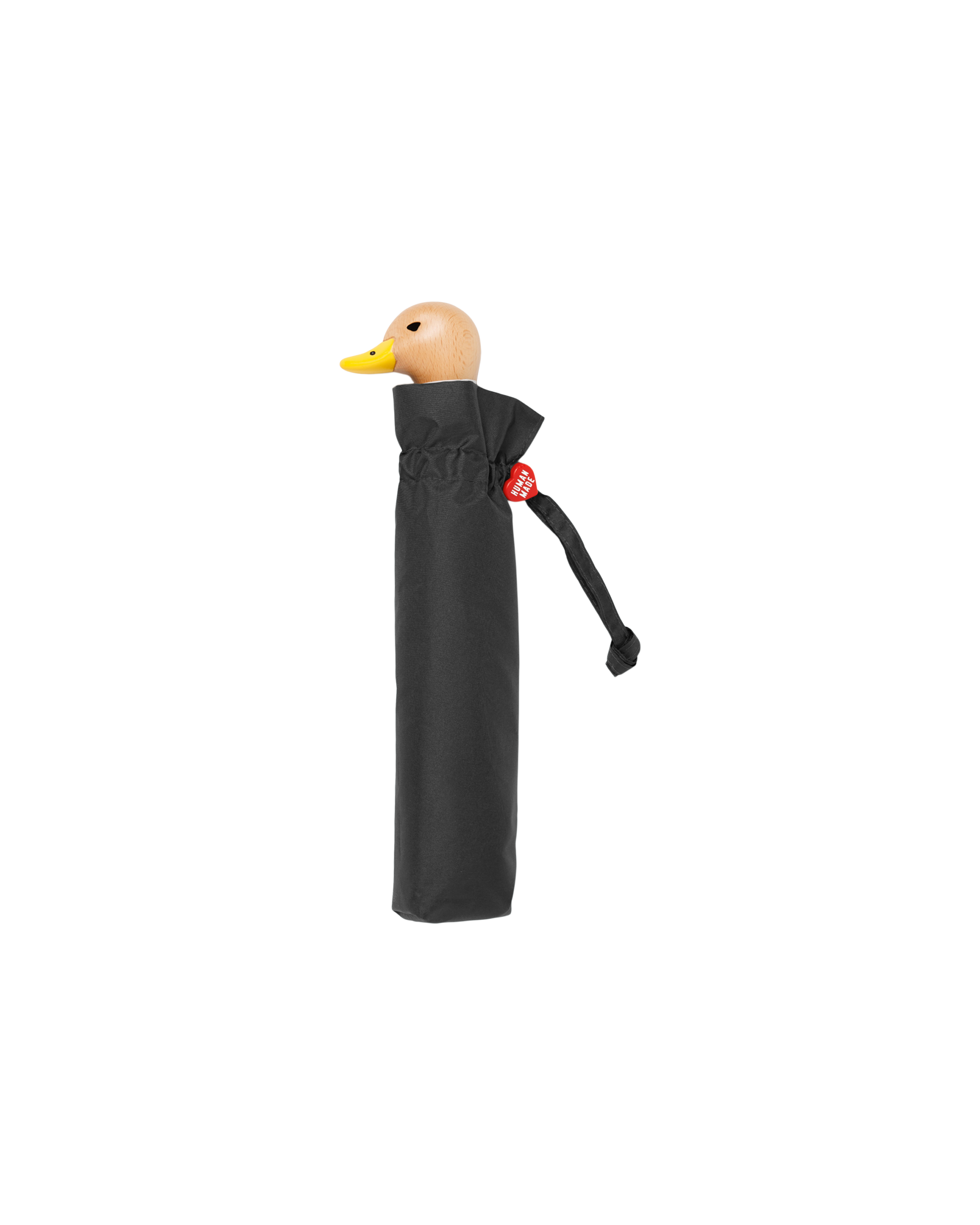 Distinctive folding umbrella with an iconic duck handle featuring a Wooden duck-shaped handle.