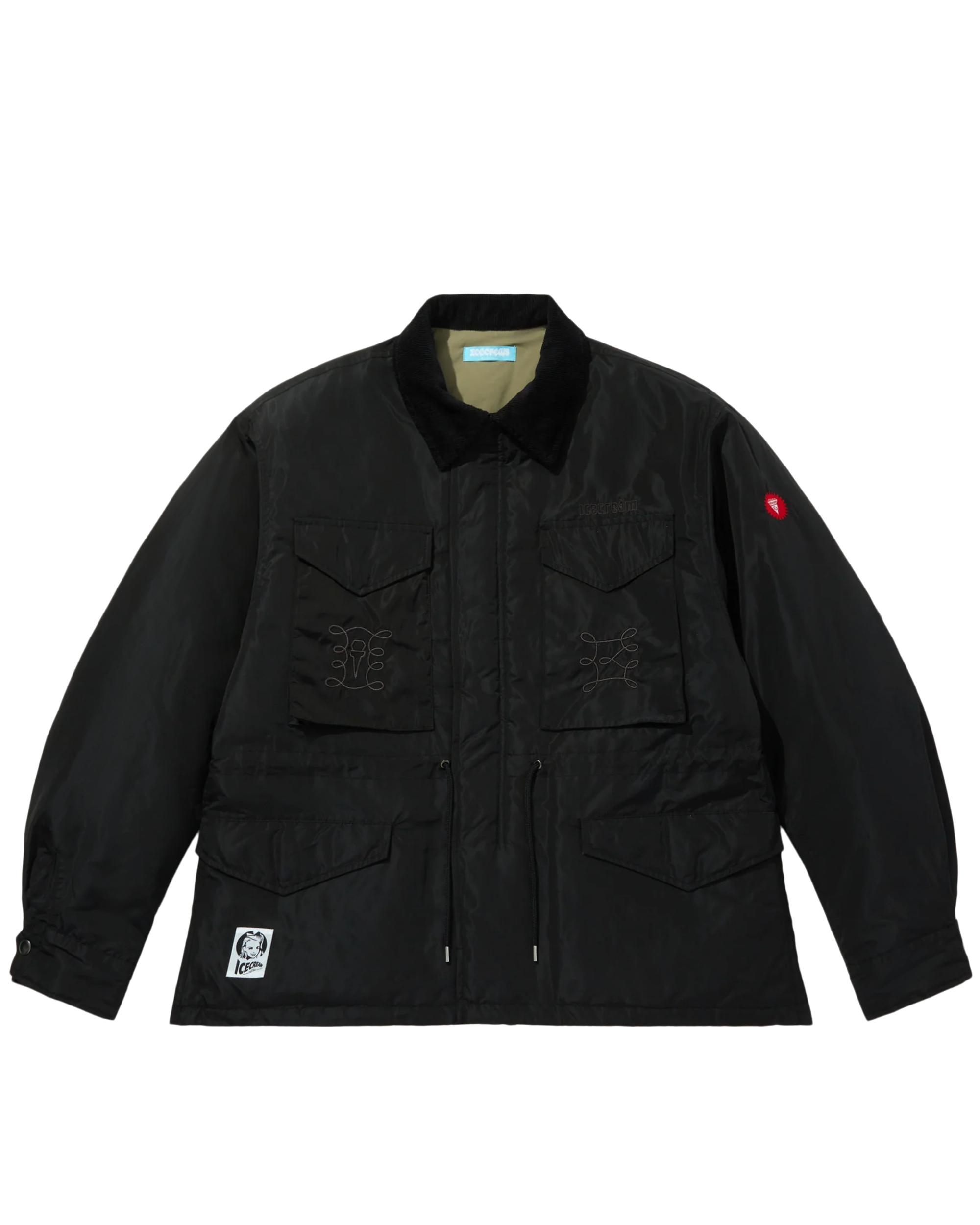 Lightweight military-inspired jacket featuring Icecream’s iconic embroidered logo on the chest and pockets. Made from glossy nylon with a cozy boa collar and four functional front pockets. Heart logo patch on sleeve and brand patch on hem.