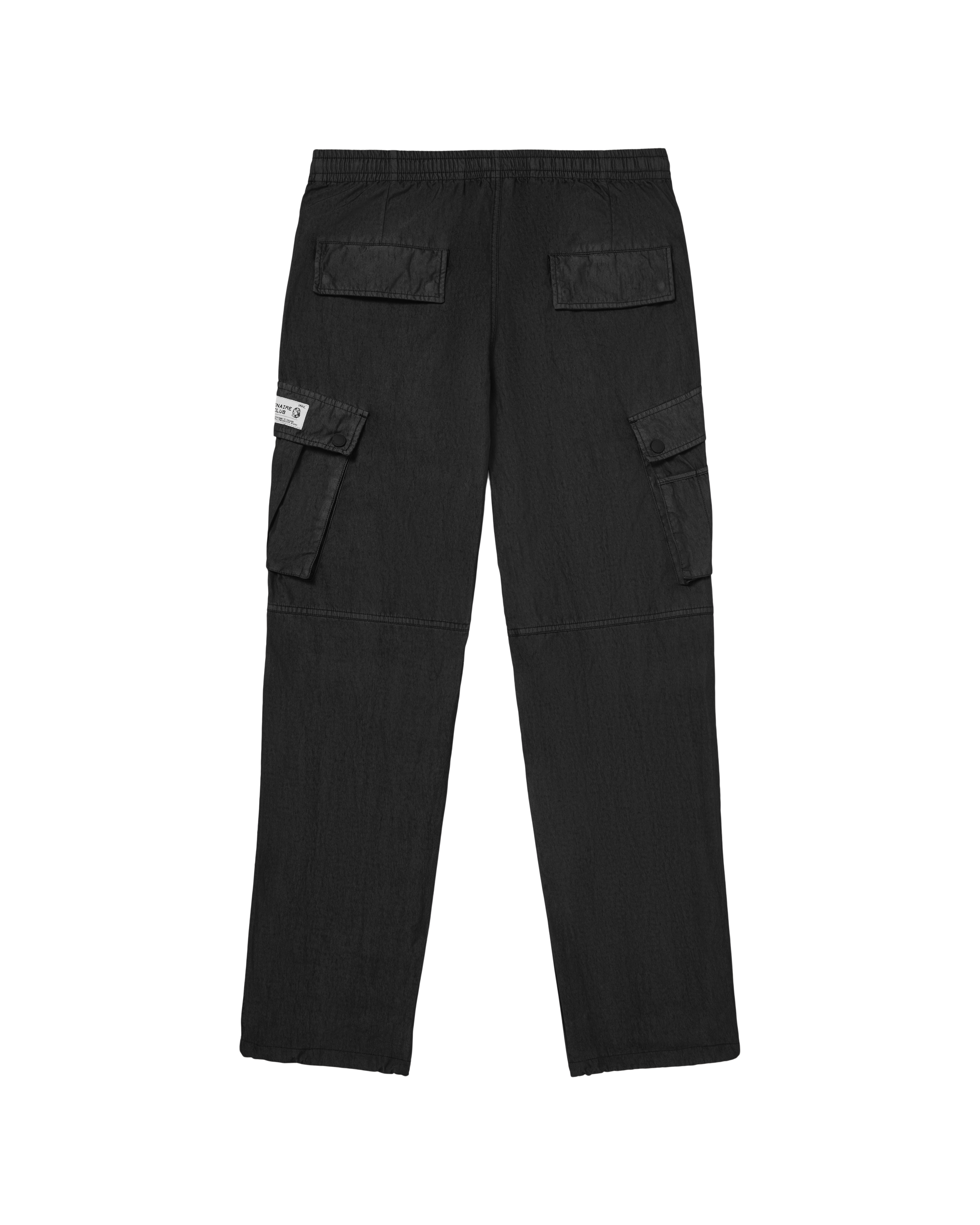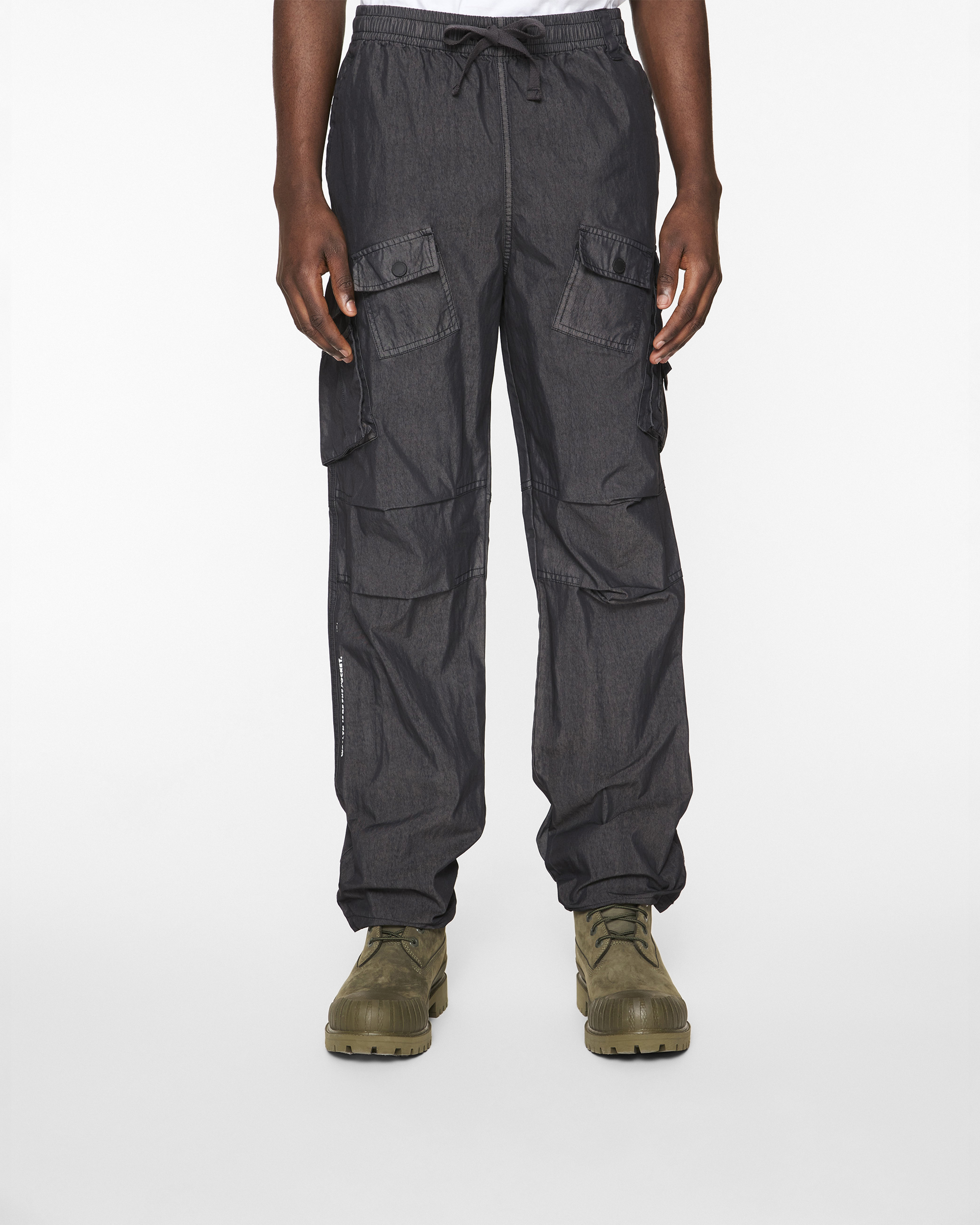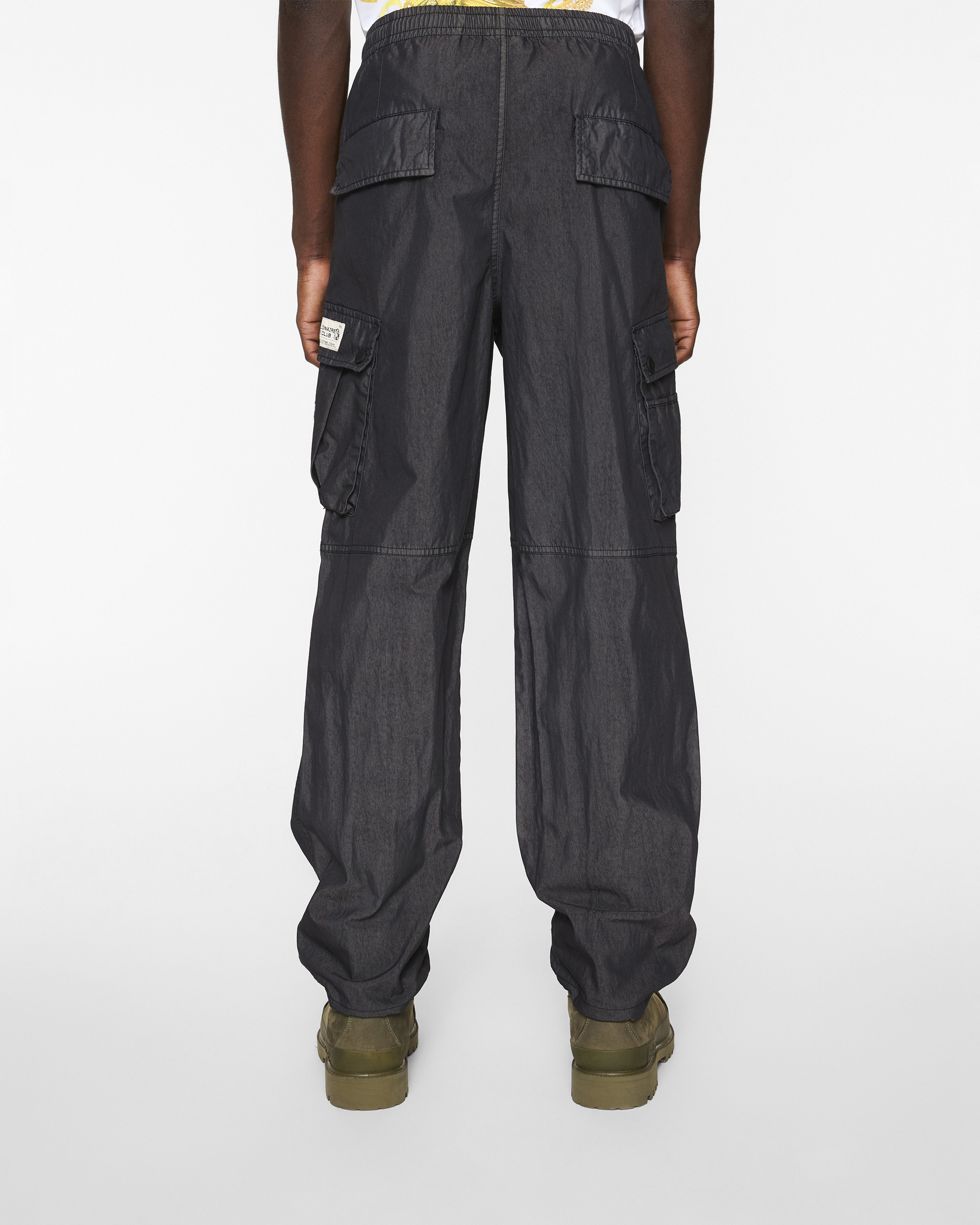 Cargo pants featuring an adjustable waist and a woven label on the left leg.
