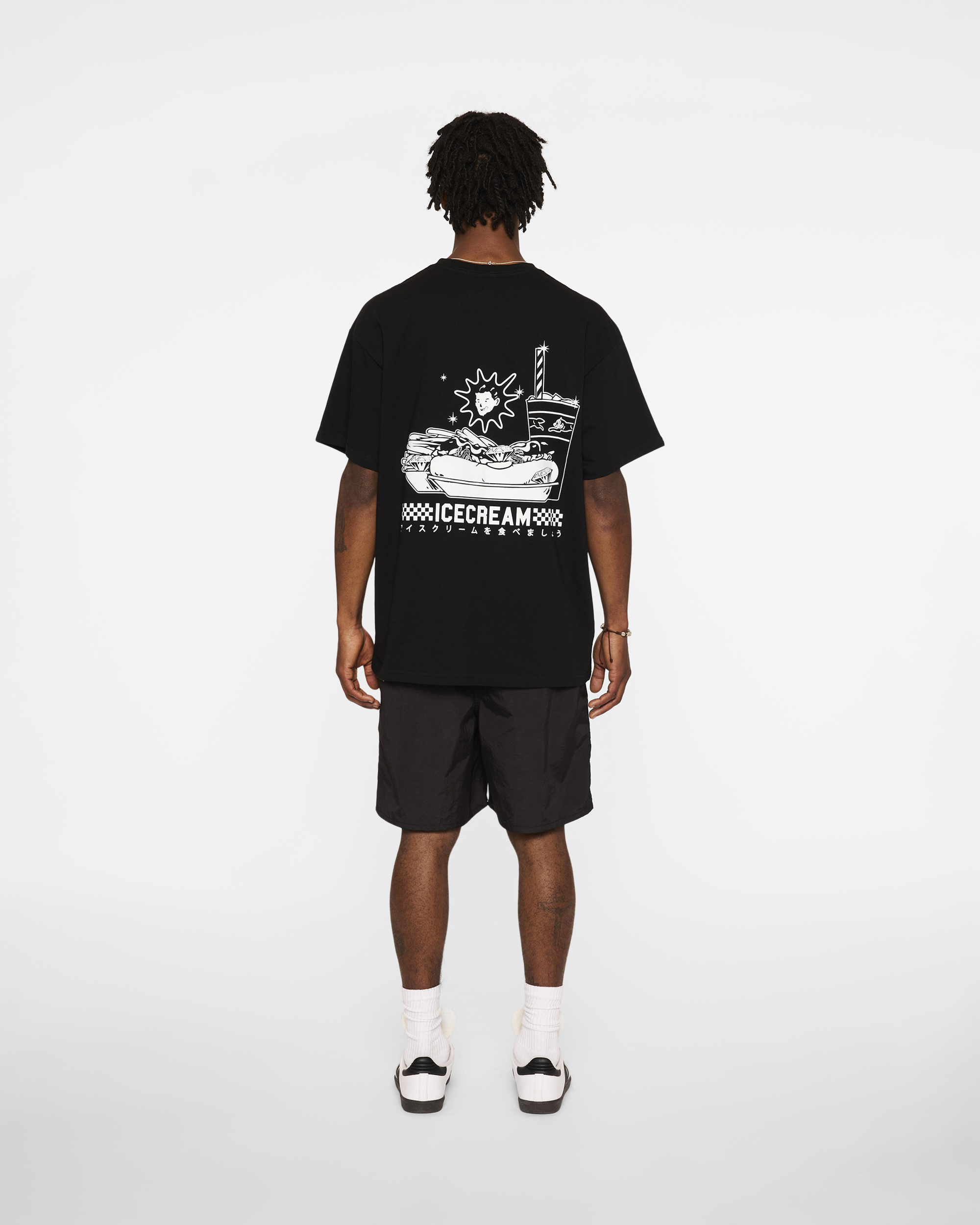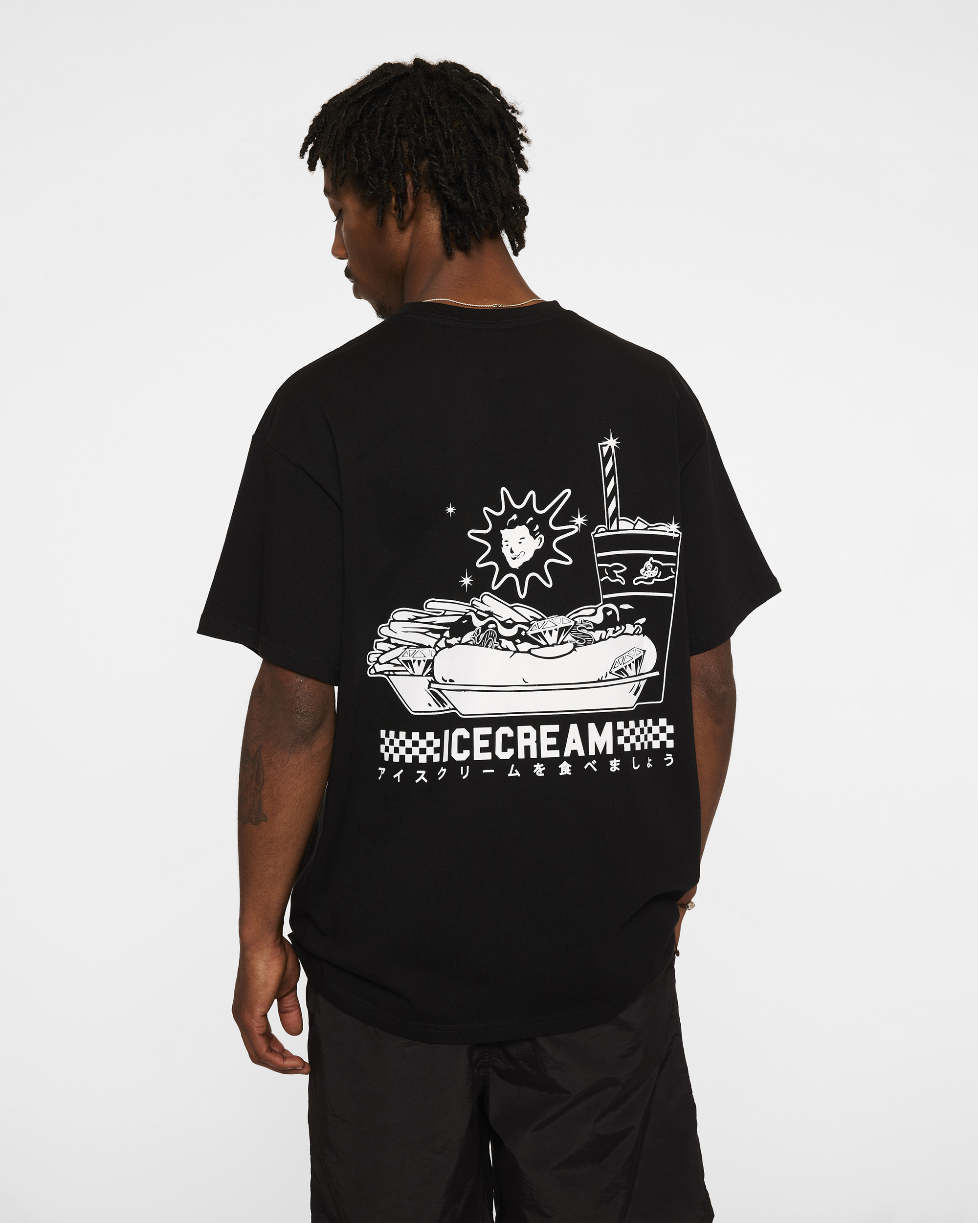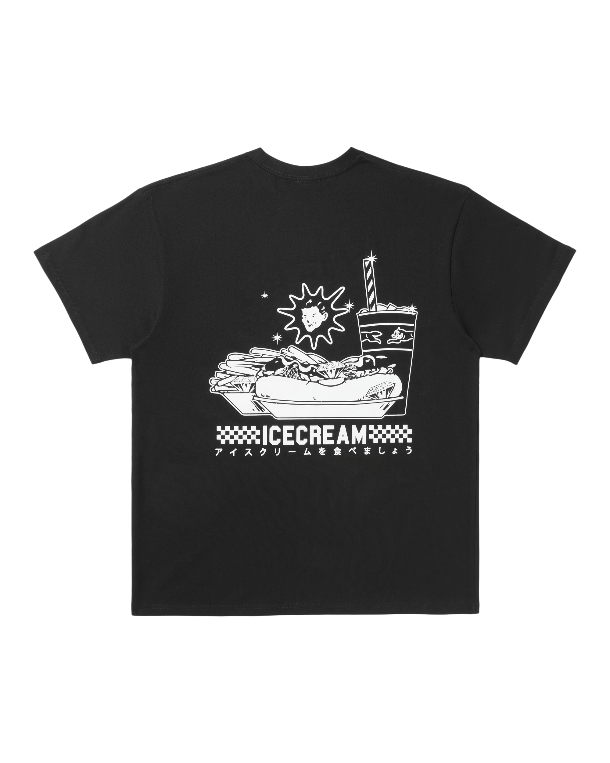 This tee displays the Soft Serve graphic on the front left chest. while the back features a collection of food illustrations. all enhanced with ICECREAM branding elements throughout.