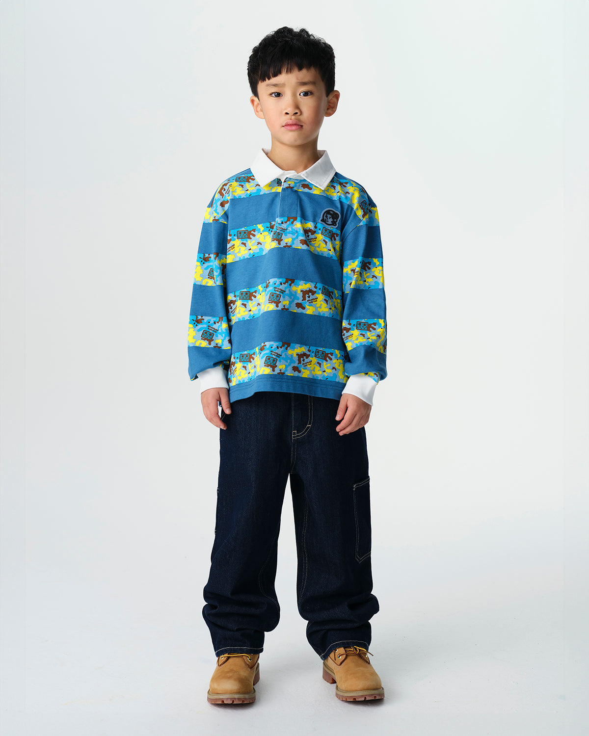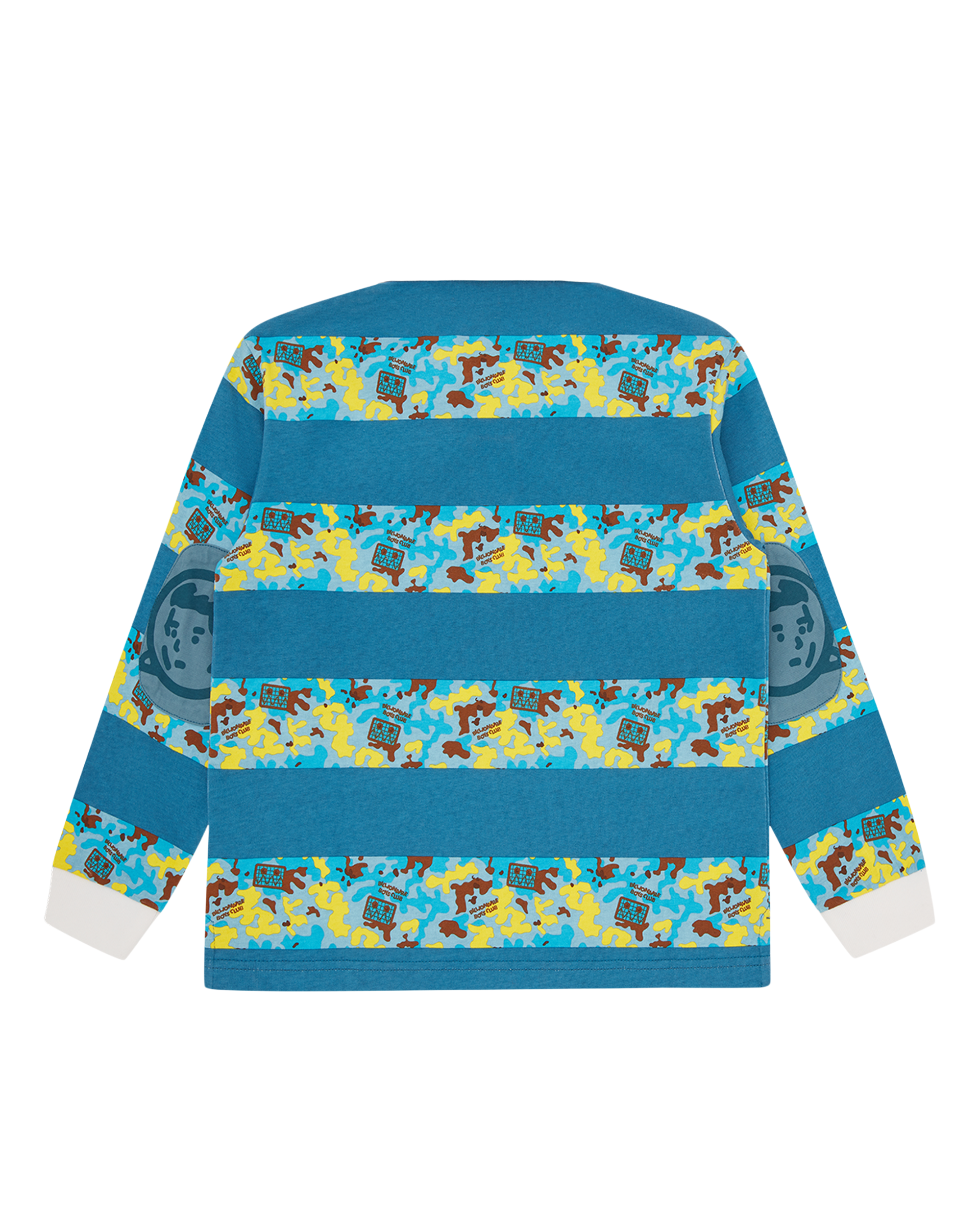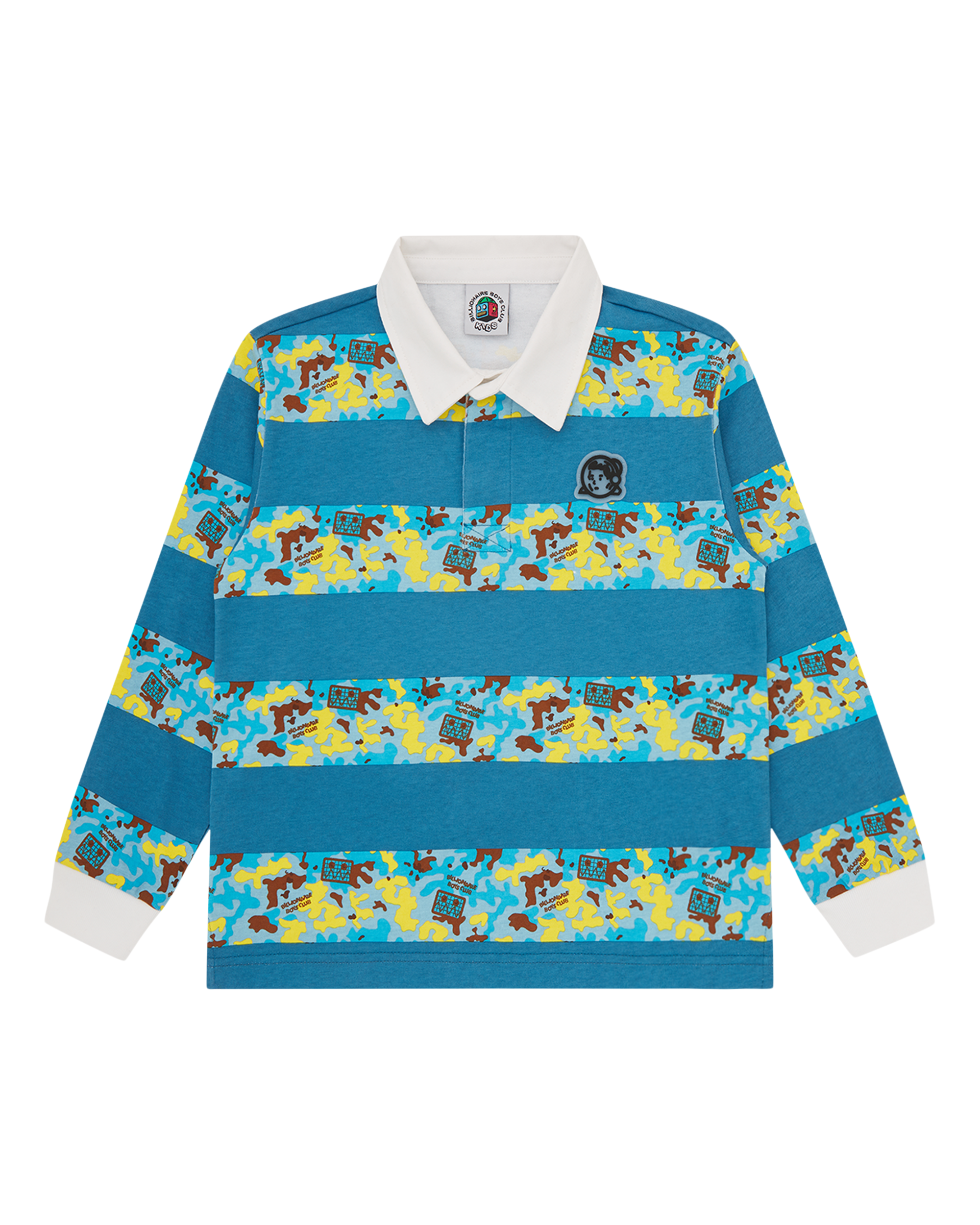 Kids Rugby Top featuring an all-over printed stripe pattern and astro patch on front.