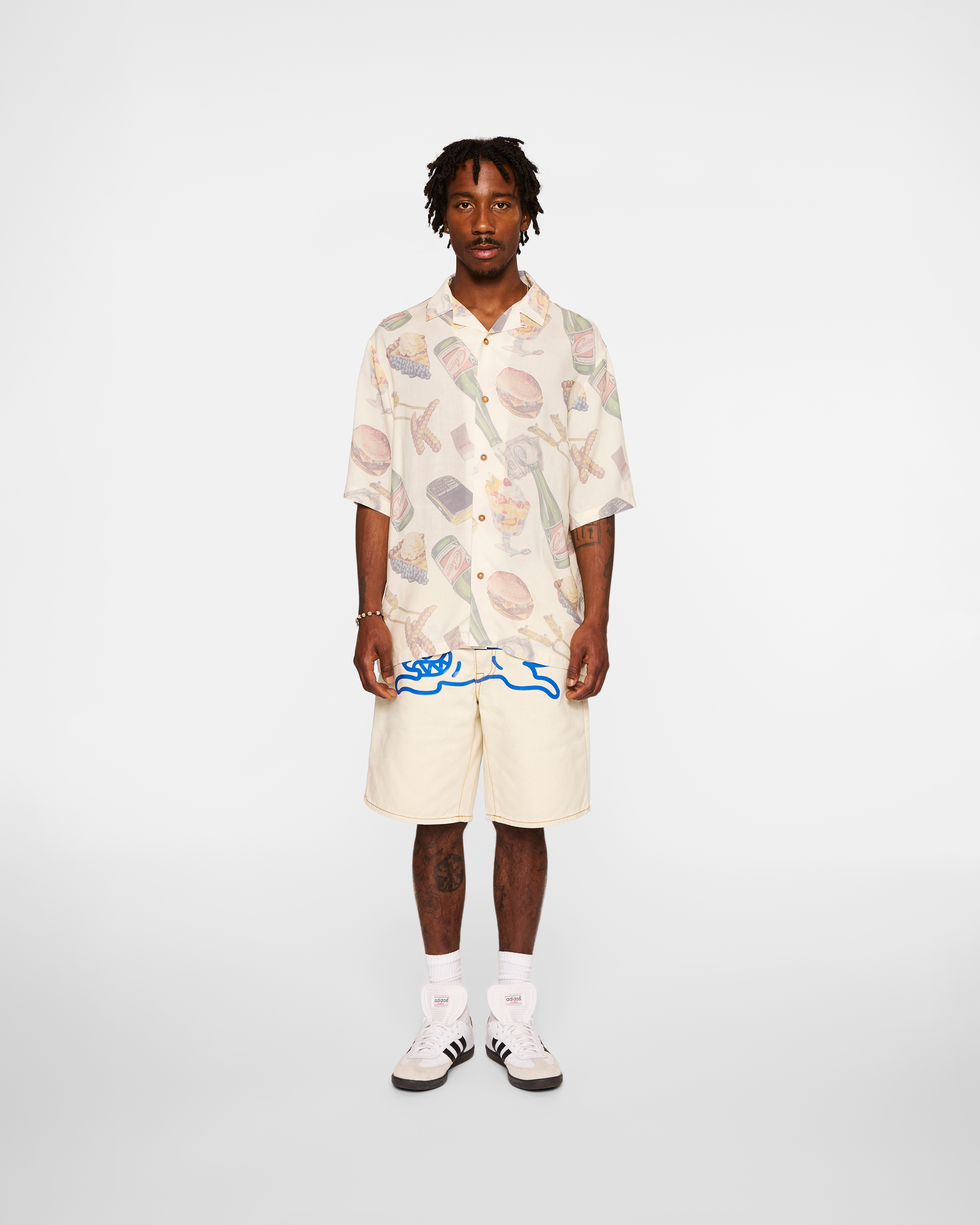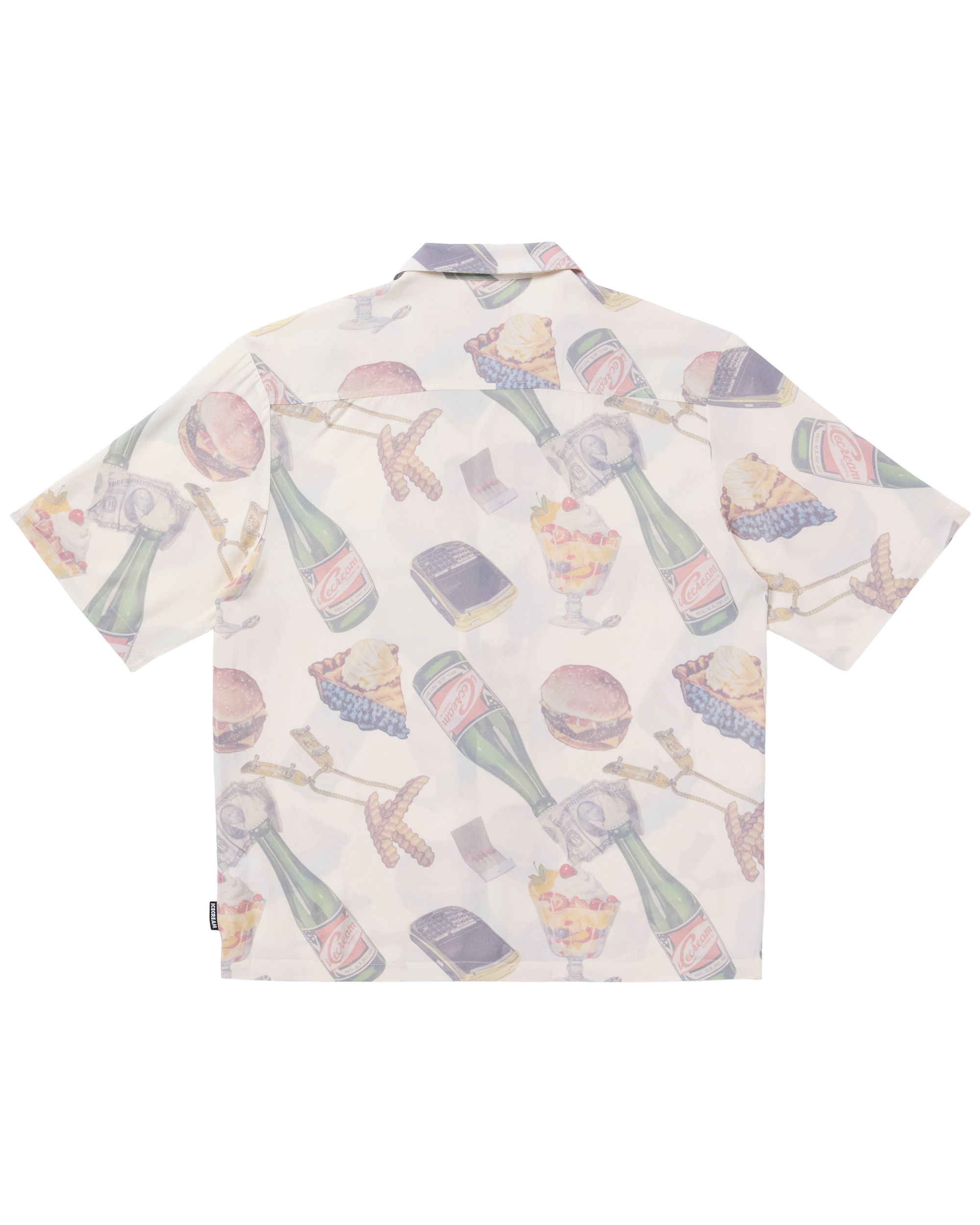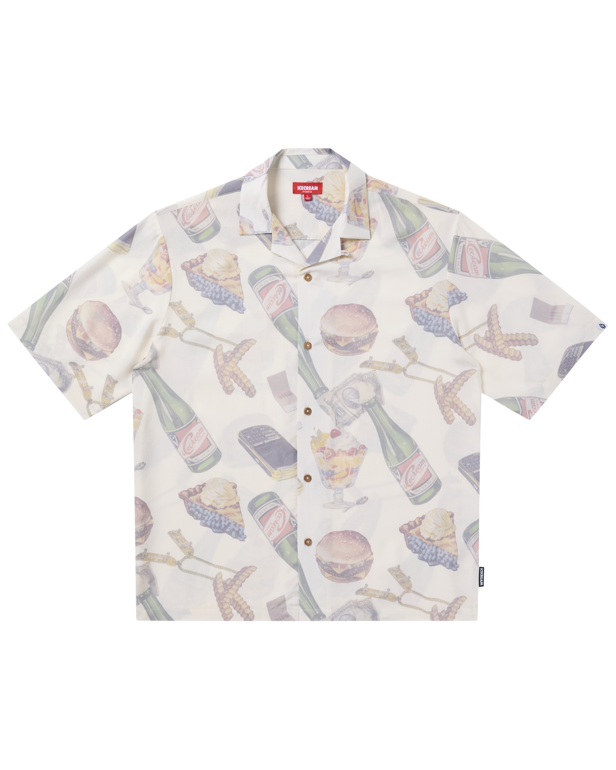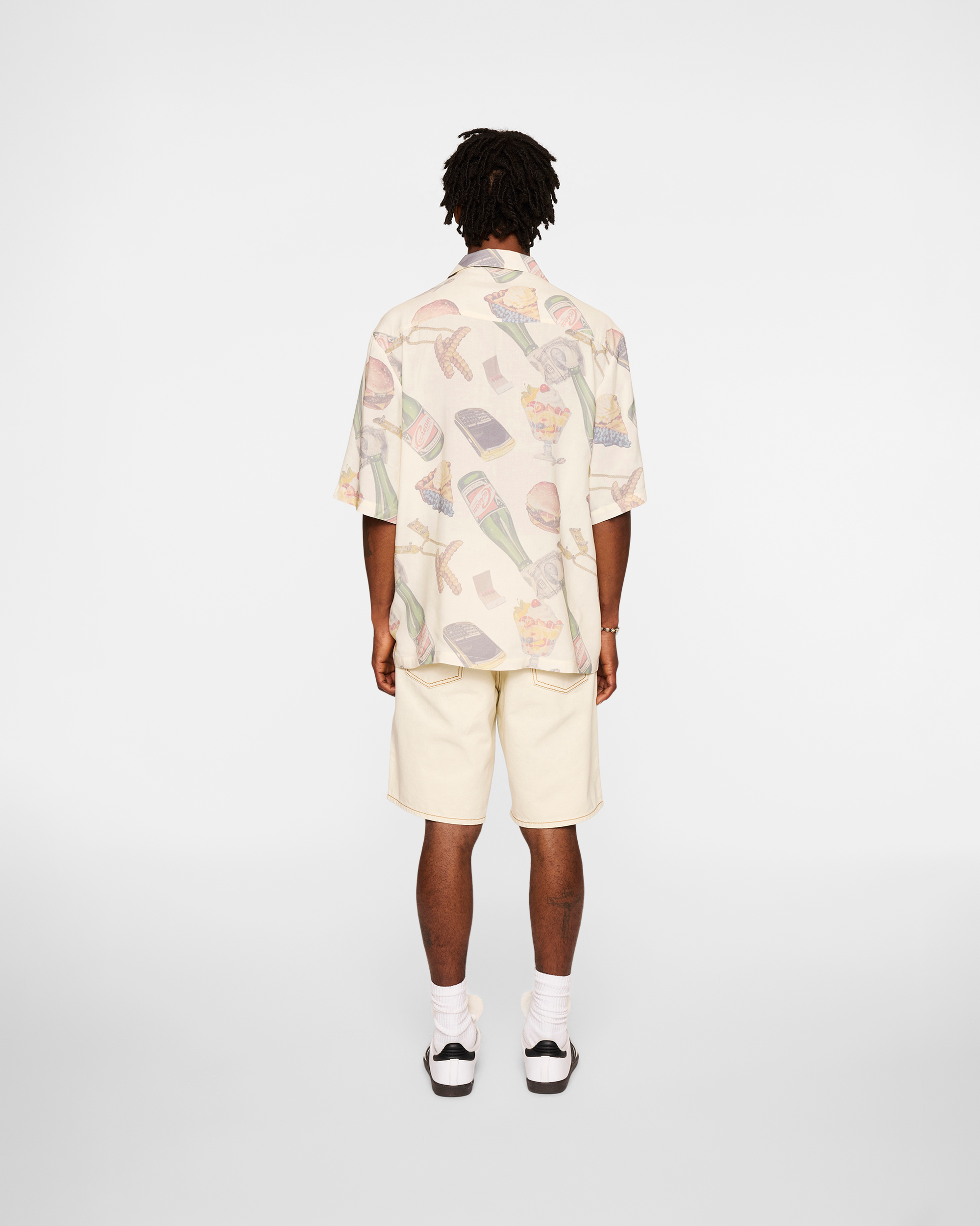 Woven shirt featuring an all-over pattern showcasing an assortment of various food items.