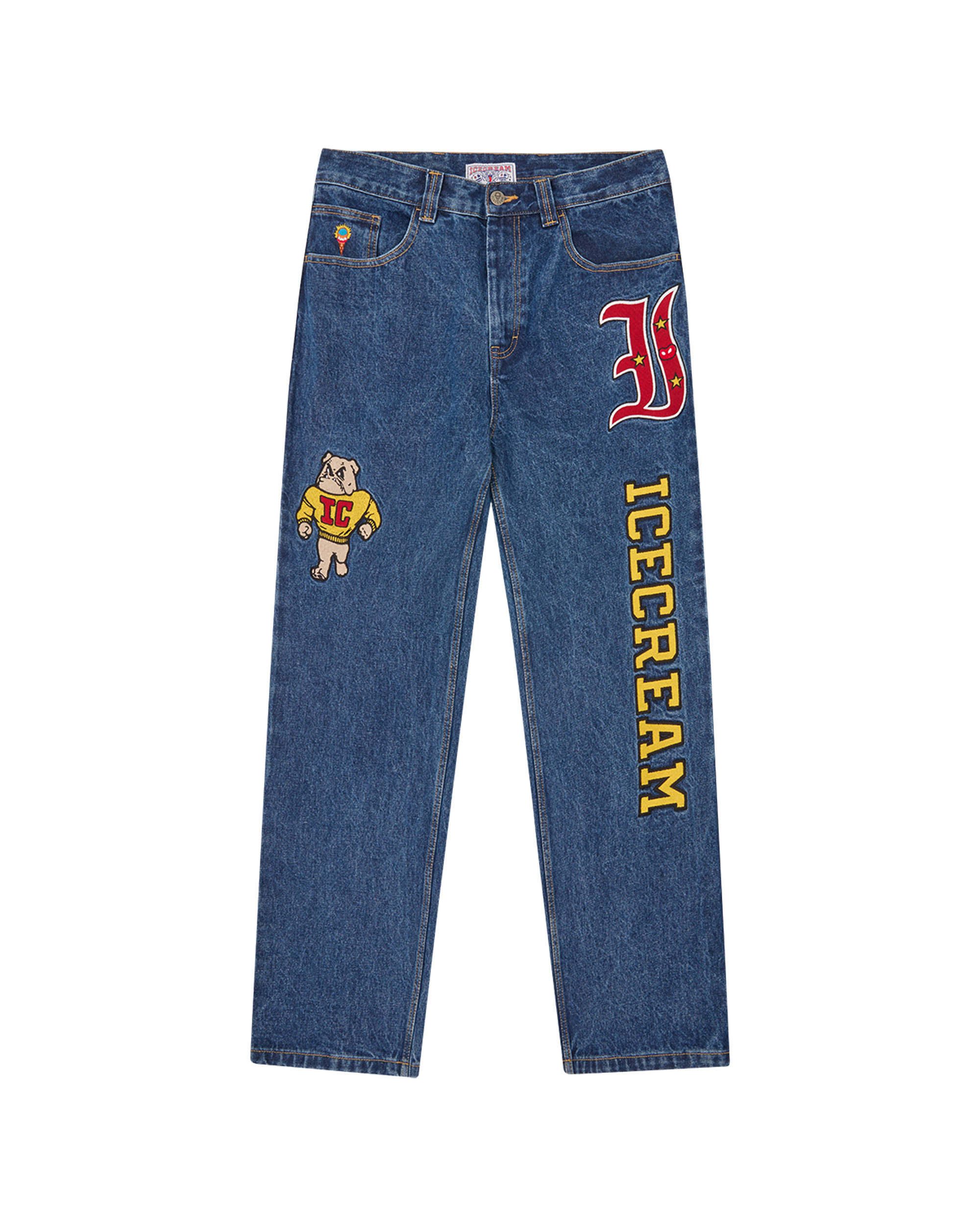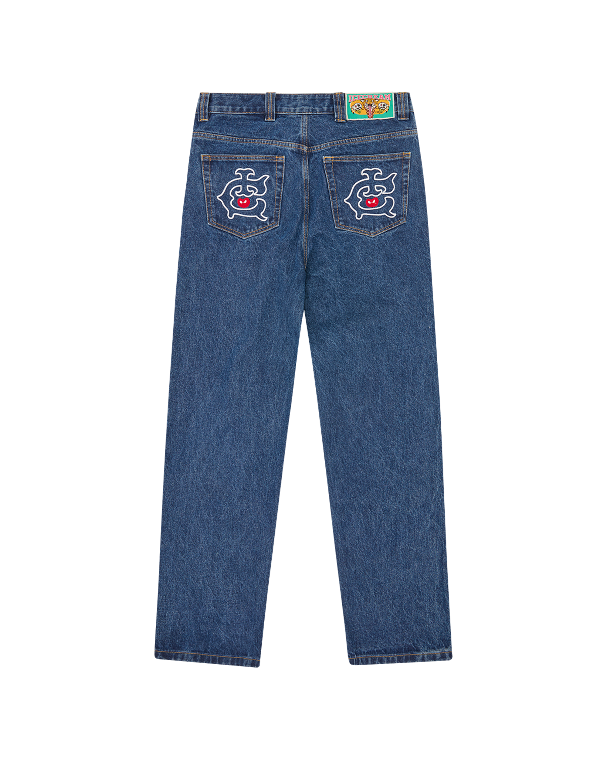 Mascot Denim Pants feature the ICECREAM logo and graphic embroidered at front; it is detailed with the embroidered ‘IC’ lettering on back pockets and a zip-fastened fly. Loose fit.