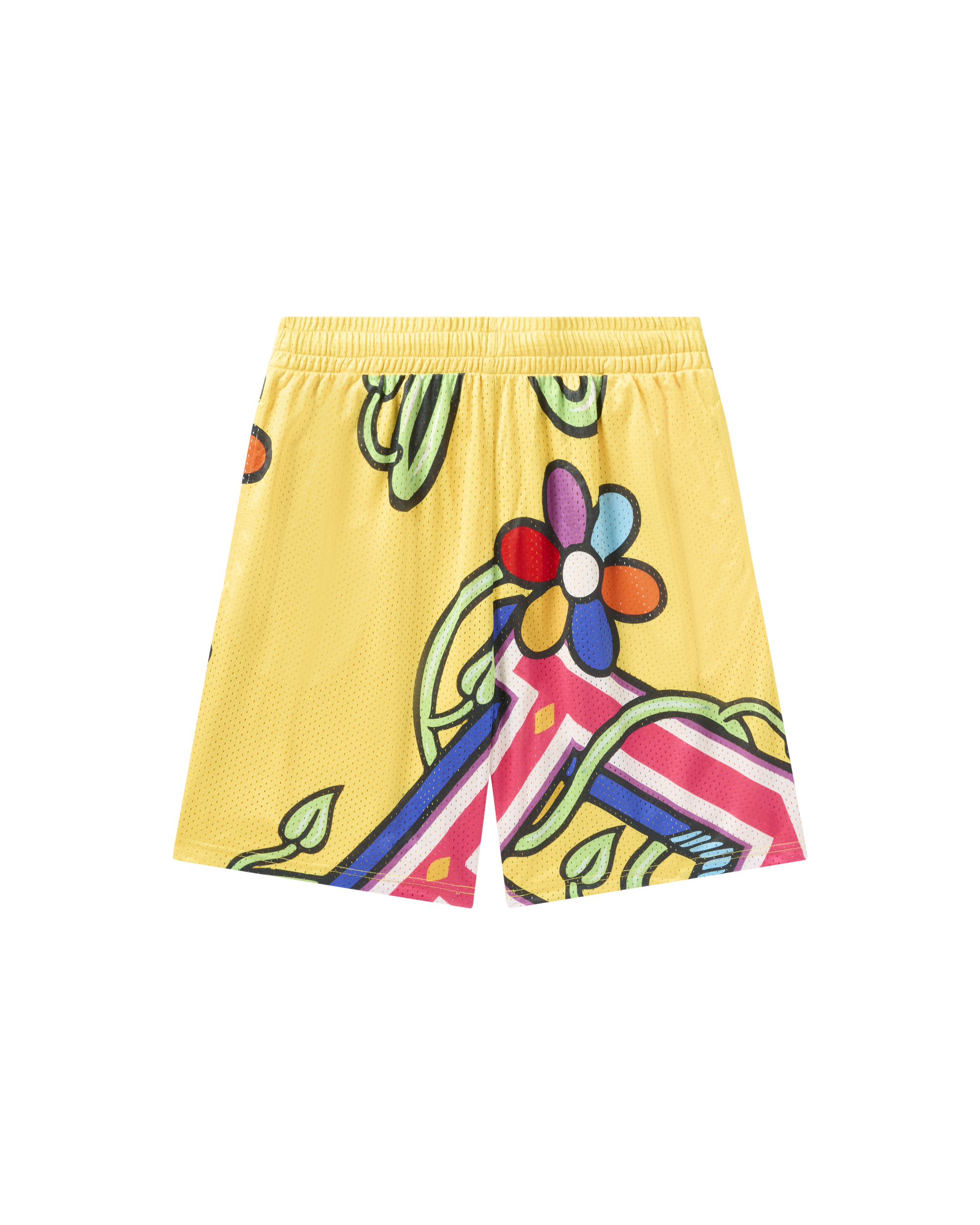 Mesh Shorts feature an adjustable waistband and a bright yellow base covered in Jae Tips’ classic multicolored floral and vine artwork. along with the classic Rocket logo.