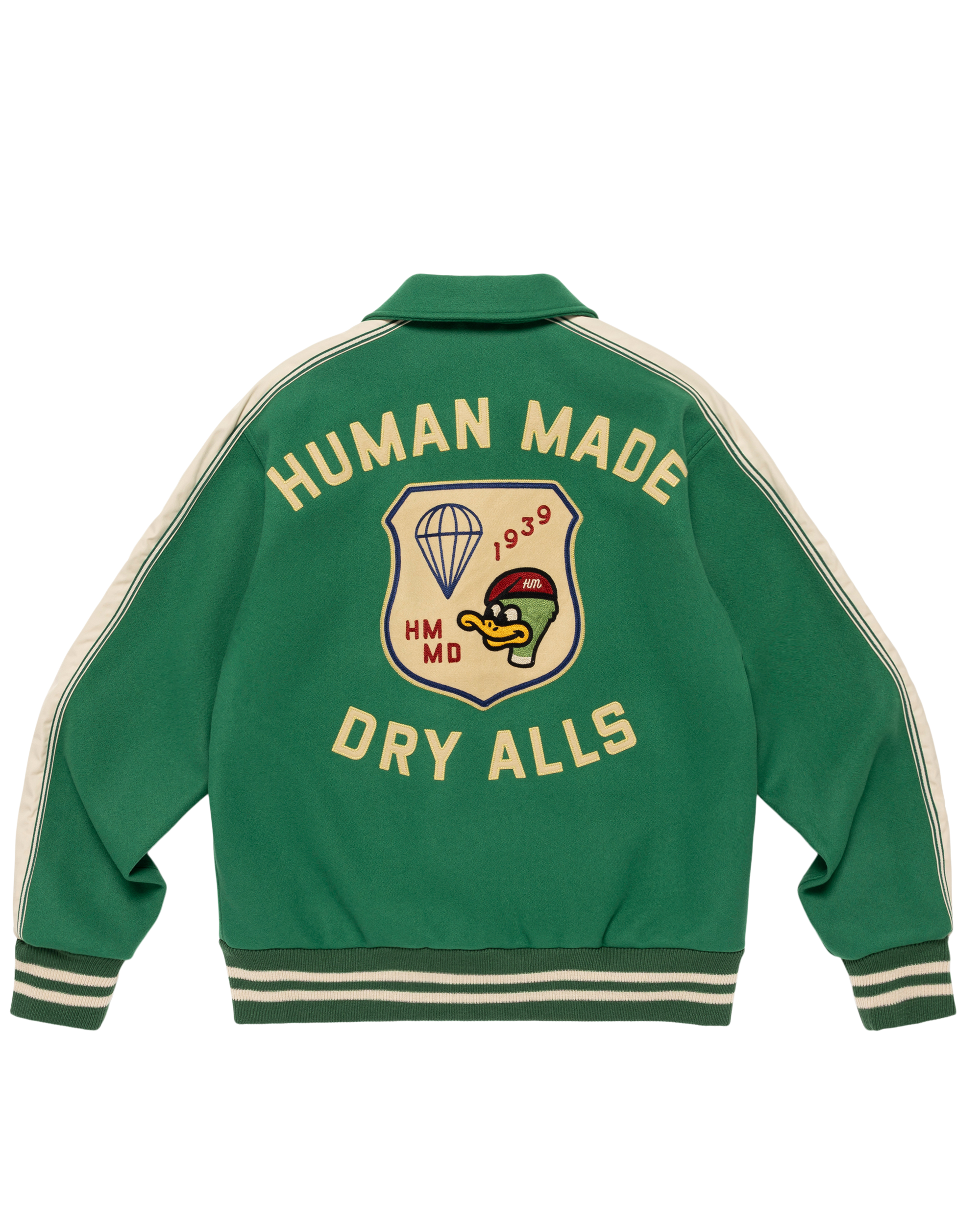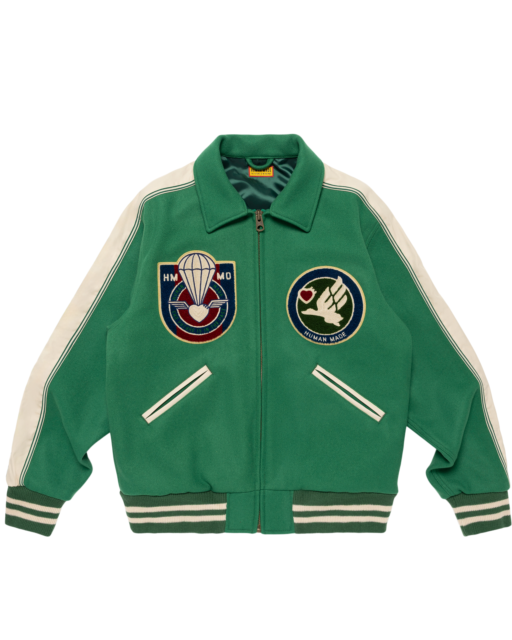 Military jacket with vintage styling. Features back graphic with chenille patch and chain stitching. chest patches on both sides. and ribbed cuffs and hem with stripes.