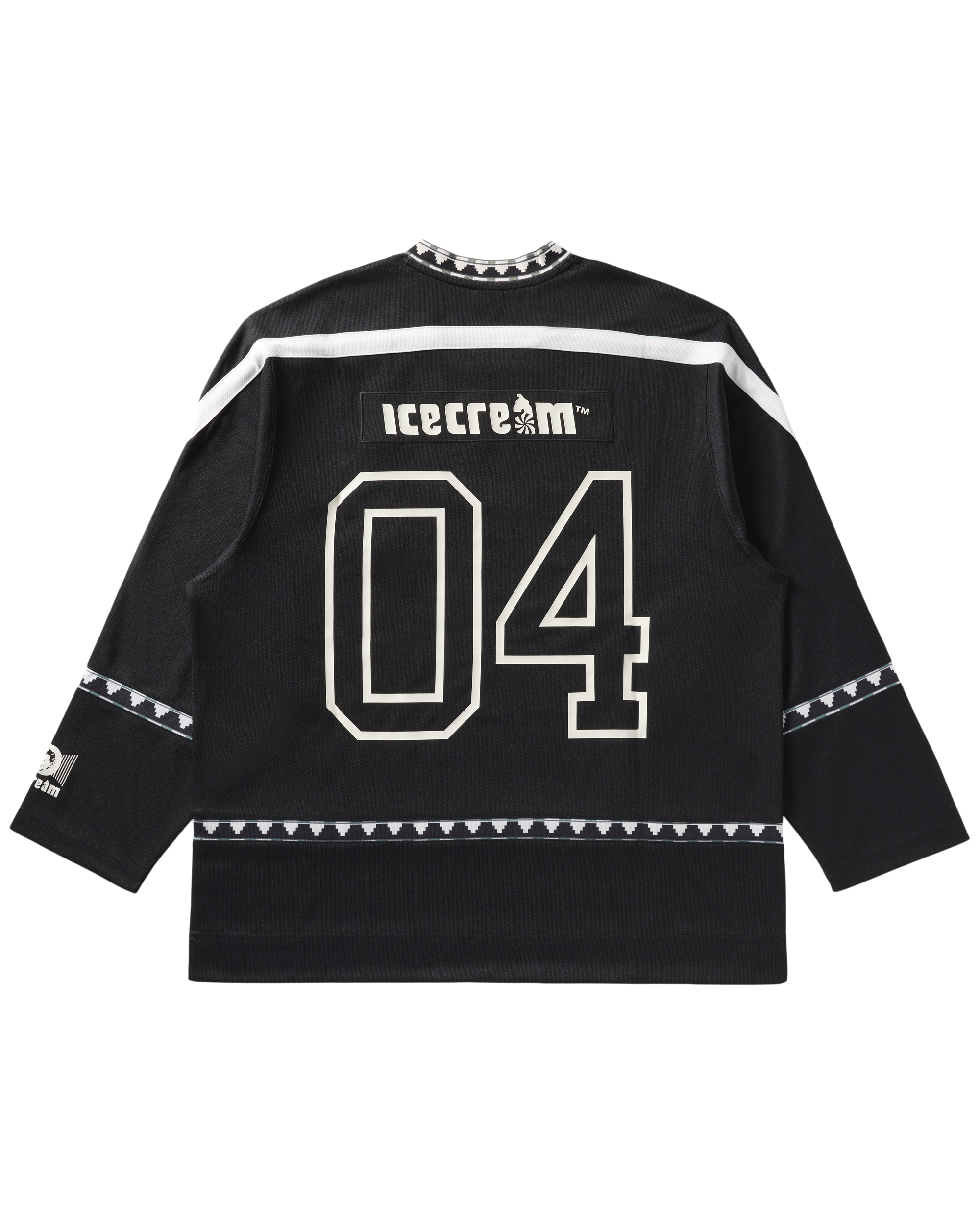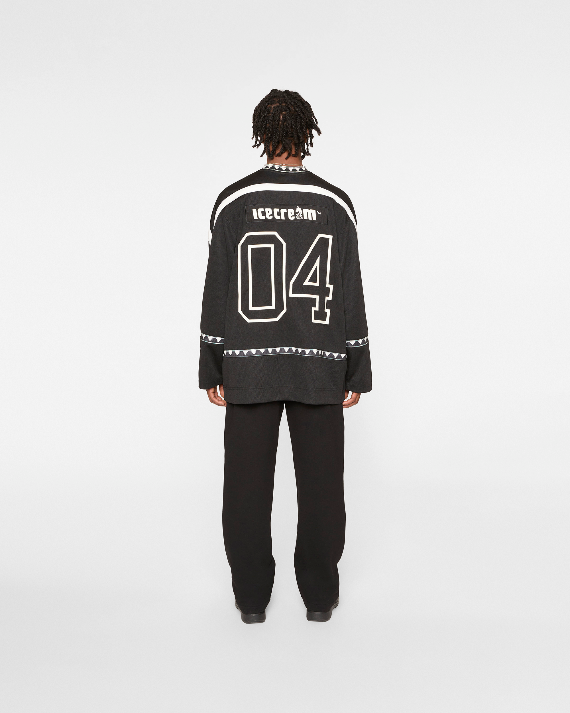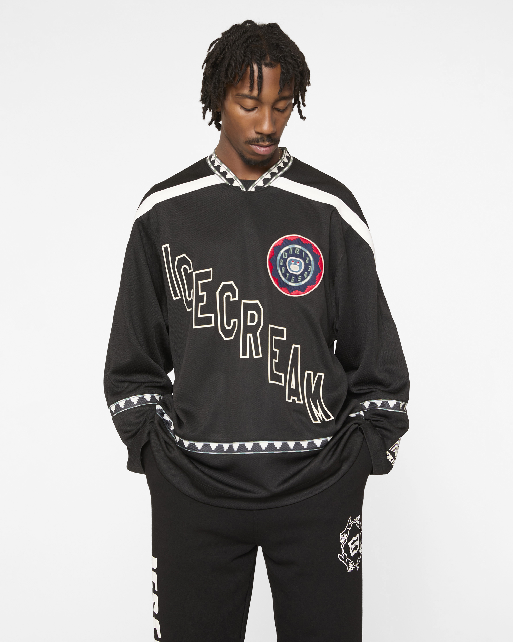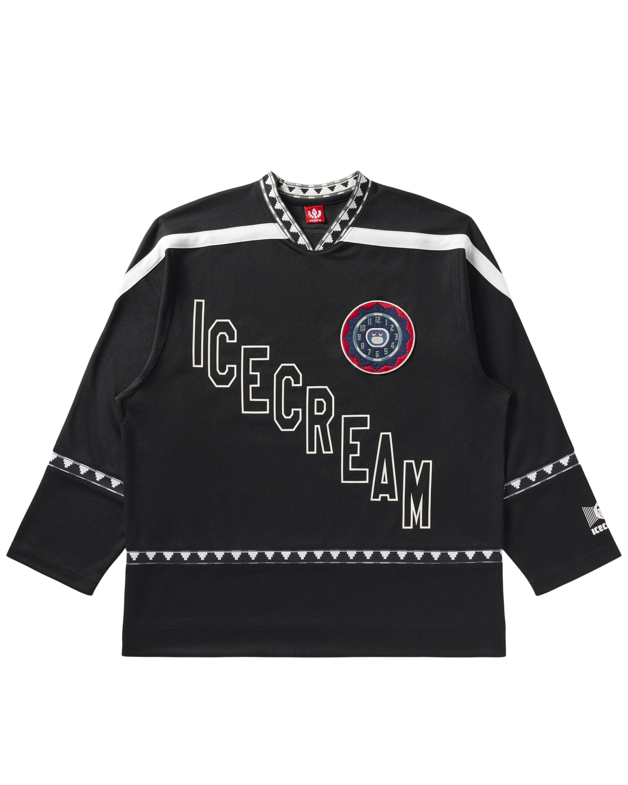 The Party on Jersey LS Knit features an Icecream graphic across the front with a woven patch on the left chest. The back displays the Icecream logo paired with a 04.