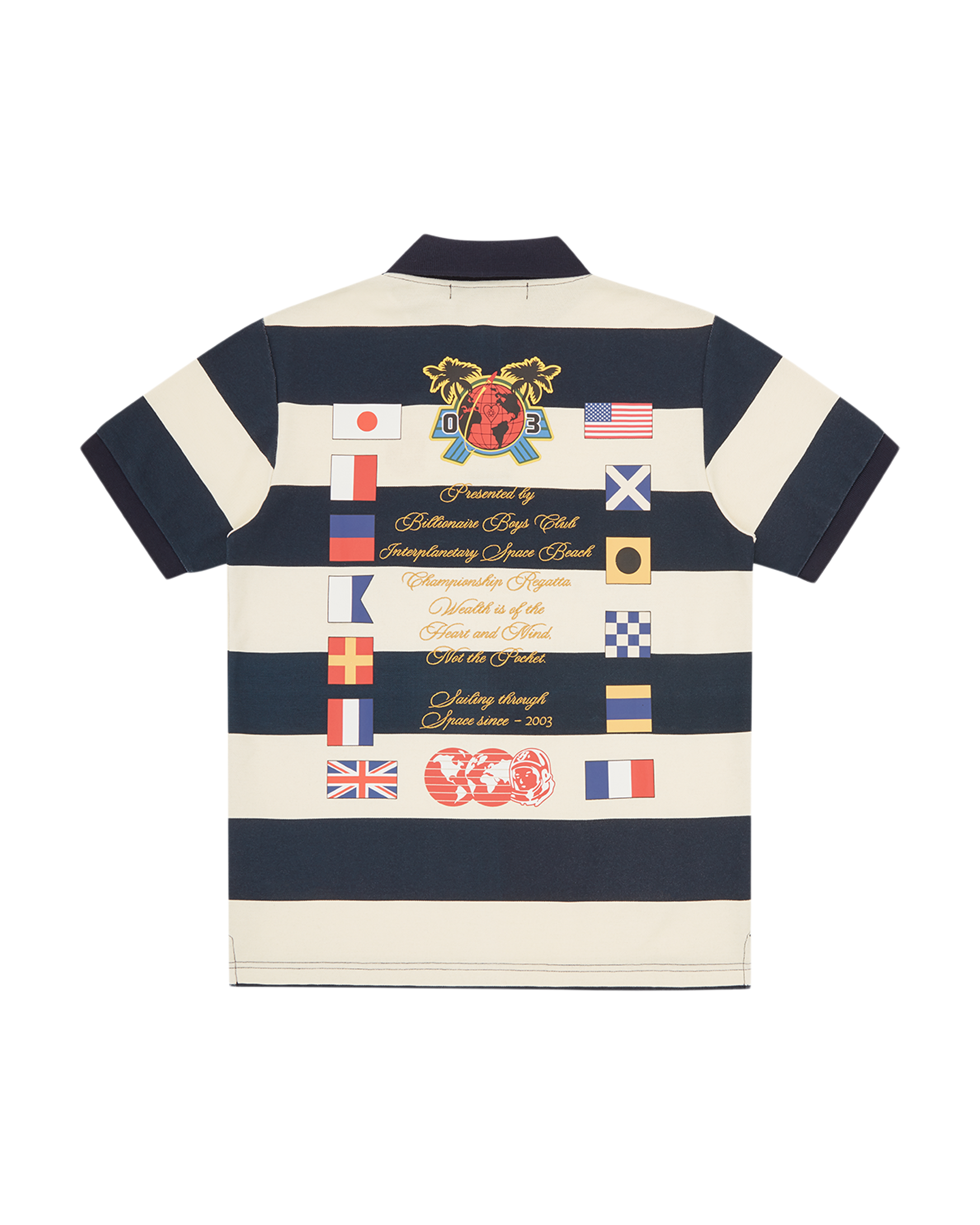 The Regatta Stripe Polo Shirt showcases the Astro helmet embroidery and the printed Billionaire Boys Club graphic on the chest. It features the brand’s primary country flags and embroidered regatta-inspired details across the back.