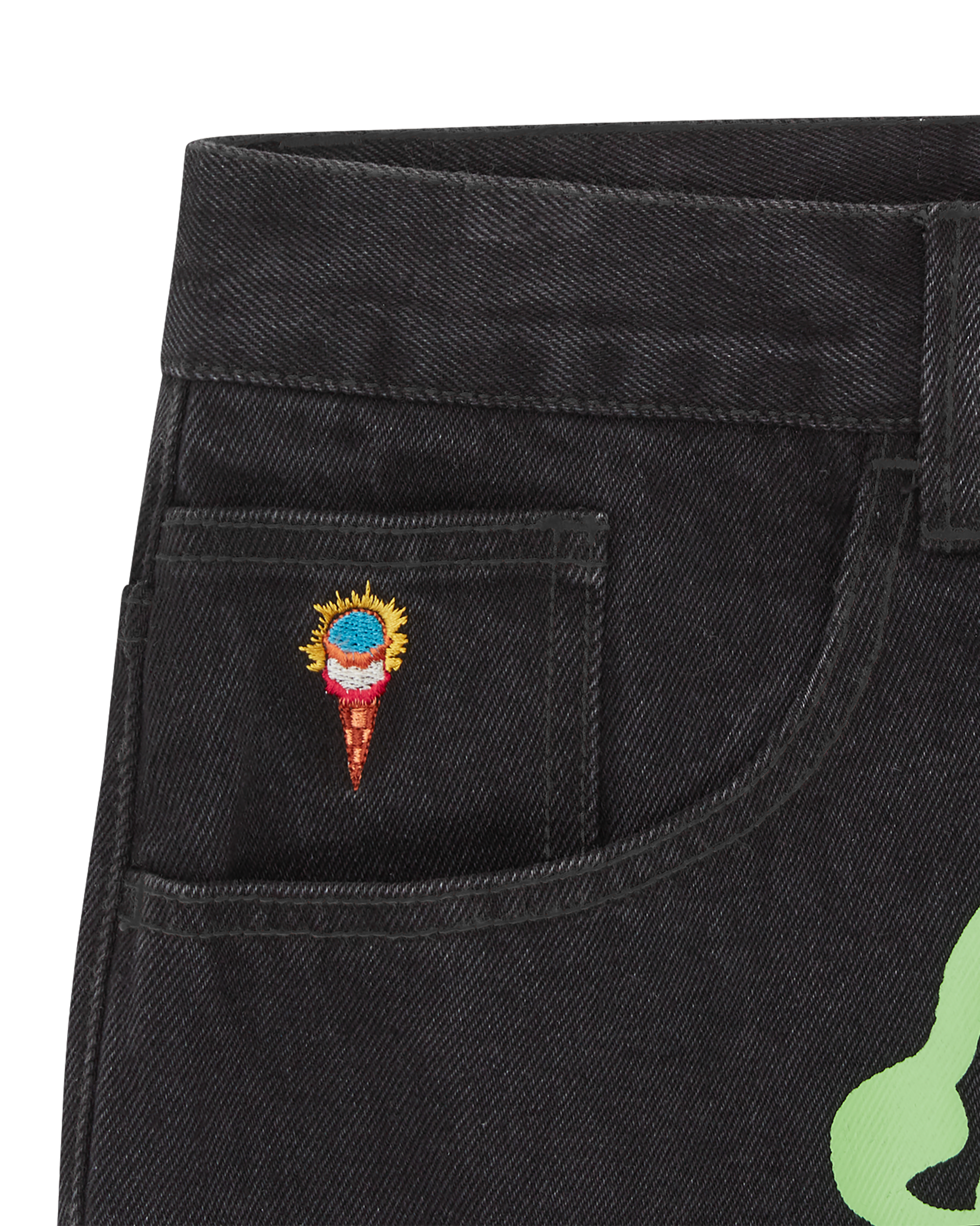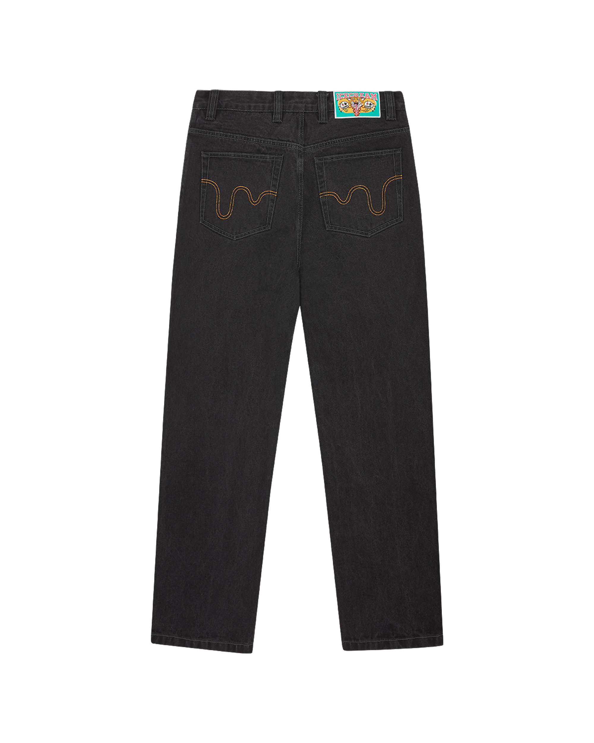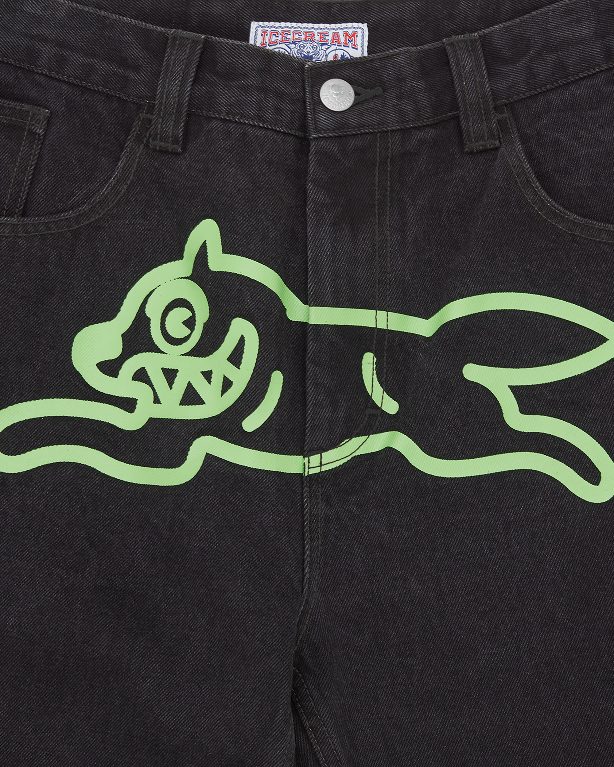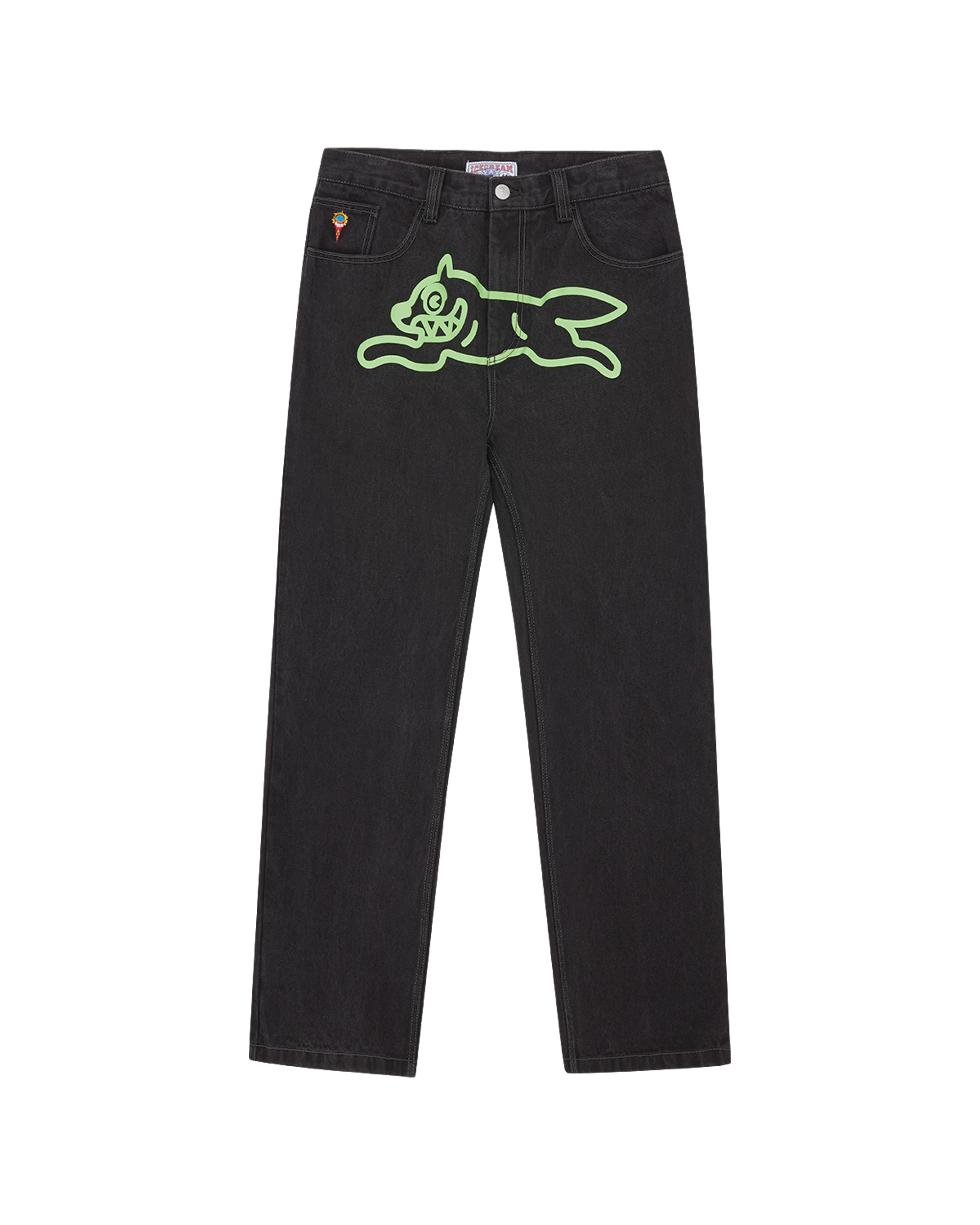 Running Dog Double Scoop Denim Pant. features a screen-printed running dog graphic on the front. embroidered double scoop signet at coin pocket. and drip detailing on the back pockets.
