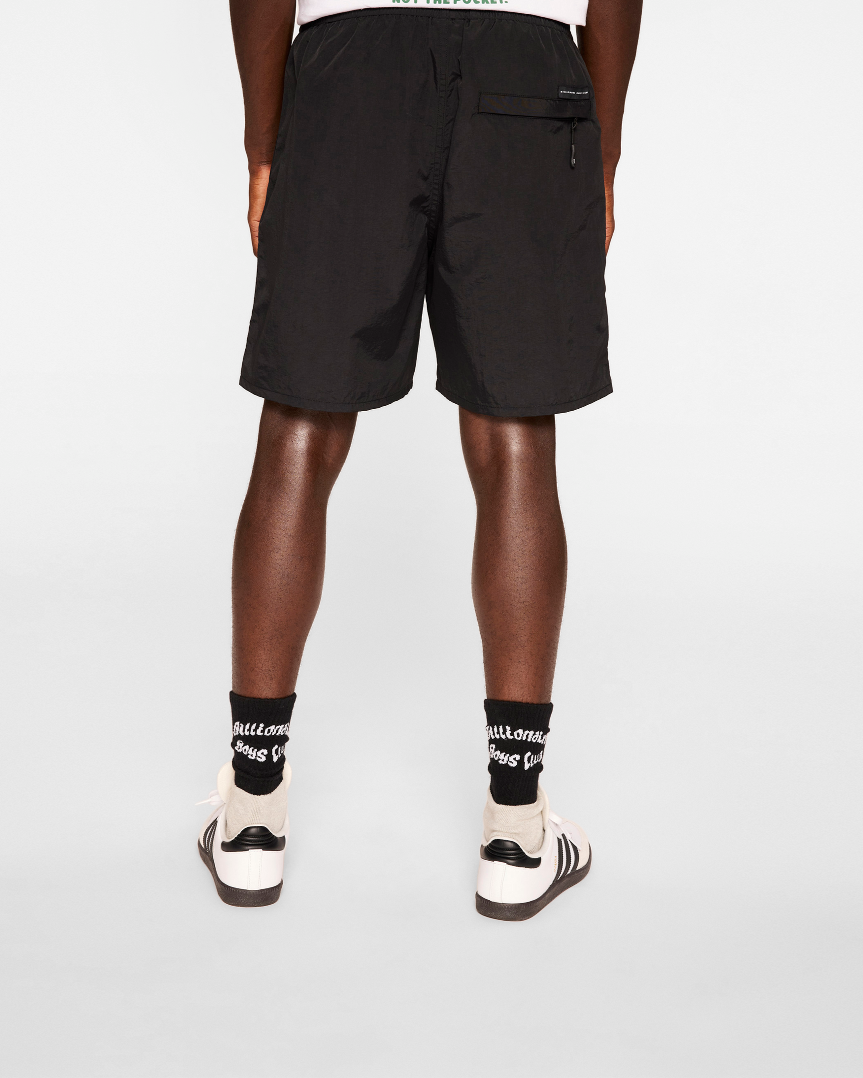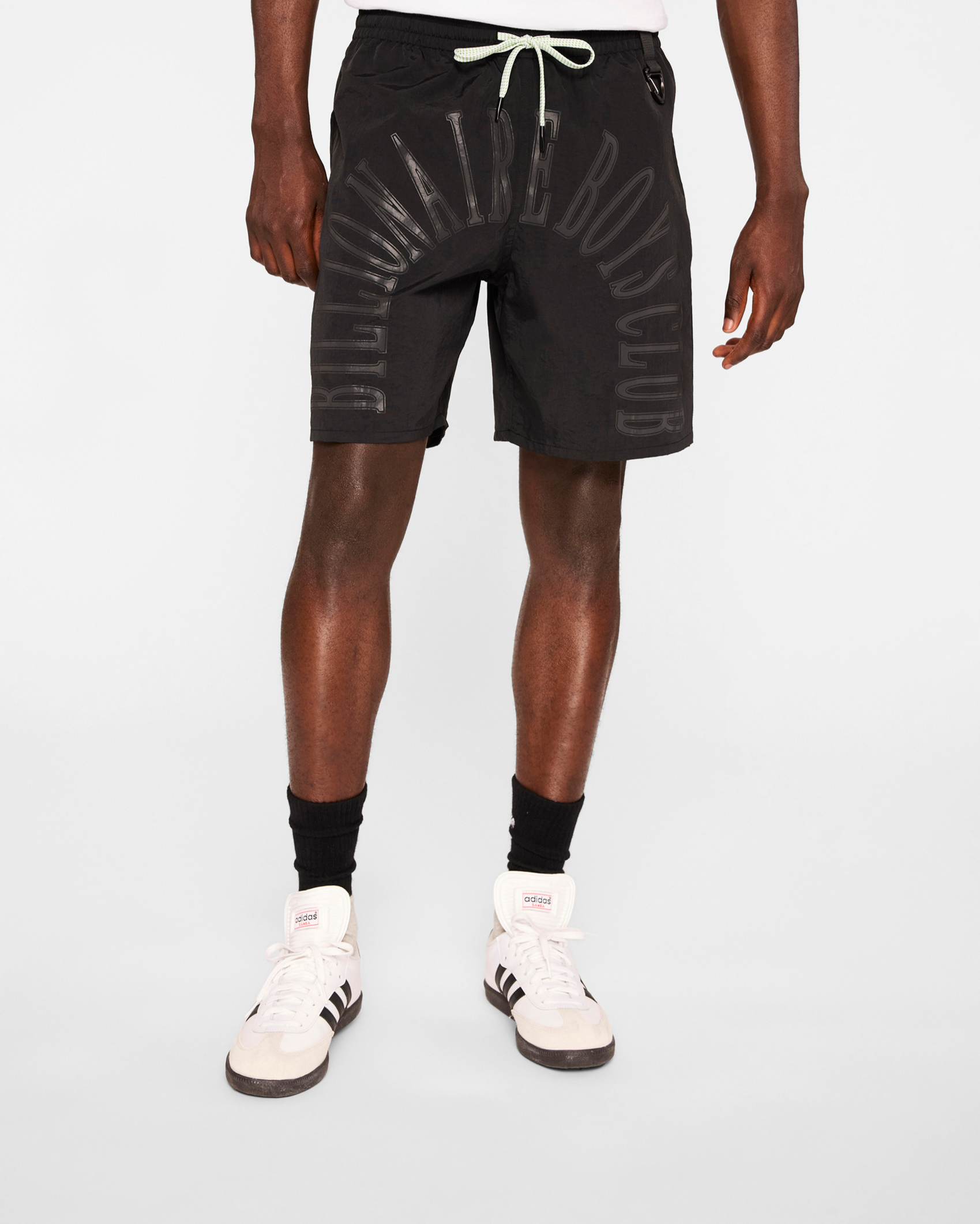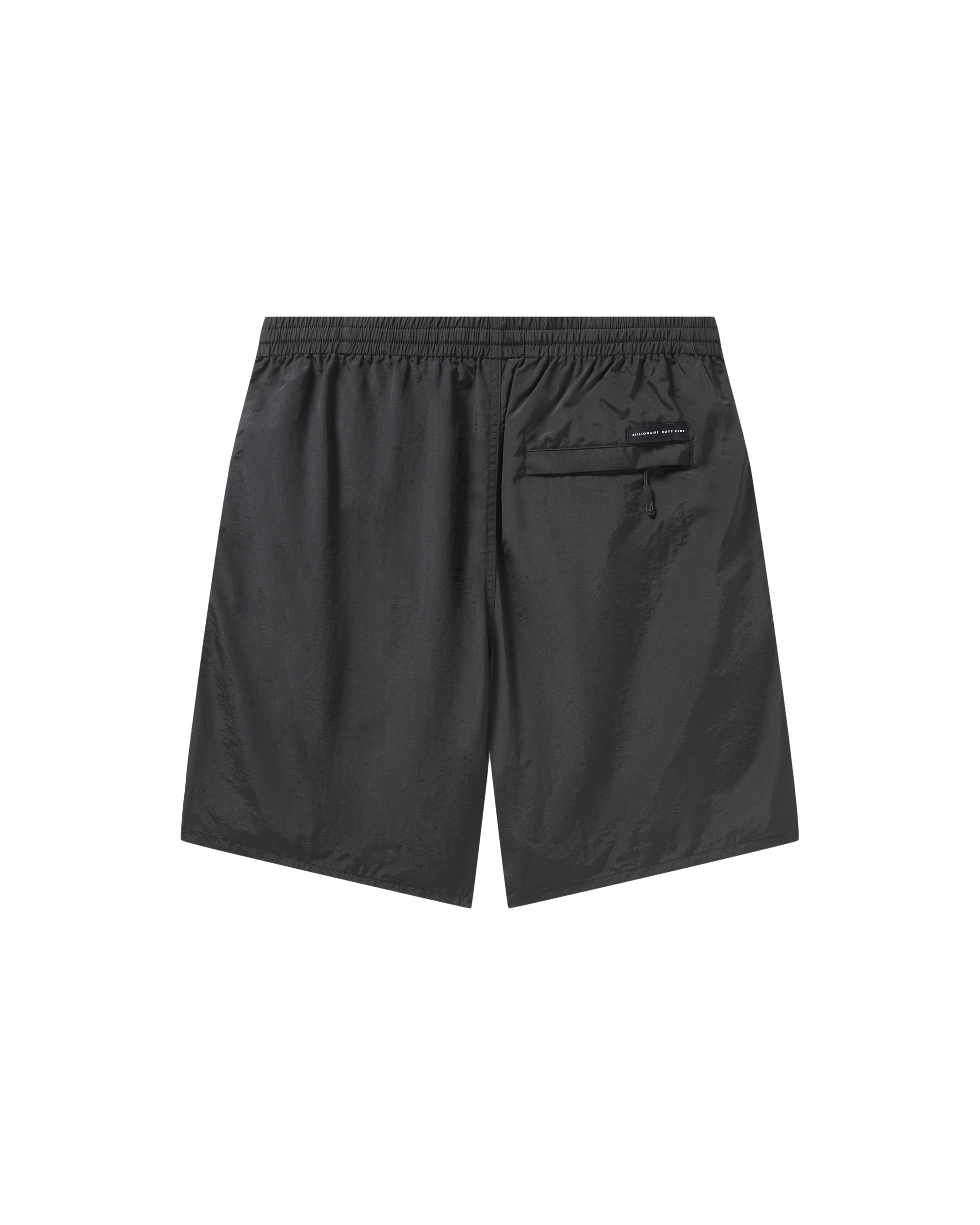 Nylon shorts featuring an adjustable waistband. a key clip on the front. and a tonal Billionaire Boys Club print.