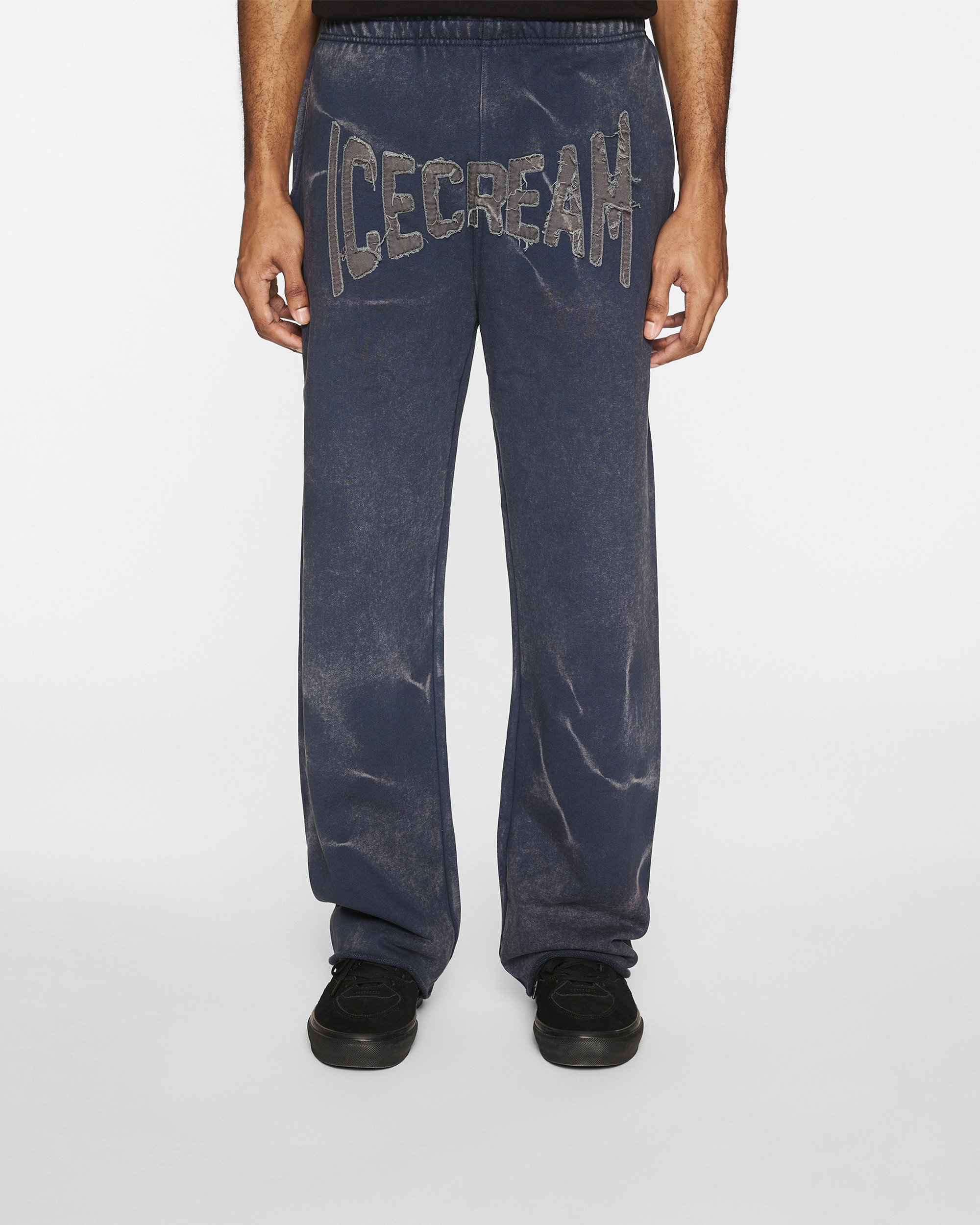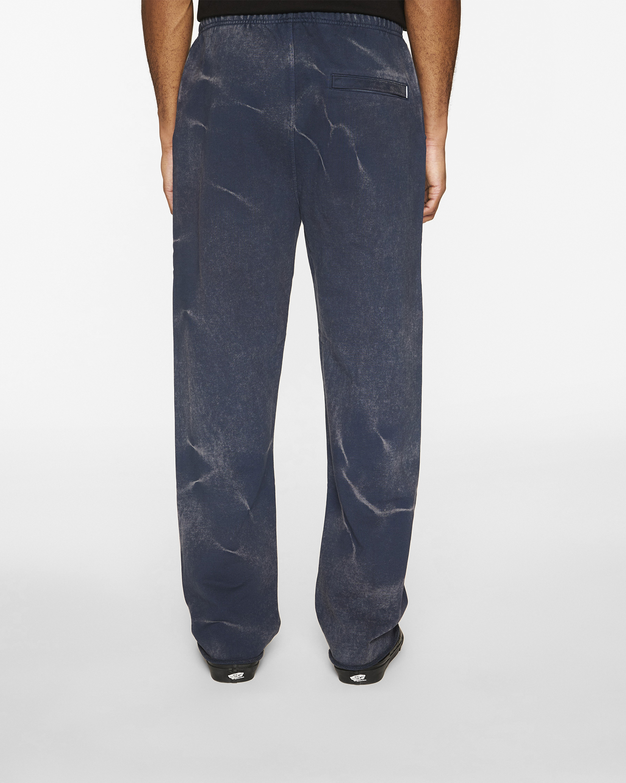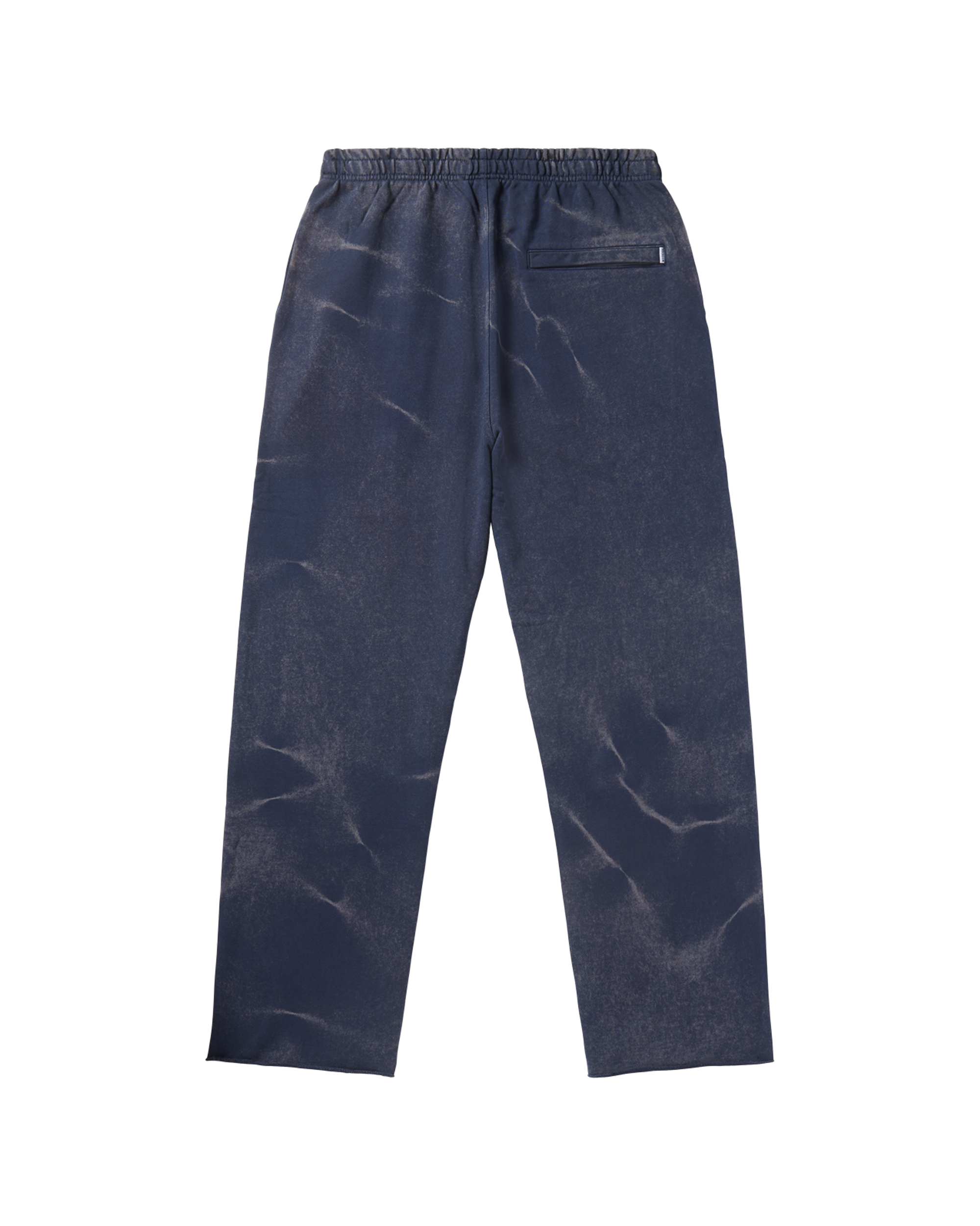Sweatpant with a patterned wash and rae edge twill applique at front crotch.