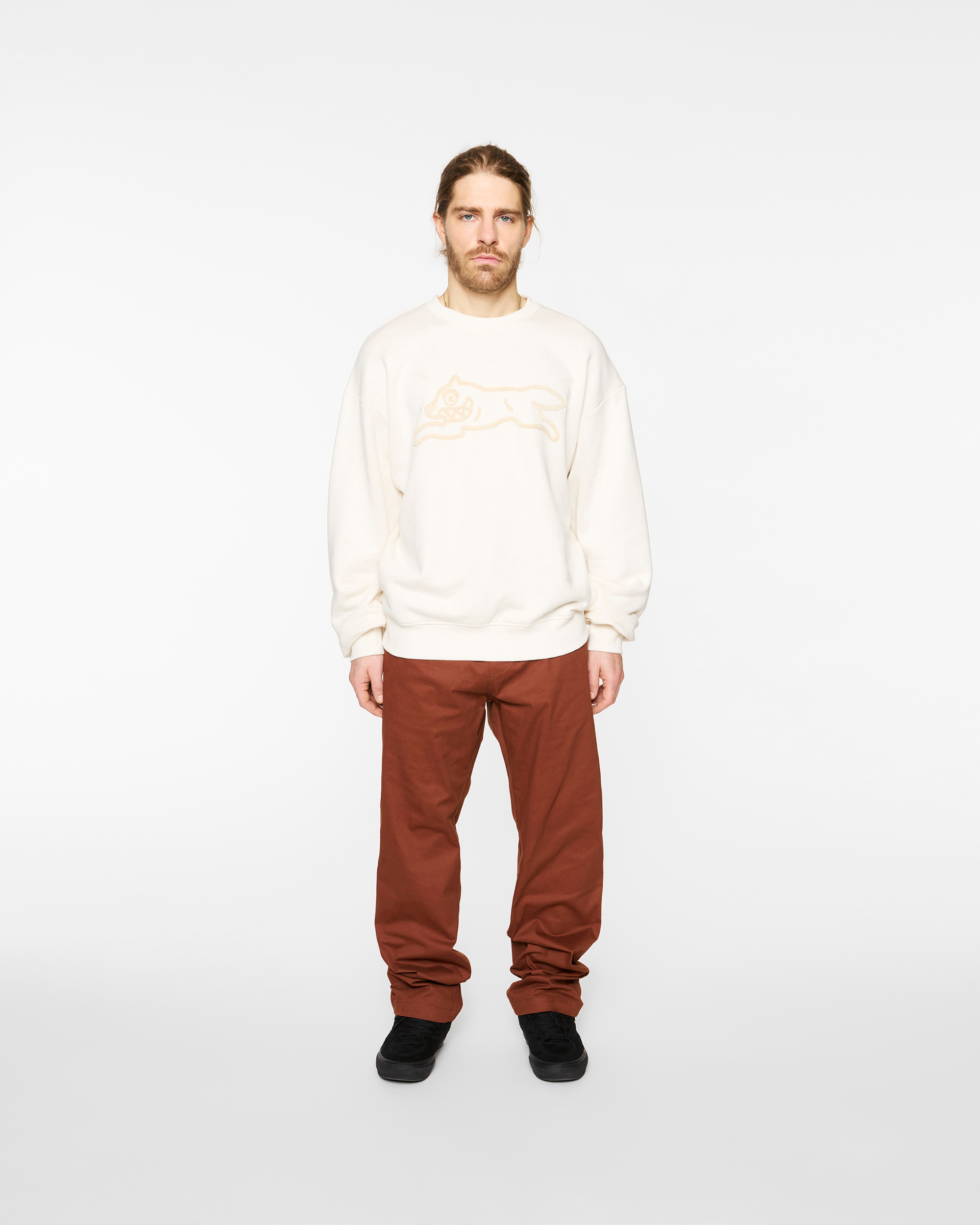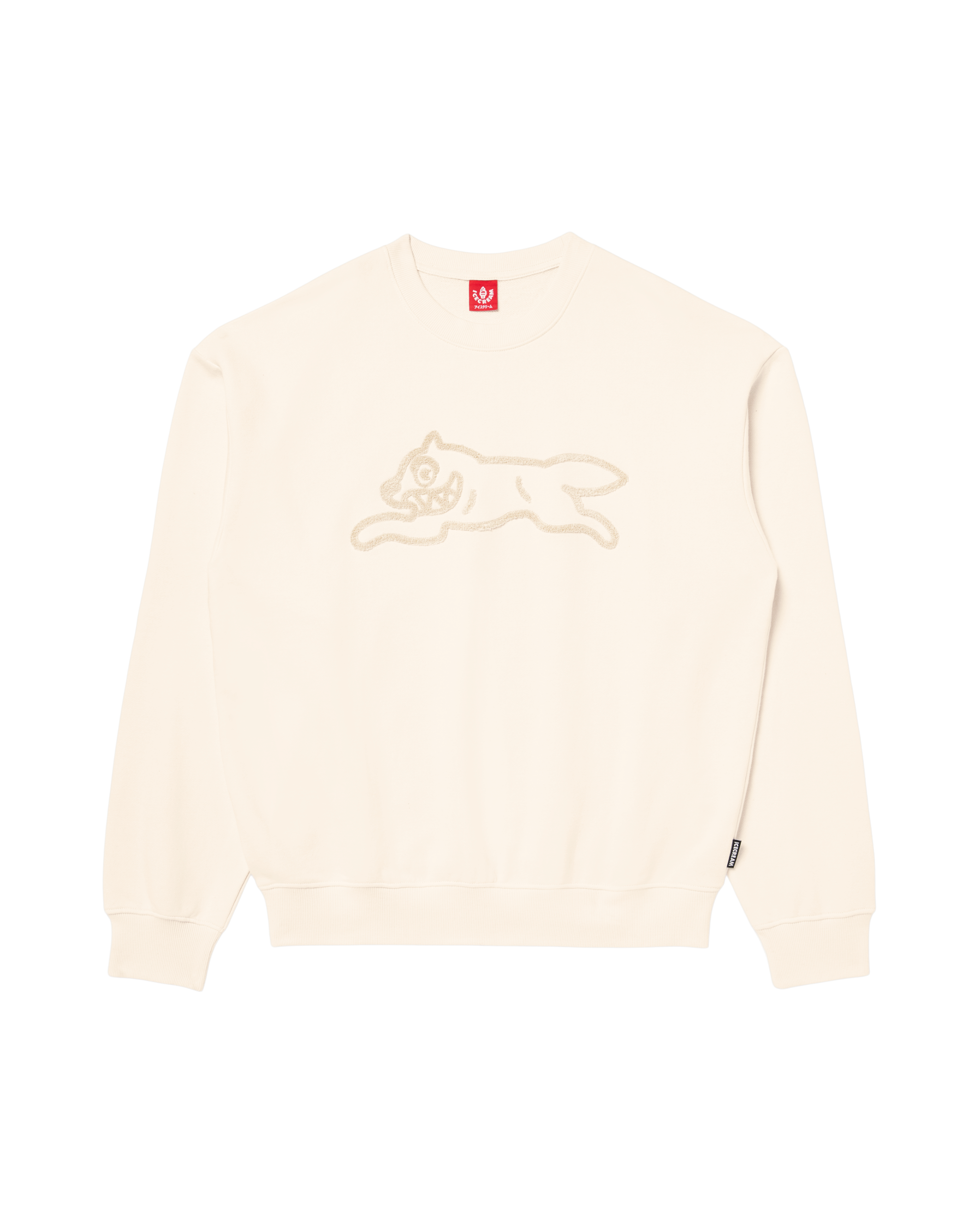 This crewneck sweatshirt features a Running Dog logo on the front chest with colorful chenille embroidery.