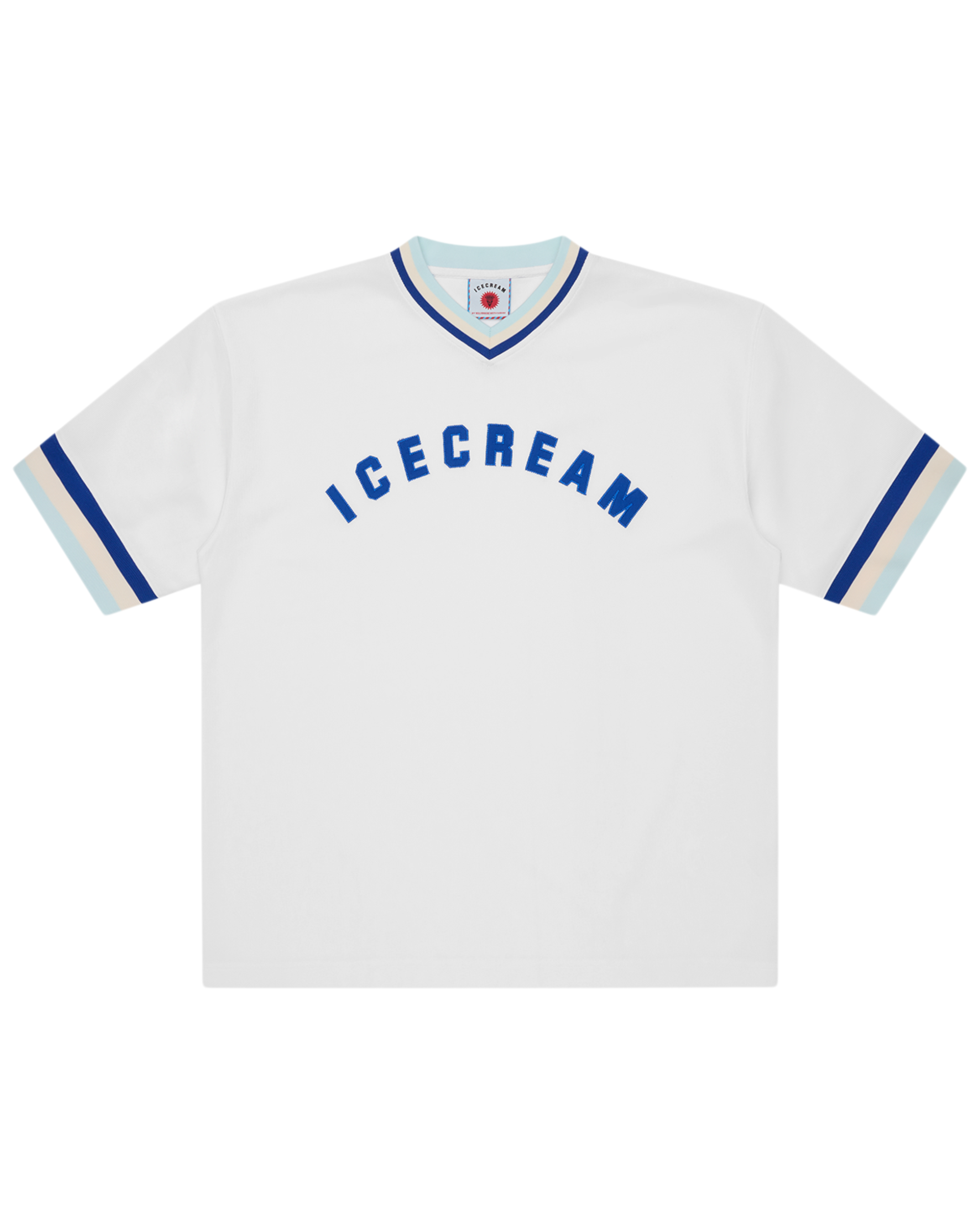 V-Neck Sports Jersey featuring a V-neckline and ICECREAM twill appliqué on the chest. finished with striped tape at the neck and sleeve hems.