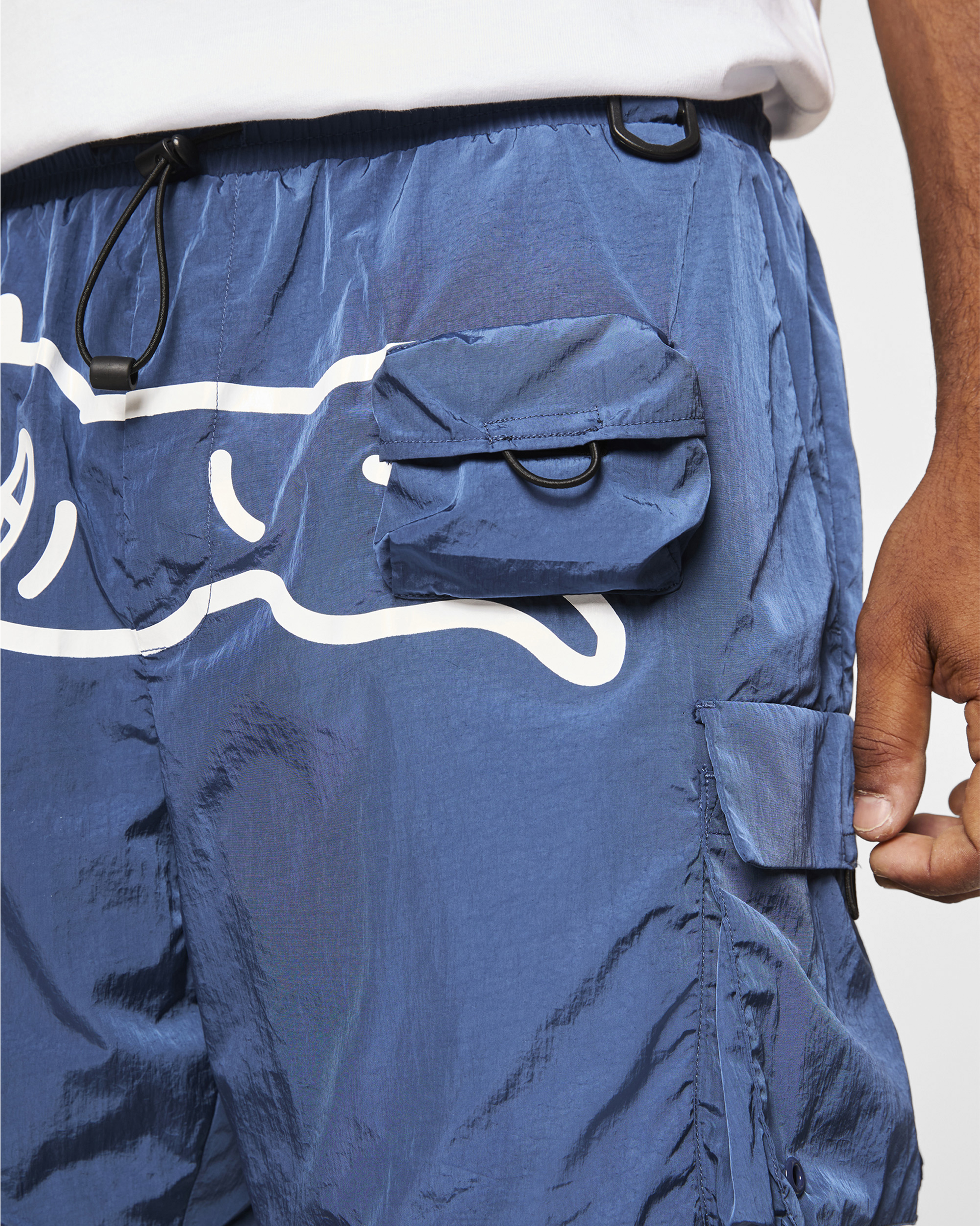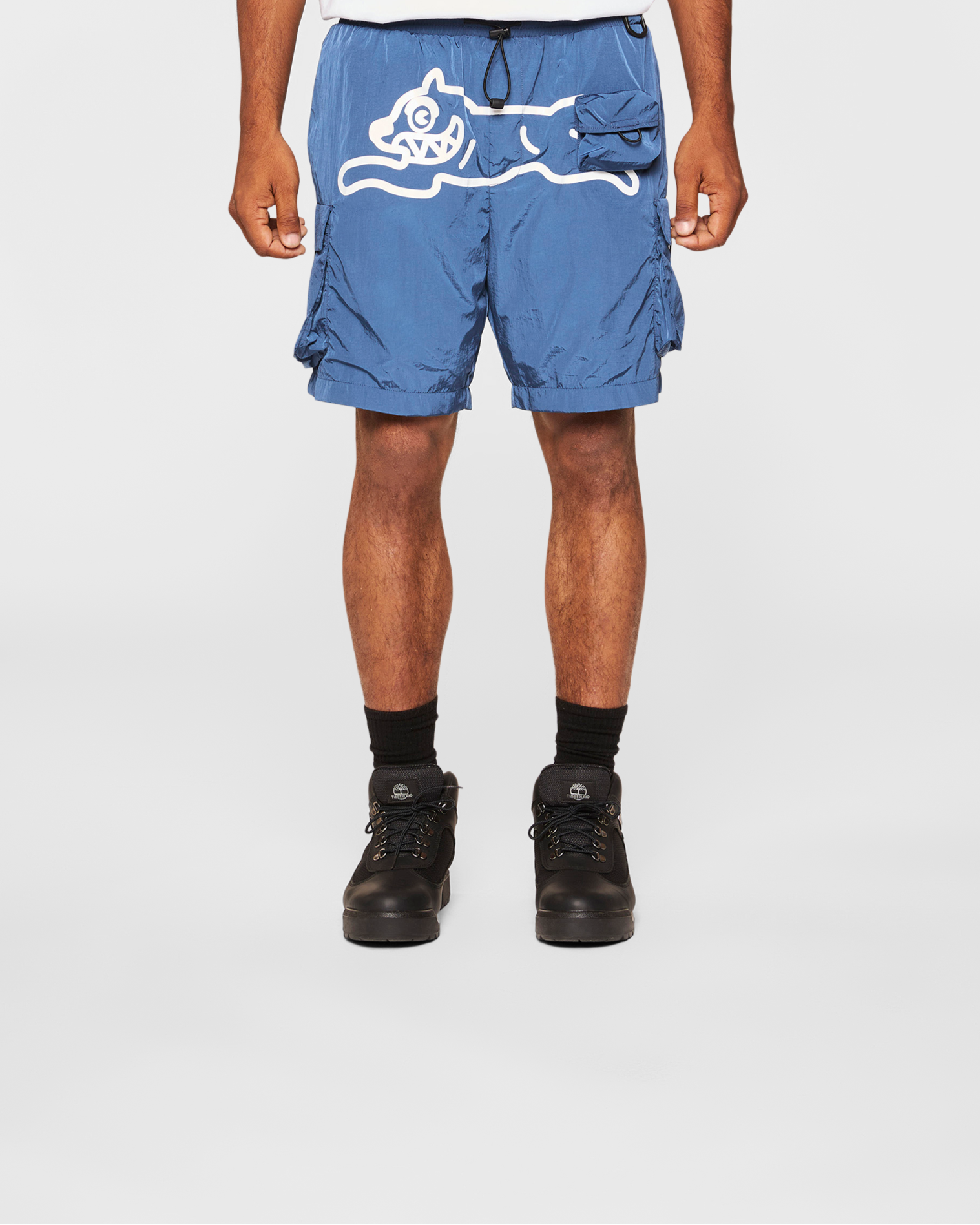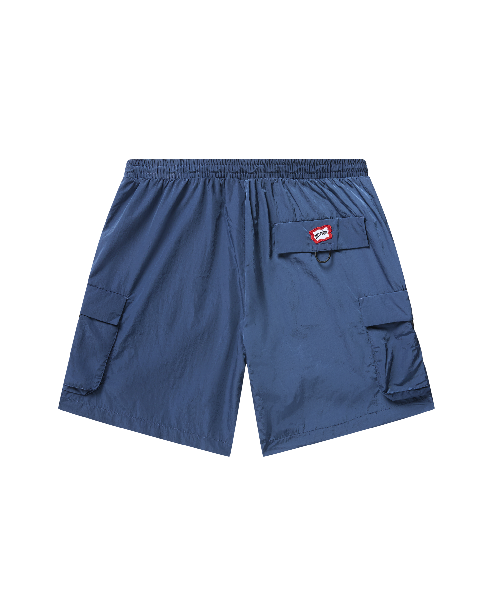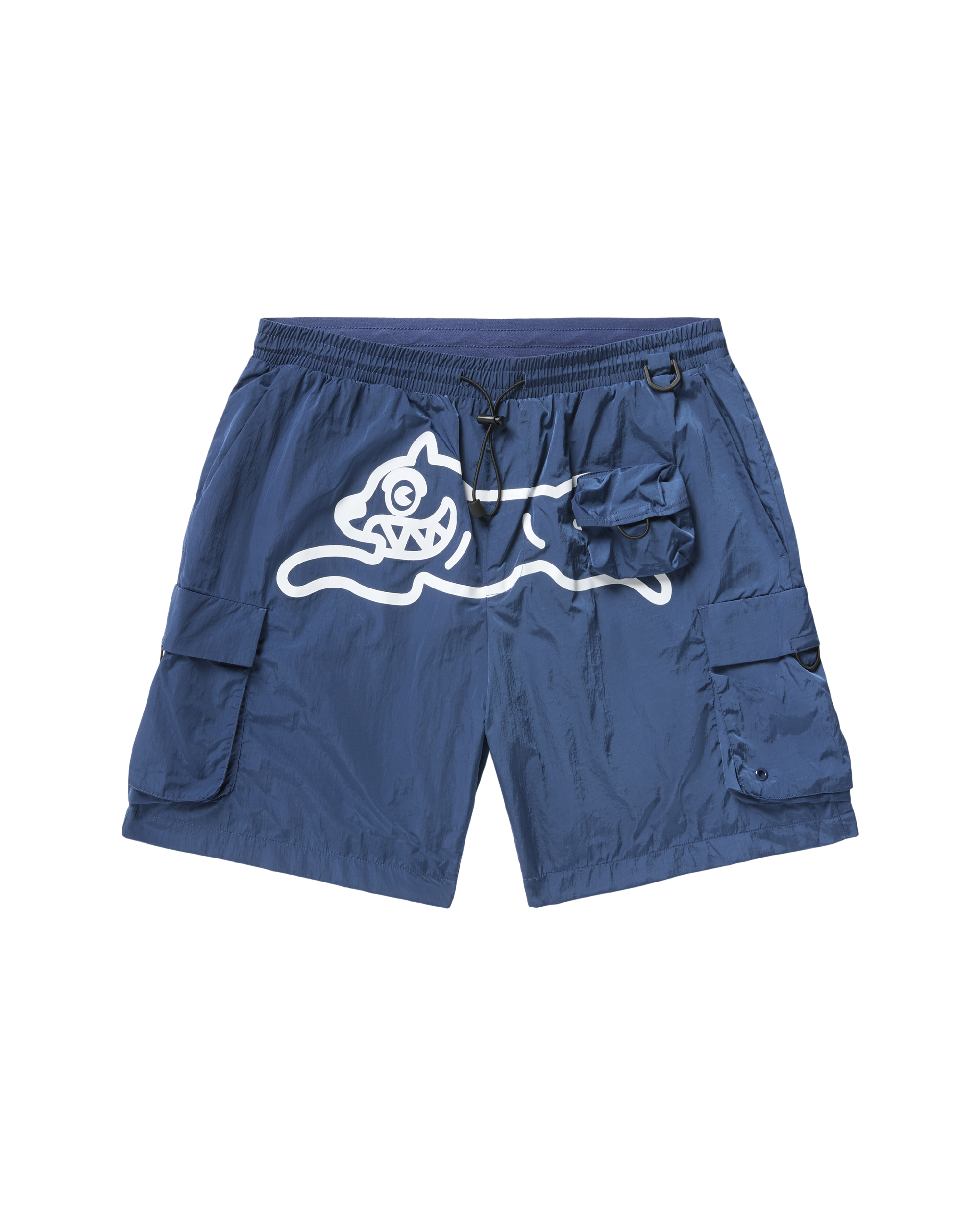 Nylon cargo shorts featuring a Running Dog graphic. mesh interior and pocket details.