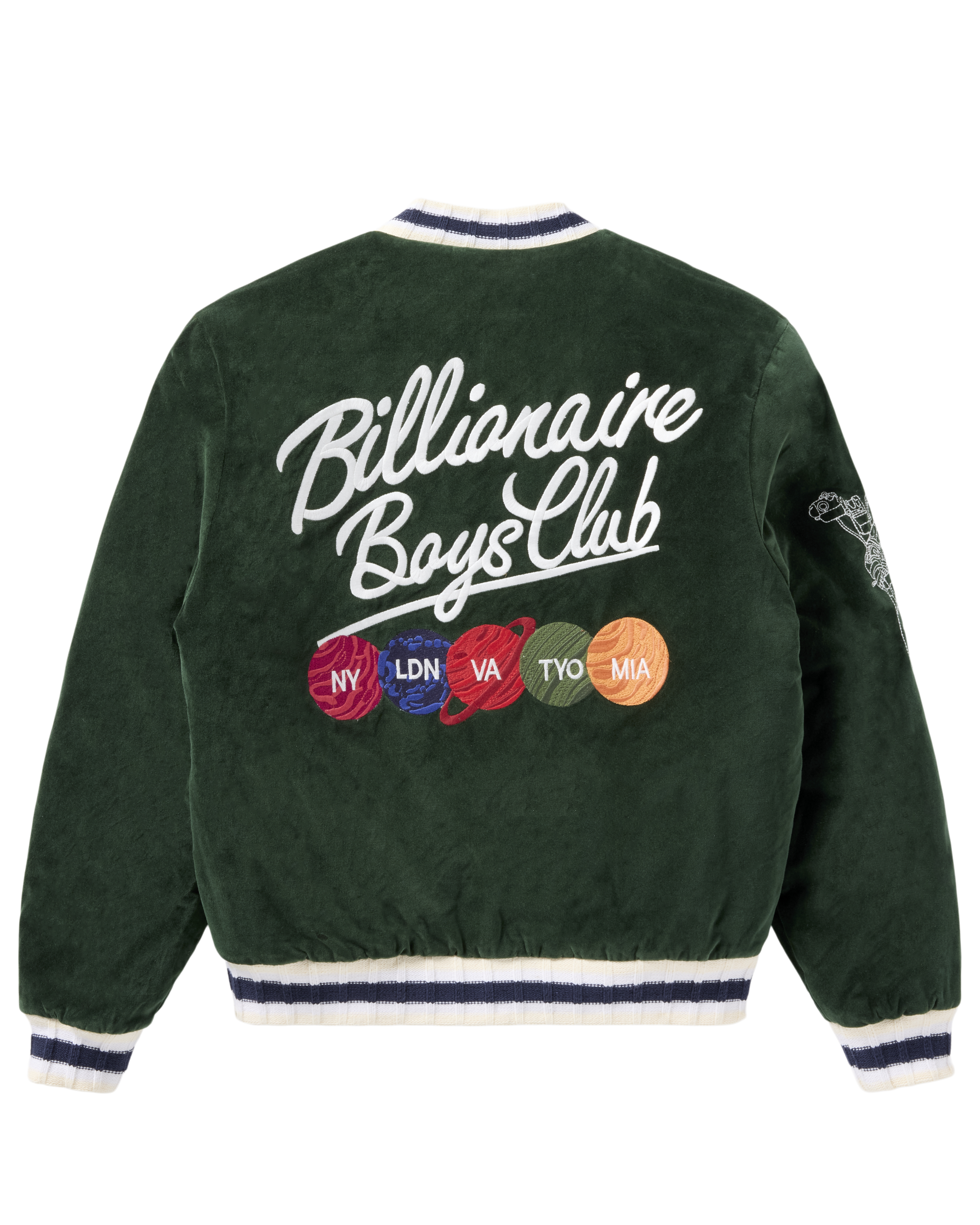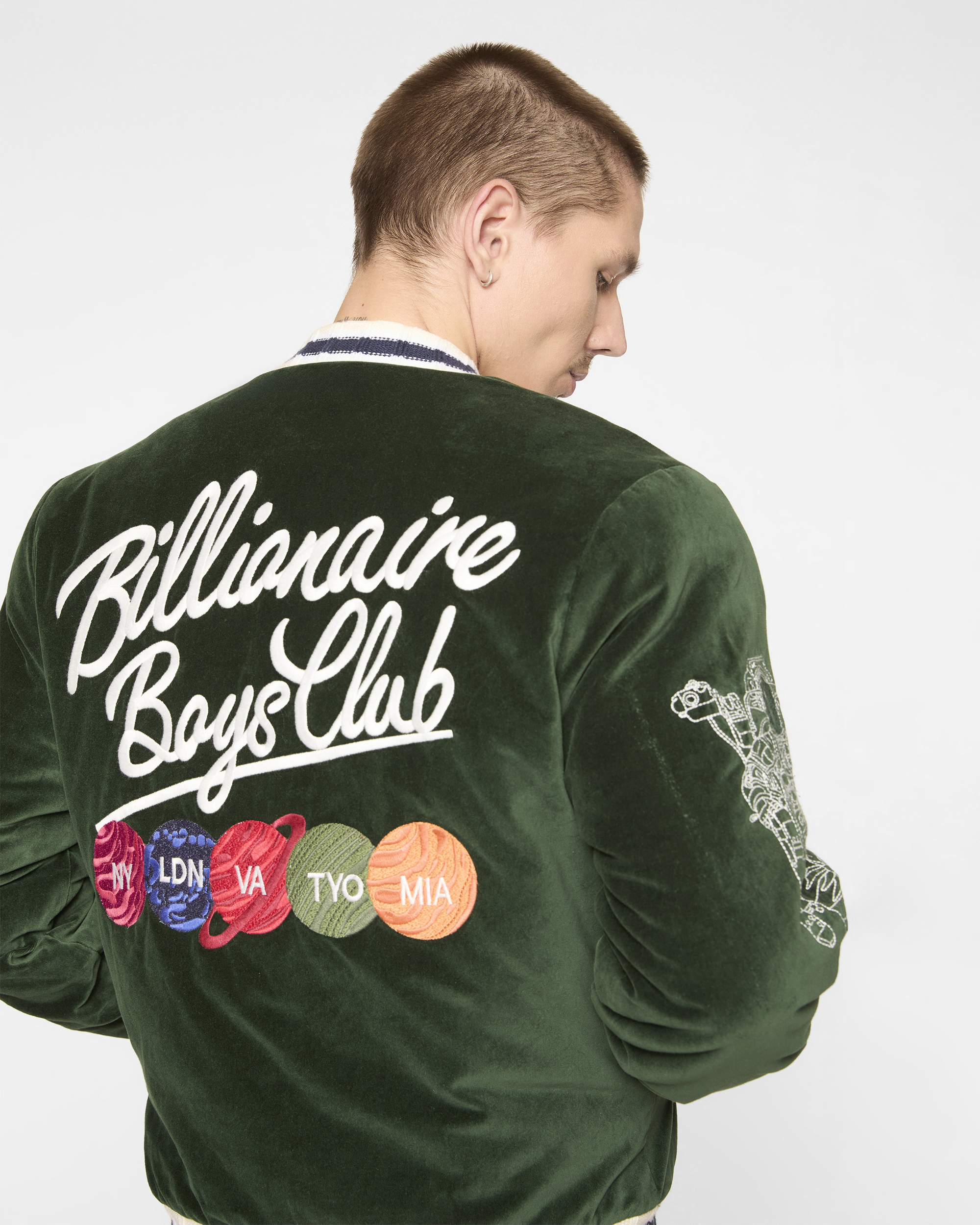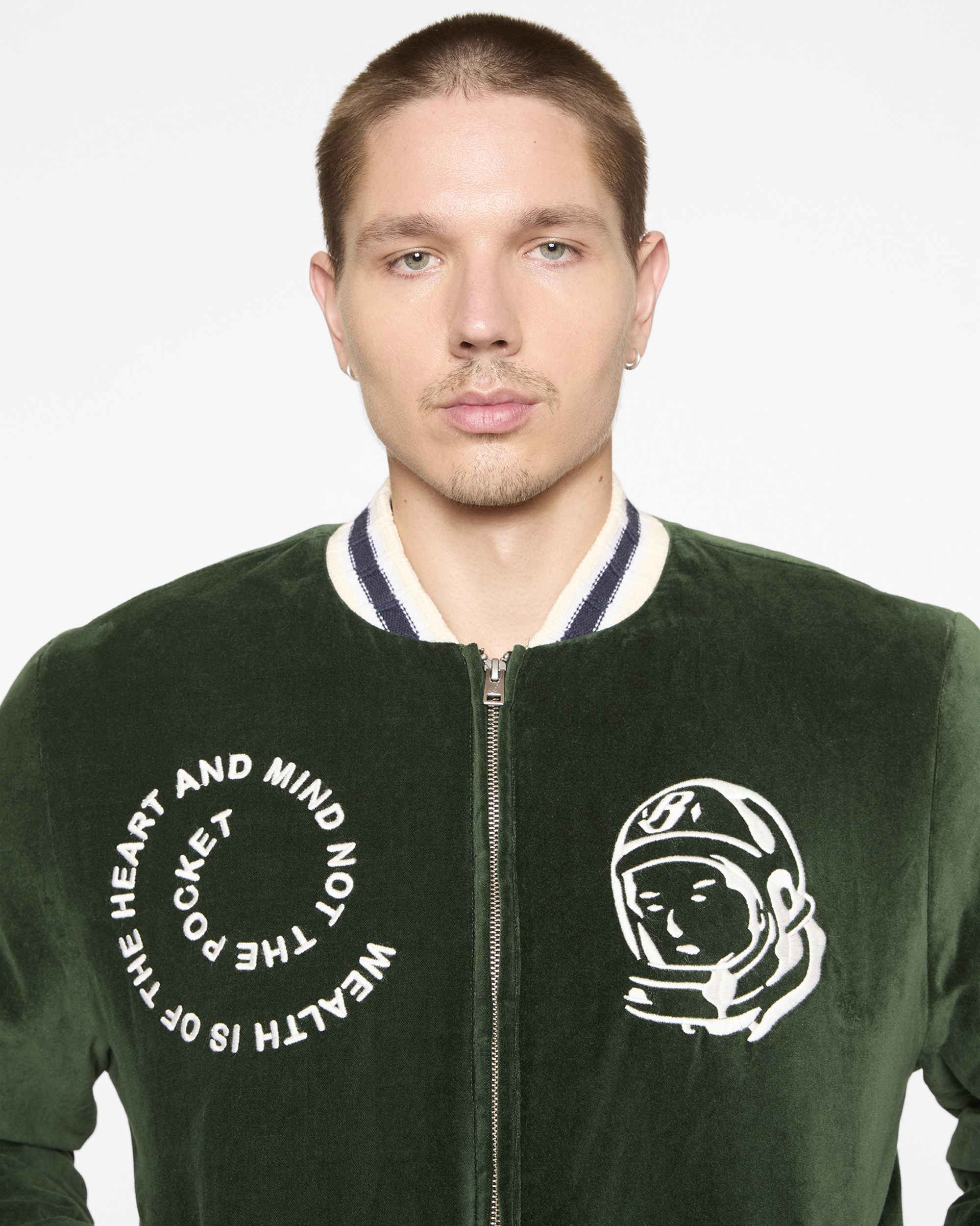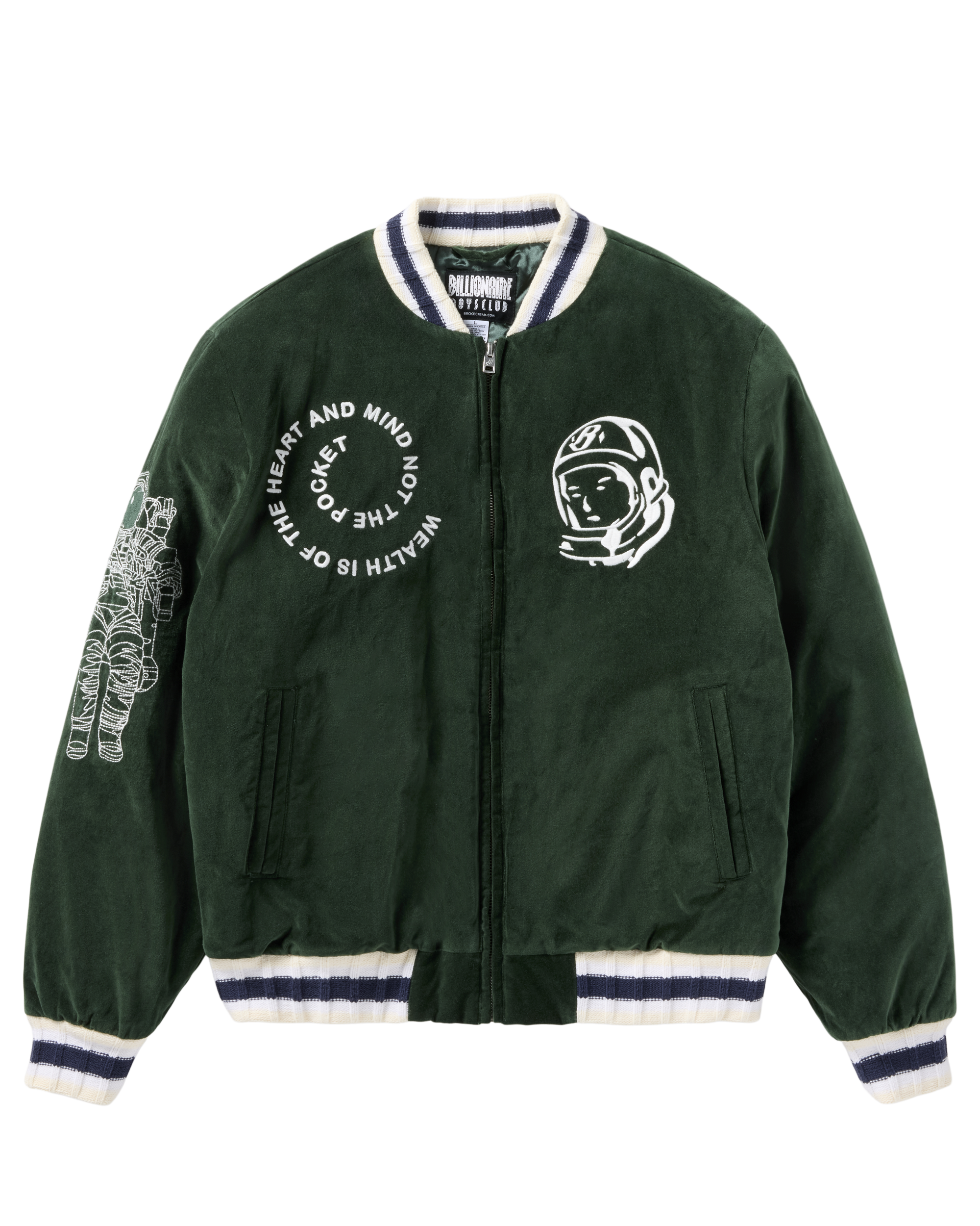 The Wealth Jacket features a ribbed collar. a zip closure. and signature embroidered graphics. including the Helmet head. an astronaut. and the Script logo.