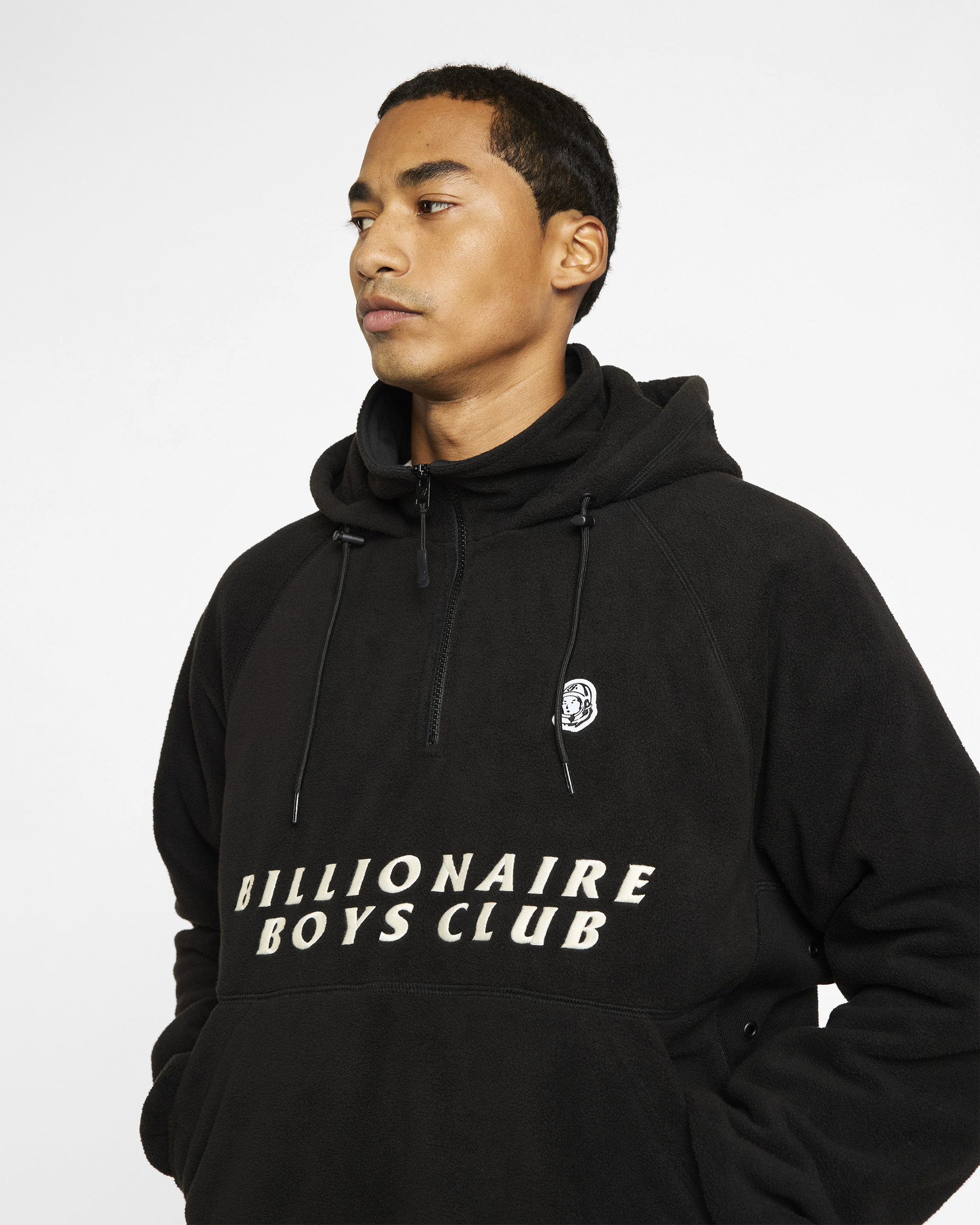 Fleece pullover jacket designed with embroidered Billionaire Boys Club logo across the chest and astronaut logo patch at front.