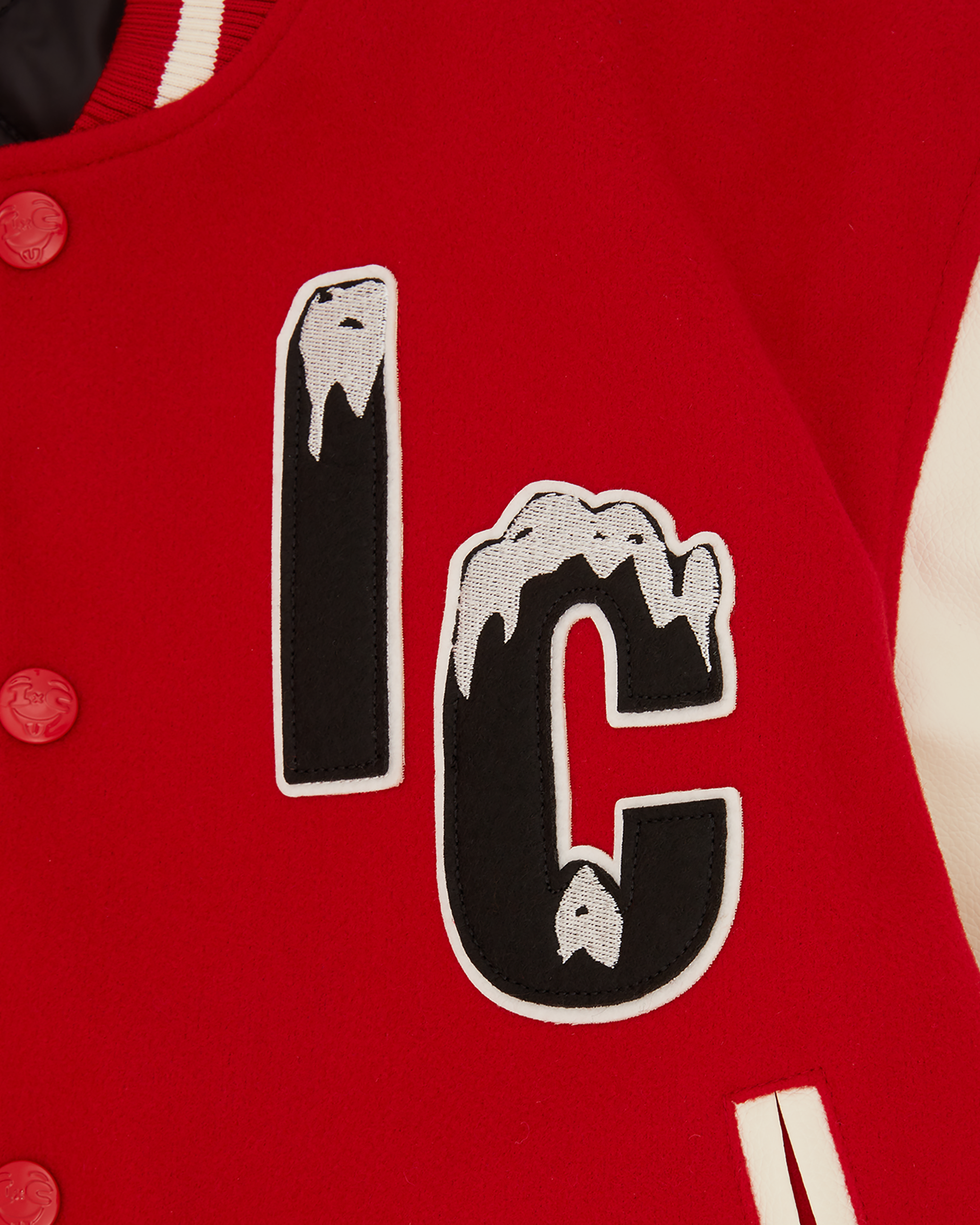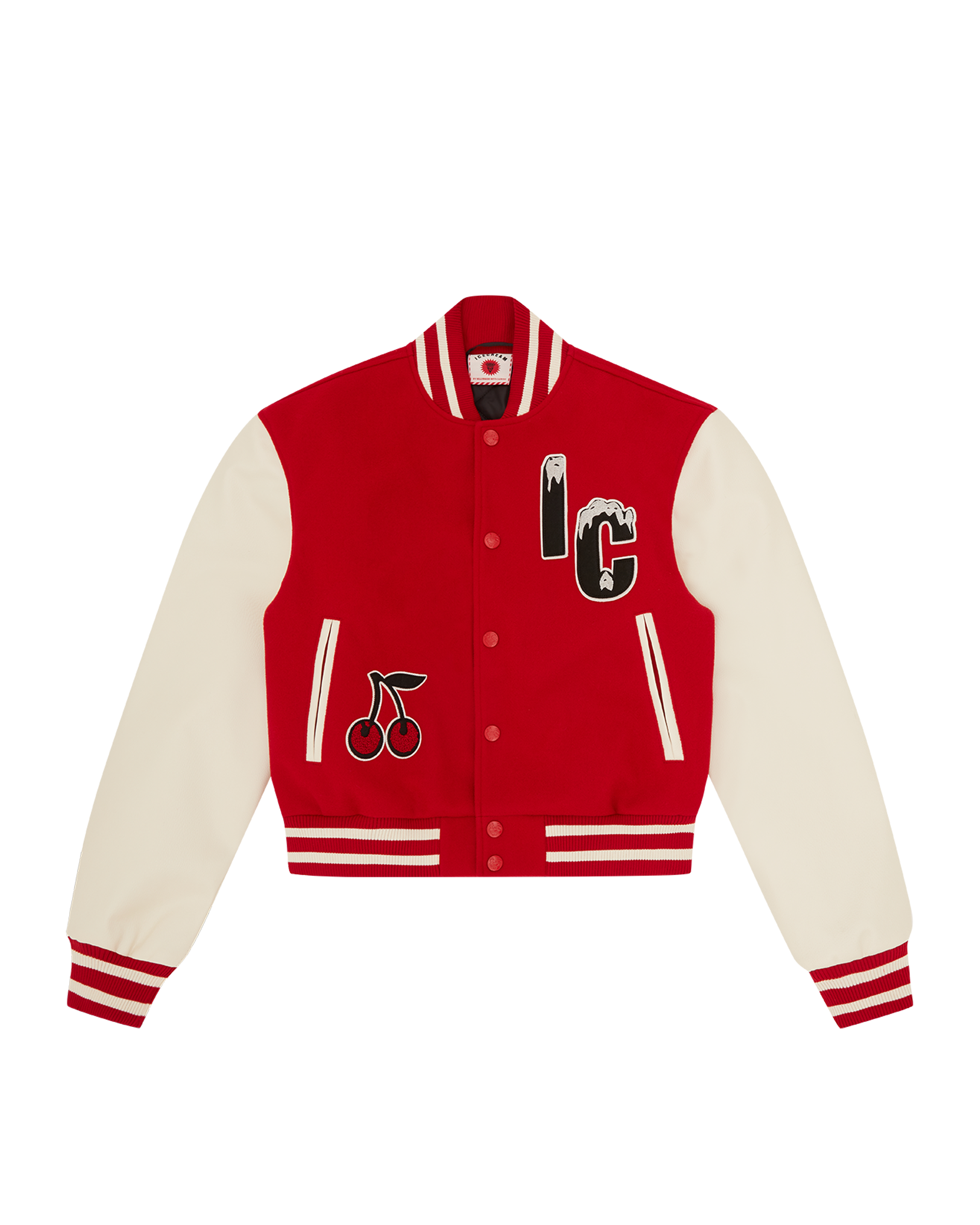 Cherry Varsity Jacket featuring a drippy IC felt patch with embroidery on the front. a chenille cherry patch on the lower front right. and sleek faux leather sleeves. Finished with an embroidered ICECREAM logo and bold cherry graphic on the back for a statement-making look.