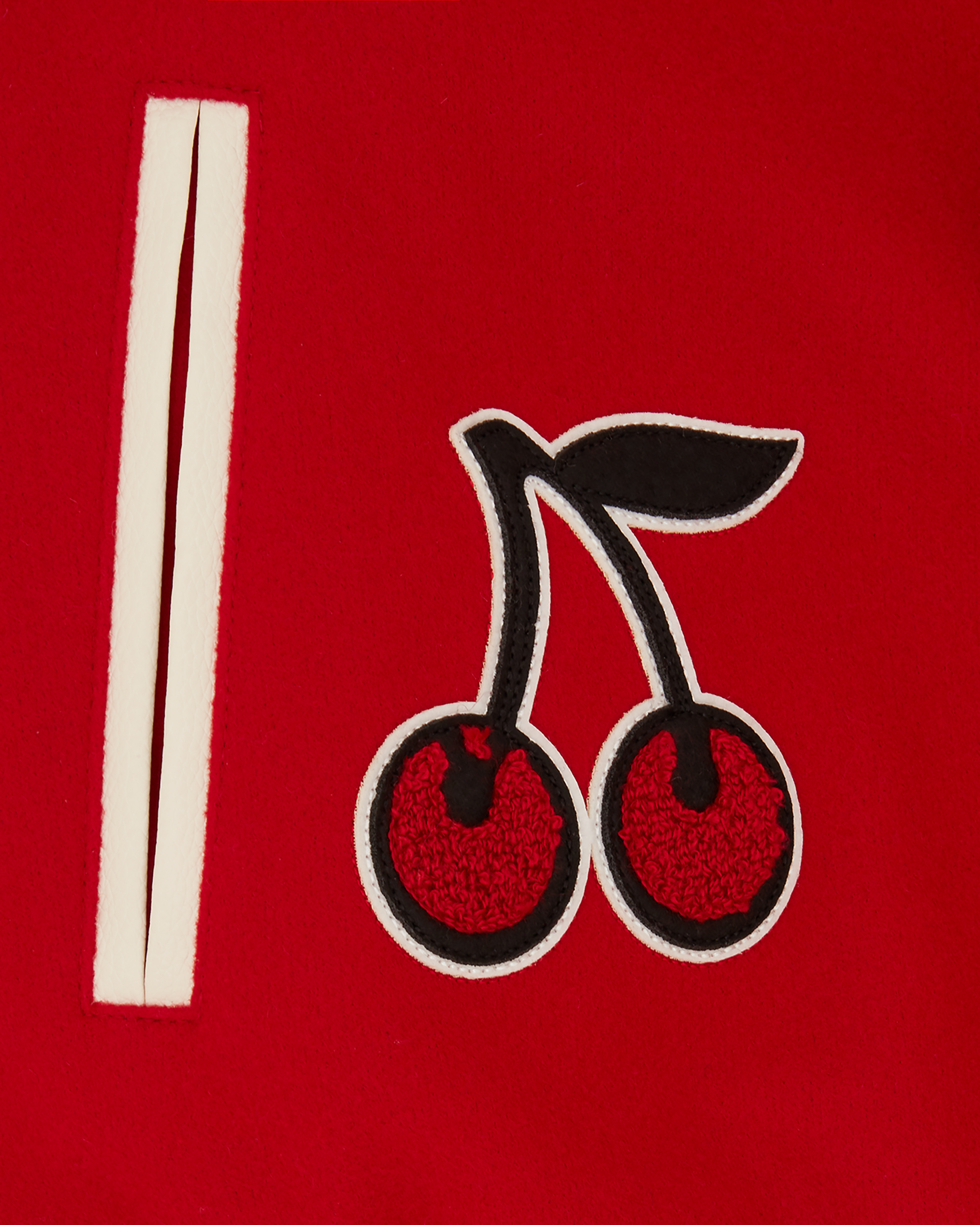 • Chenille cherry patch on the lower front right