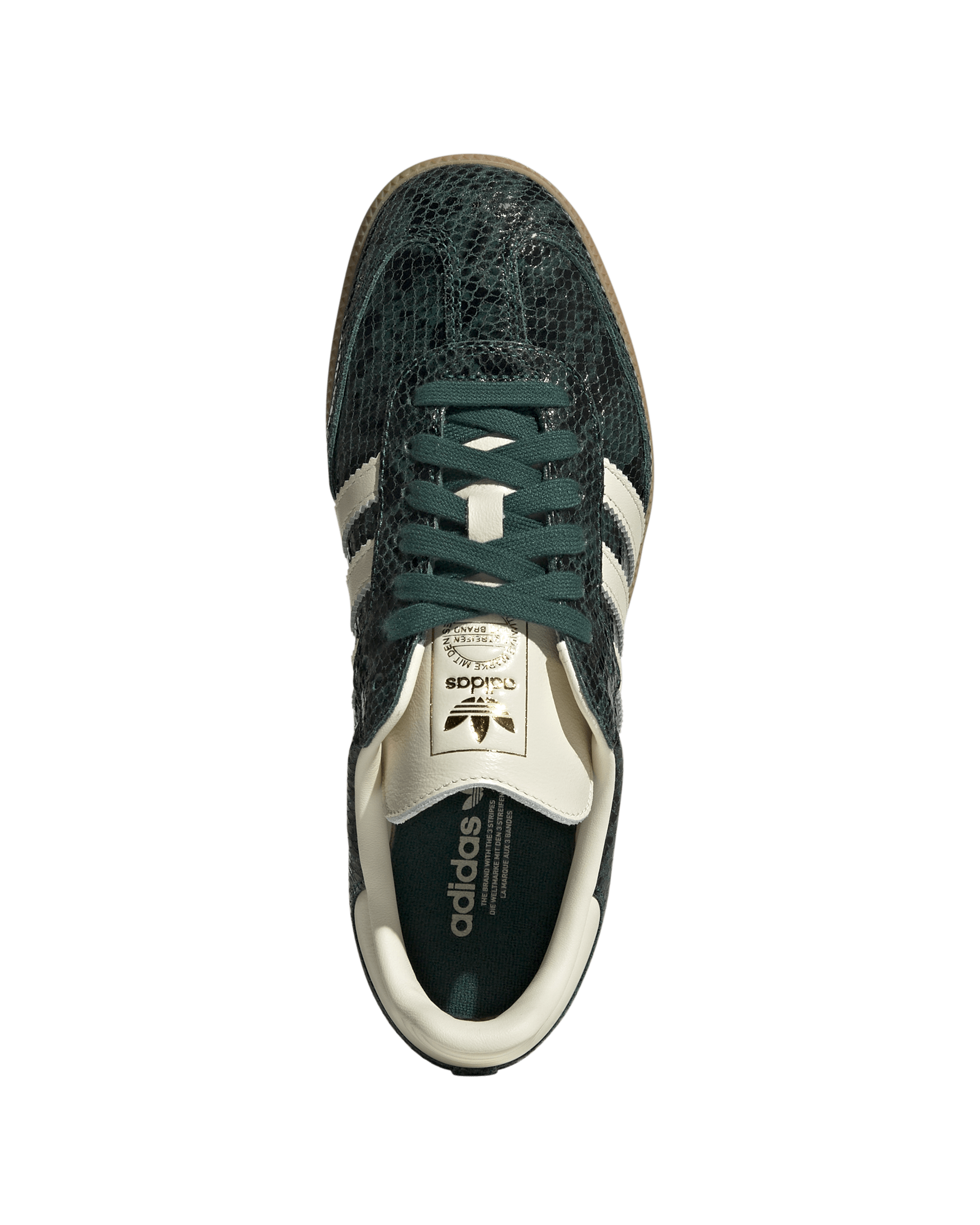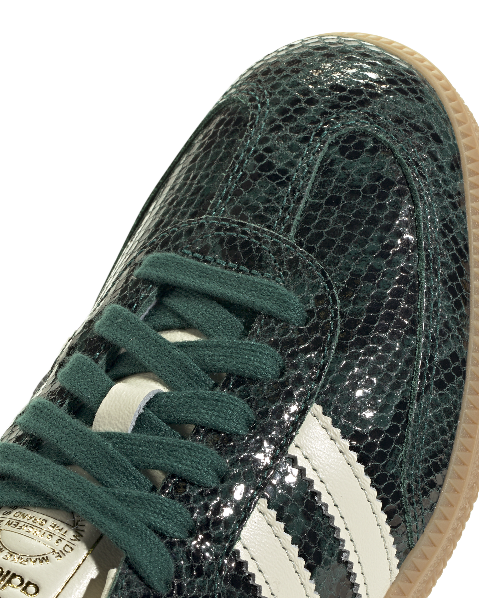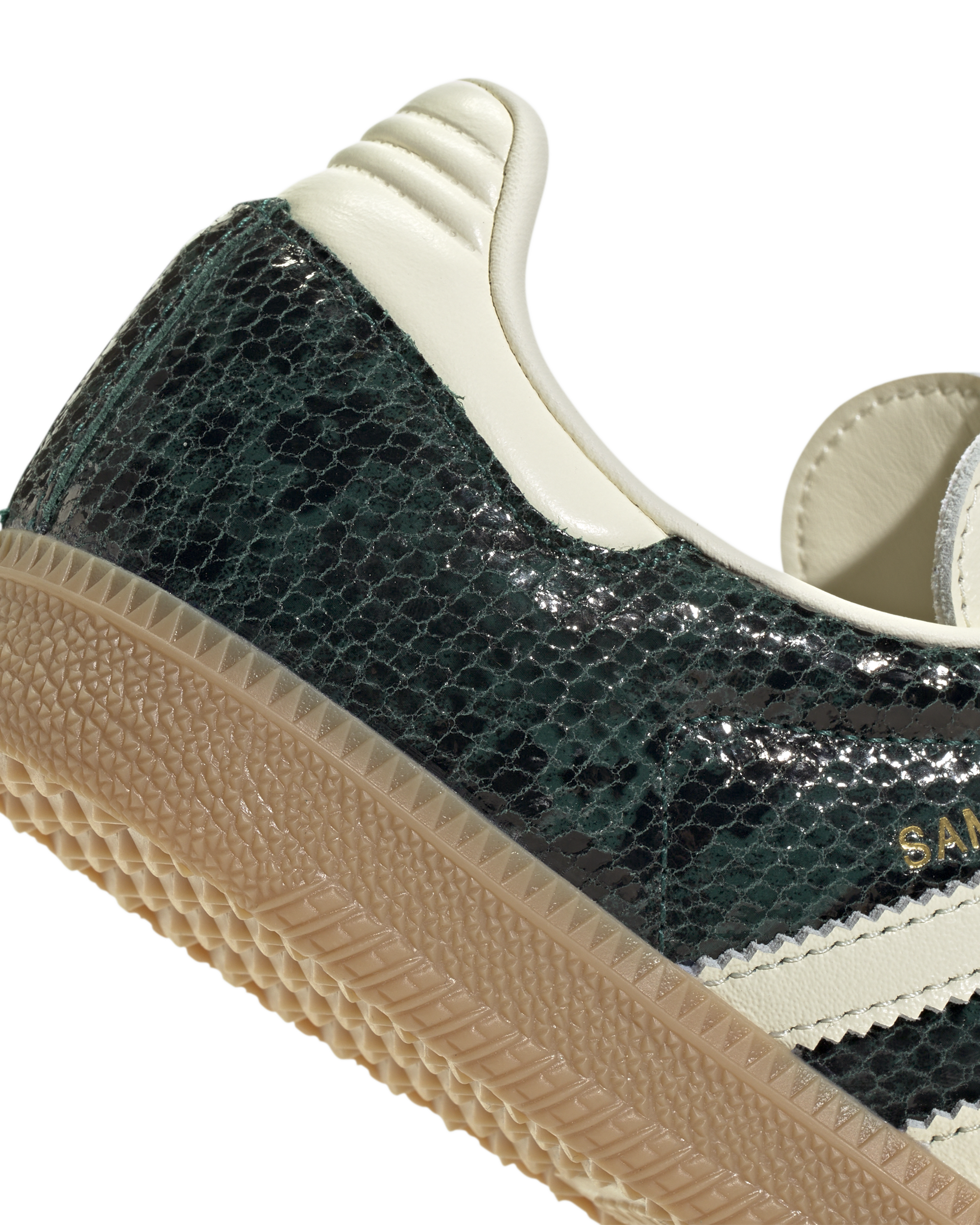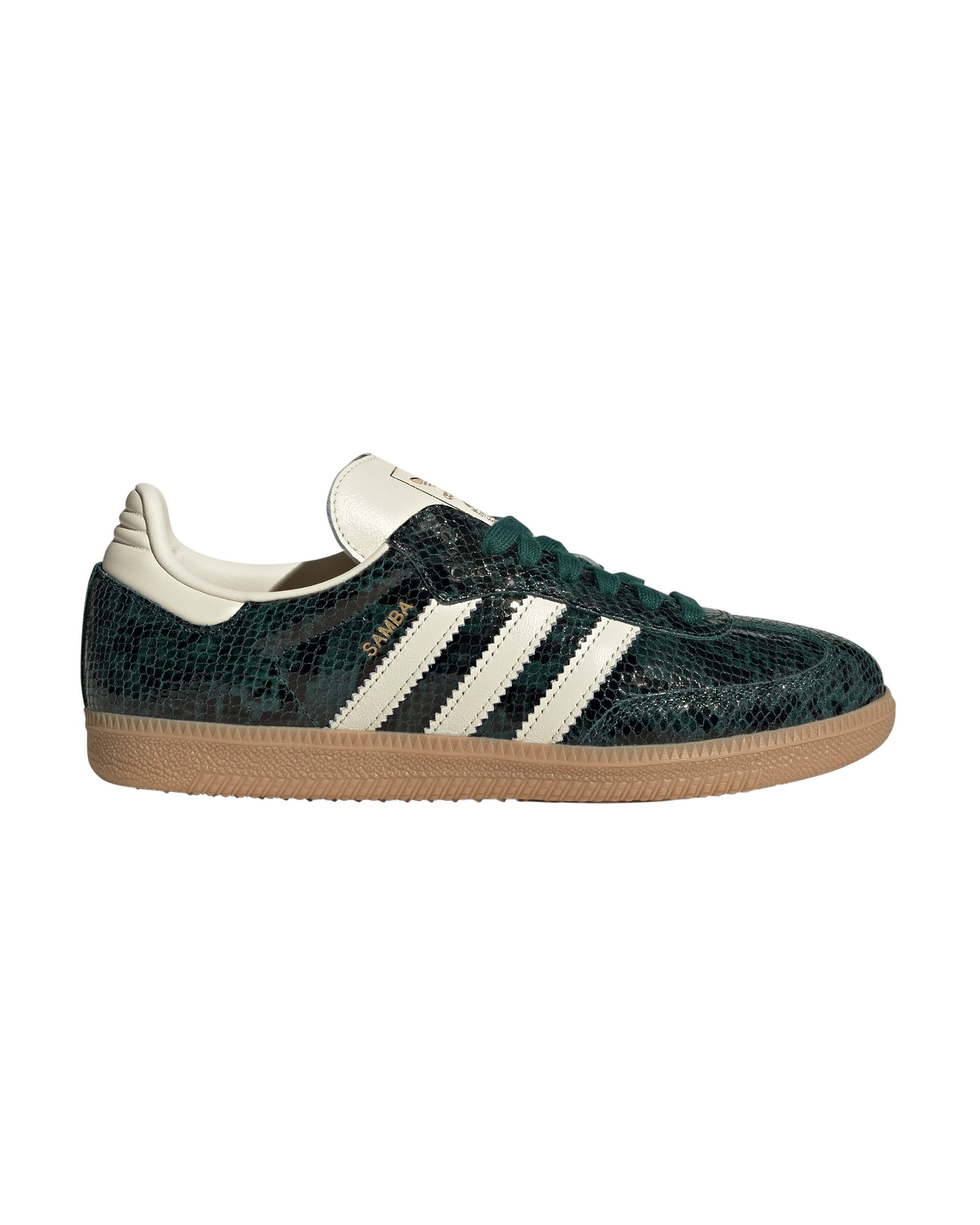 These Womens Samba OG feature a snakeskin-look leather upper and overlays for a modern twist on a classic design. The gum rubber outsole. reinforced T-toe. and serrated 3-Stripes preserve its original sporty feel.